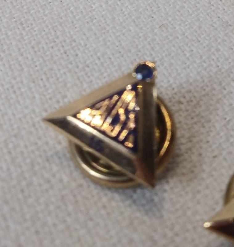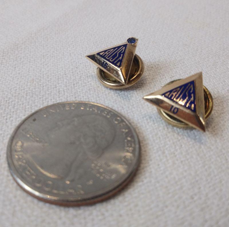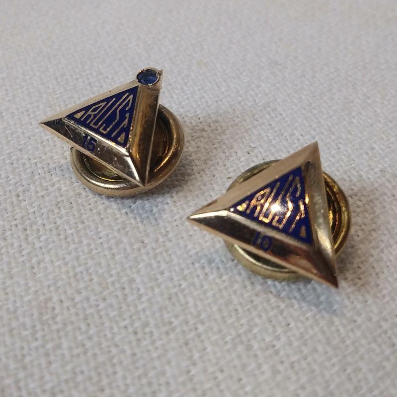 Pair of marked 10K gold service pins from Rust Corporation. One 10 year, .051 ozt, One 15 year with Sapphire stone .054 ozt with stone. Weight was taken from the pin only without the screw backing. Both are in very good condition. Reserve Price $50.