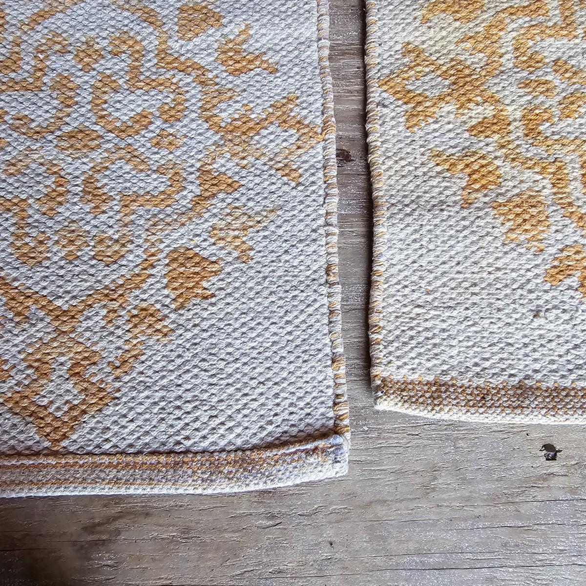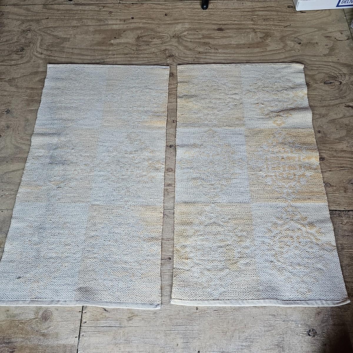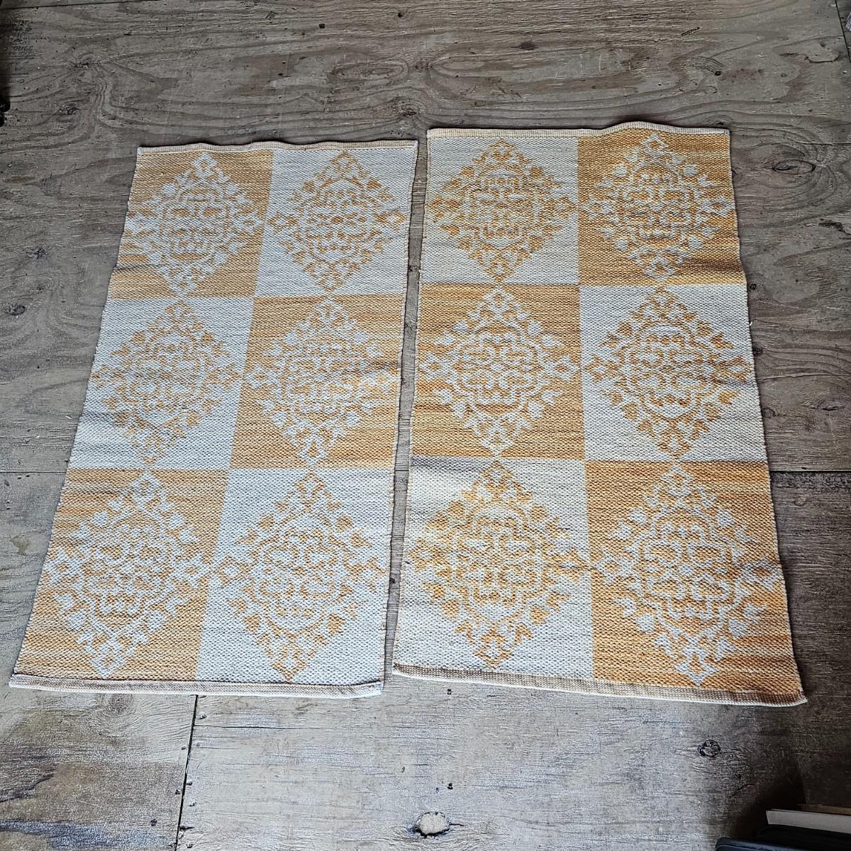 Two gold and tan rugs with alternating medallion designs. Rugs appear to be woven of cotton, measure 24" x 44" each. Small dark patch on back of one item, see photos for details. Shipping available.