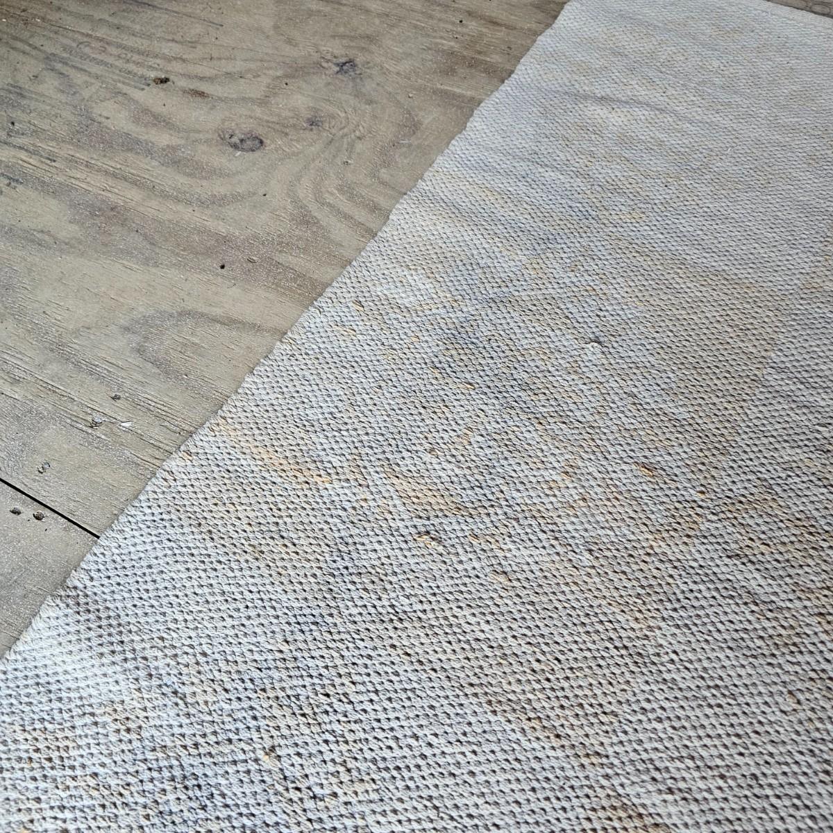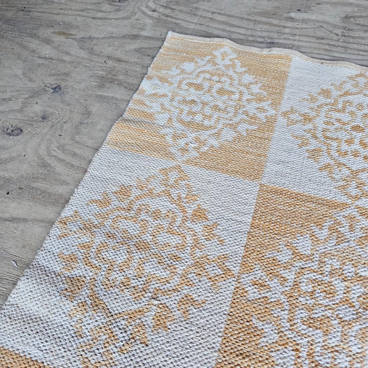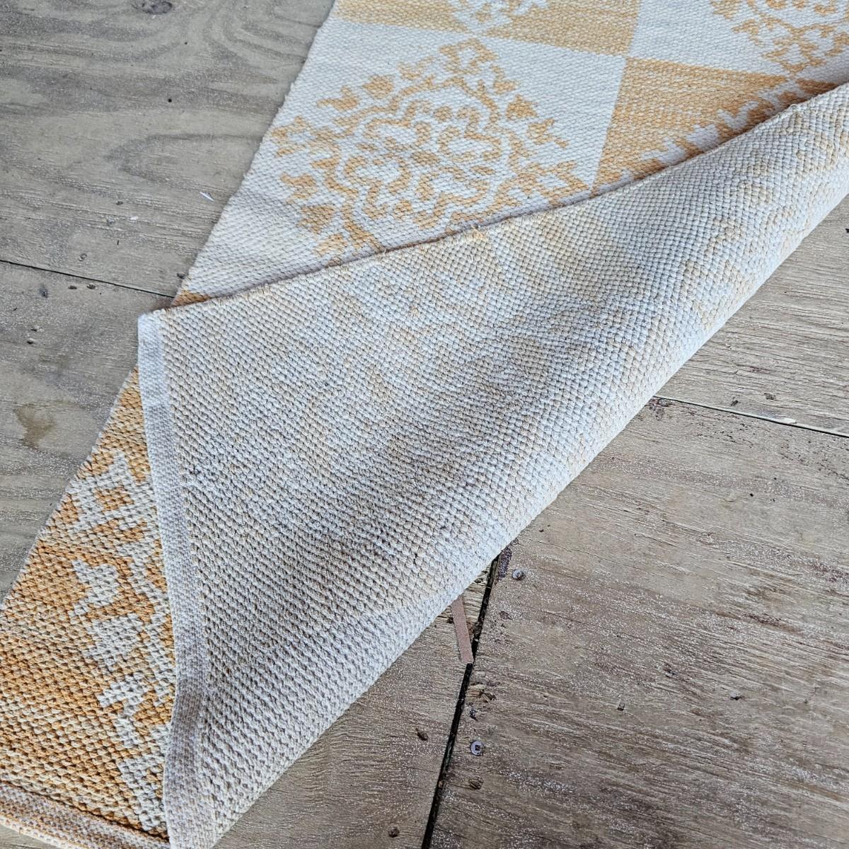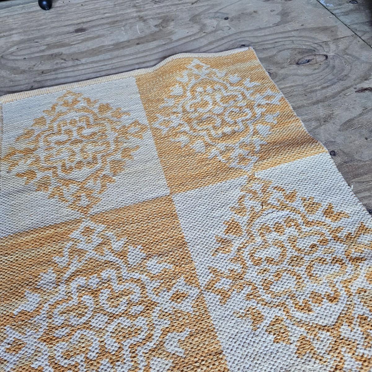 Two gold and tan rugs with alternating medallion designs. Rugs appear to be woven of cotton, measure 24" x 44" each. Small dark patch on back of one item, see photos for details. Shipping available.