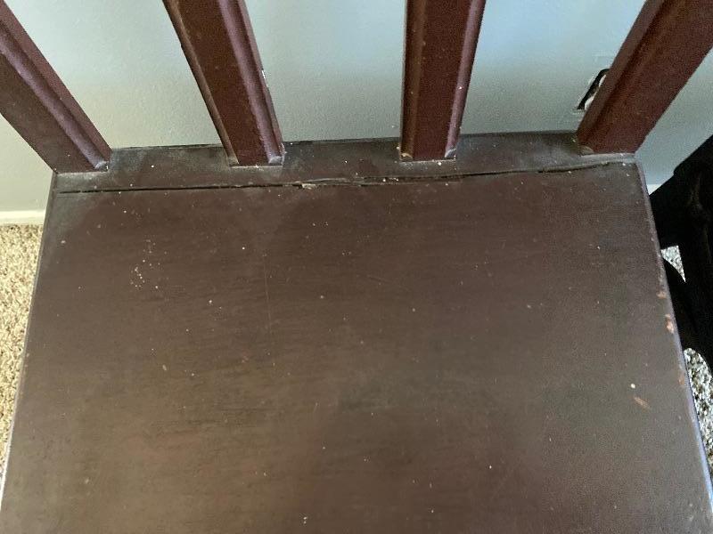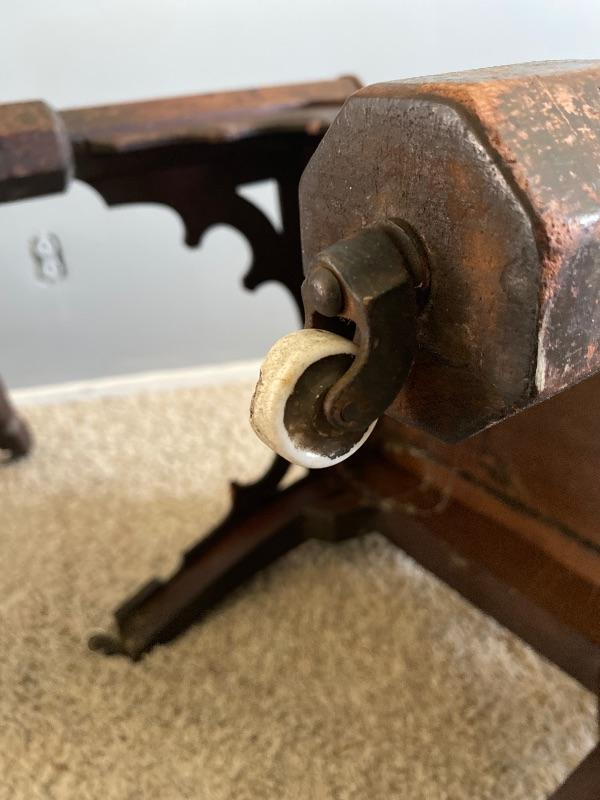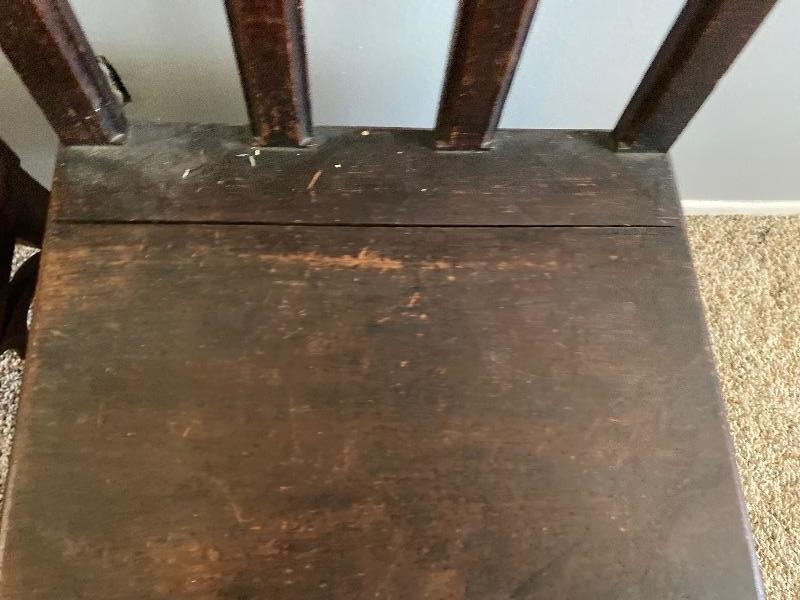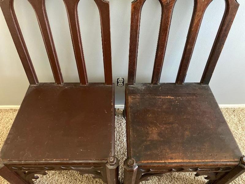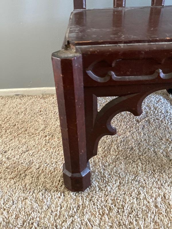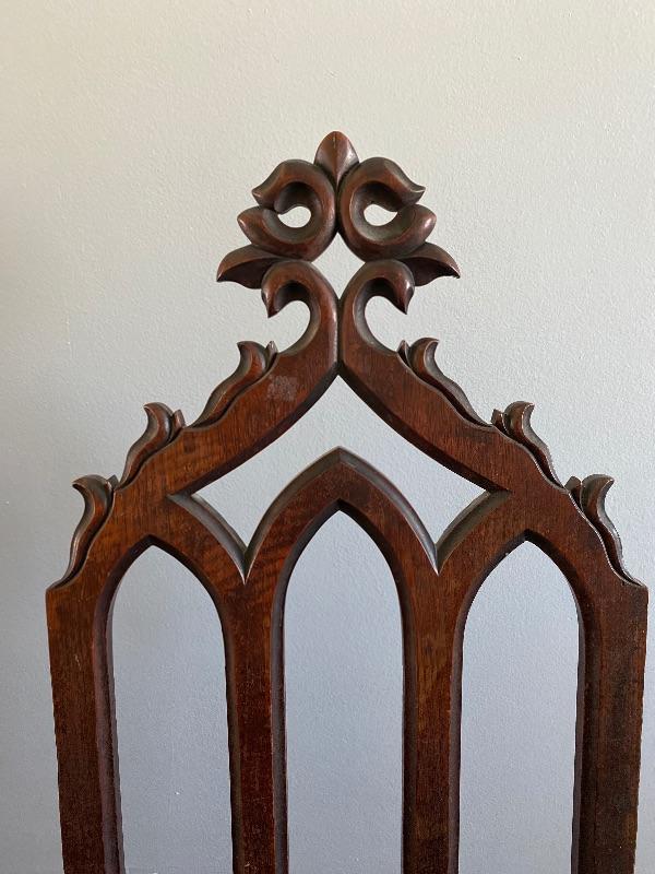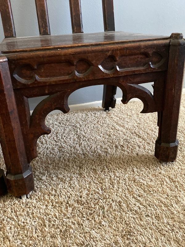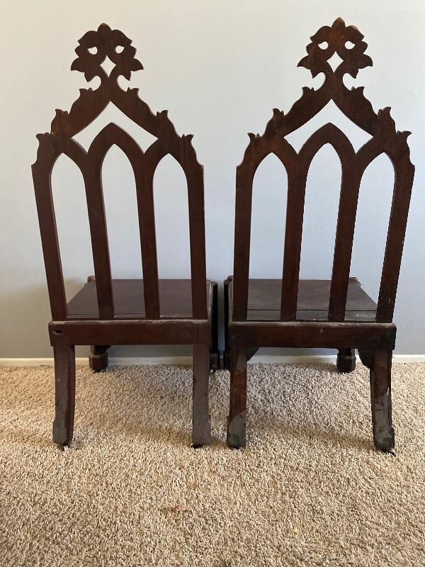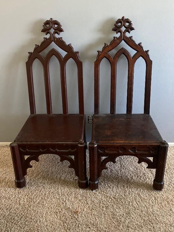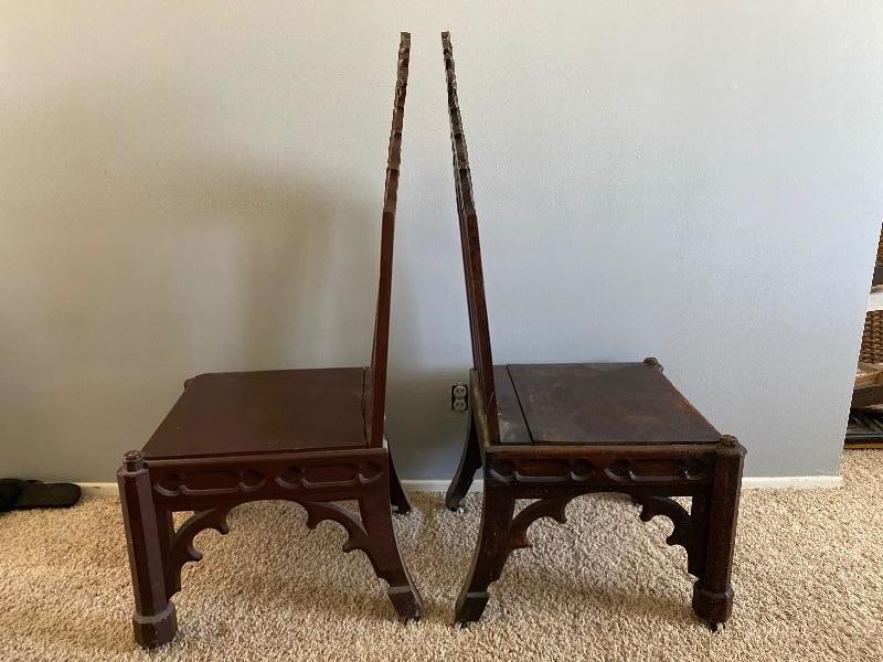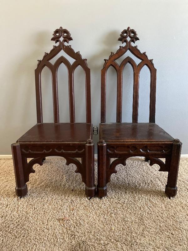 Pair of wood Gothic Church Chairs. Wide 19" seats. Missing a couple trim pieces, loose leg joints. On wheels. Back measures about 45" tall. Show their age but have great potential with a little work and a coat of paint. Pick up for these chairs will be in Garden Grove.