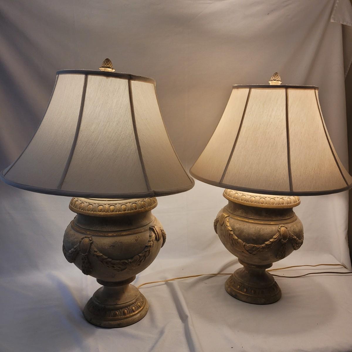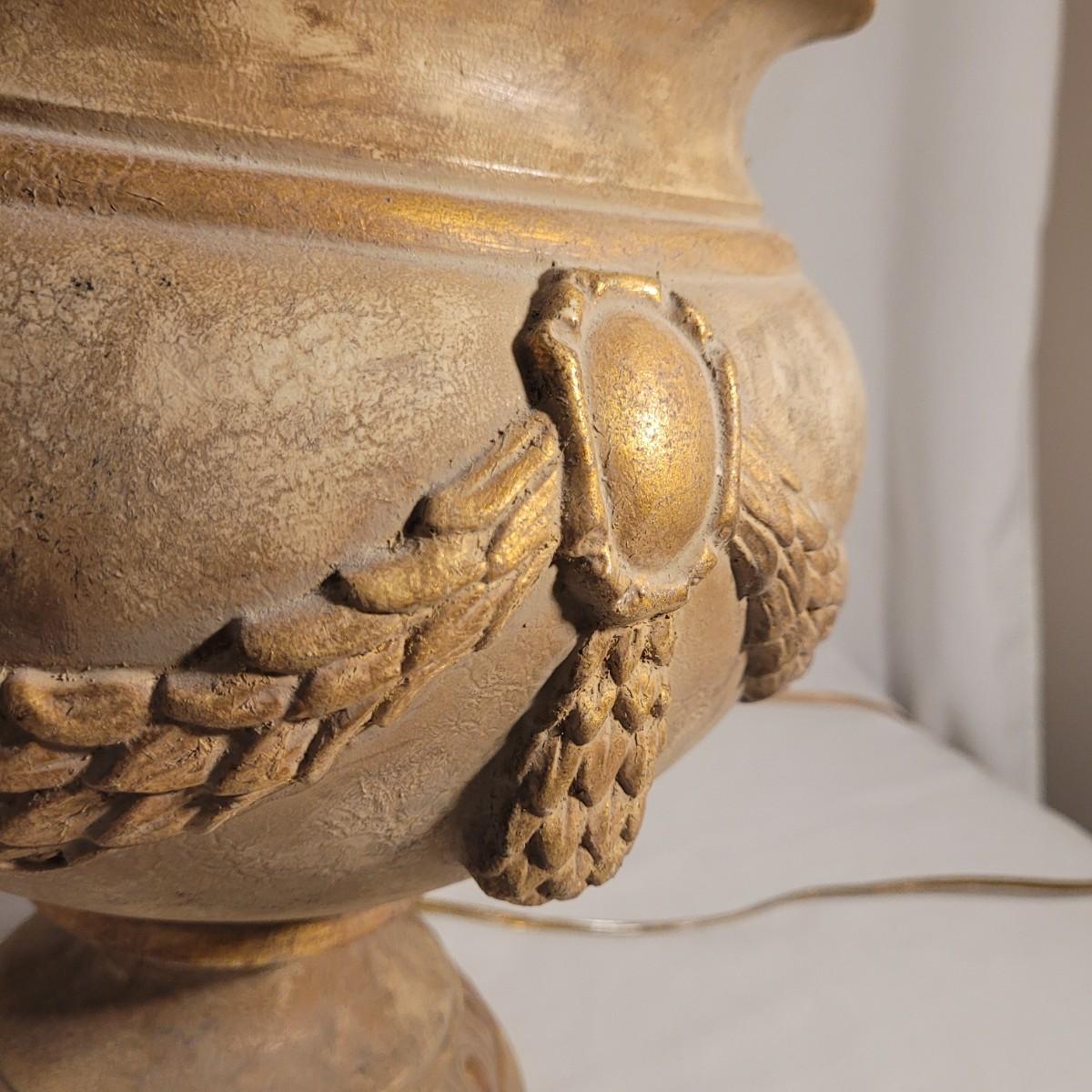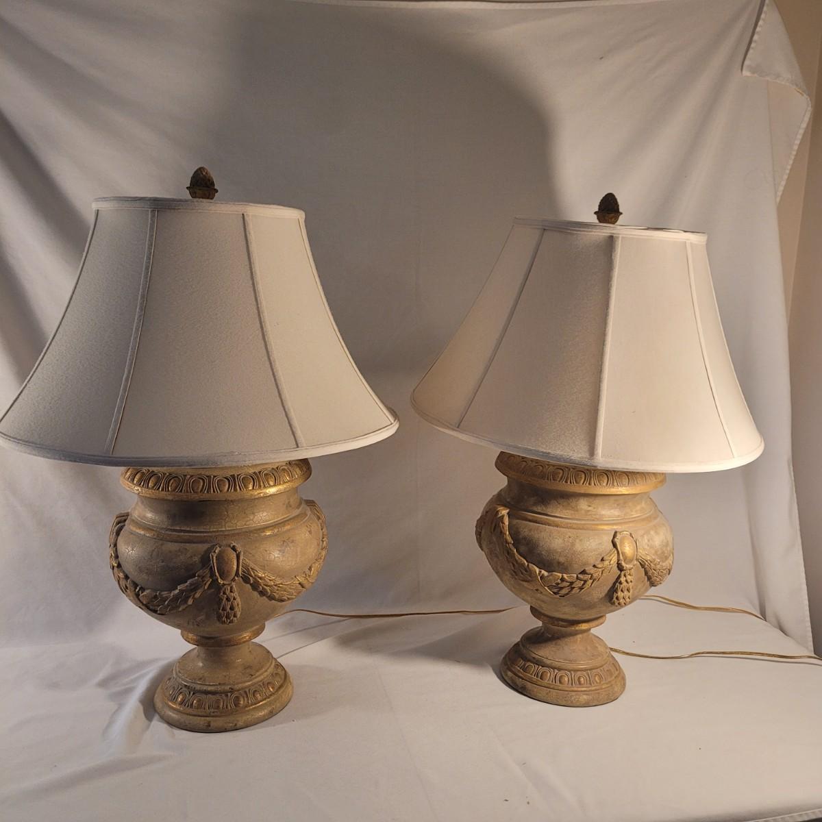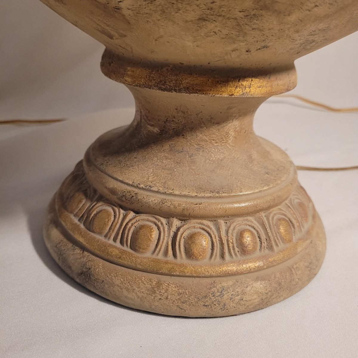 This pair of classic Greek style table lamps has a soft cream base with gold overlay. Lamps have on off switch and are made of resin.