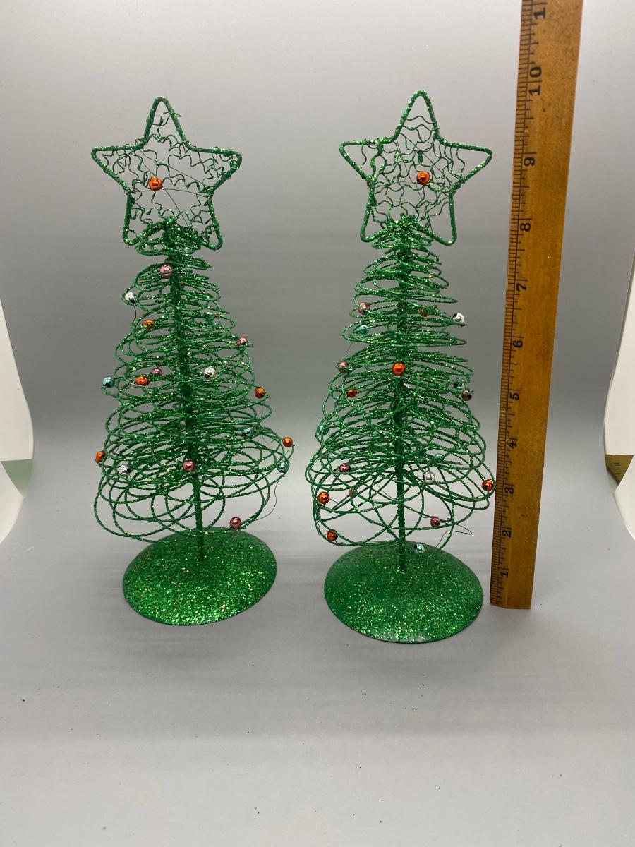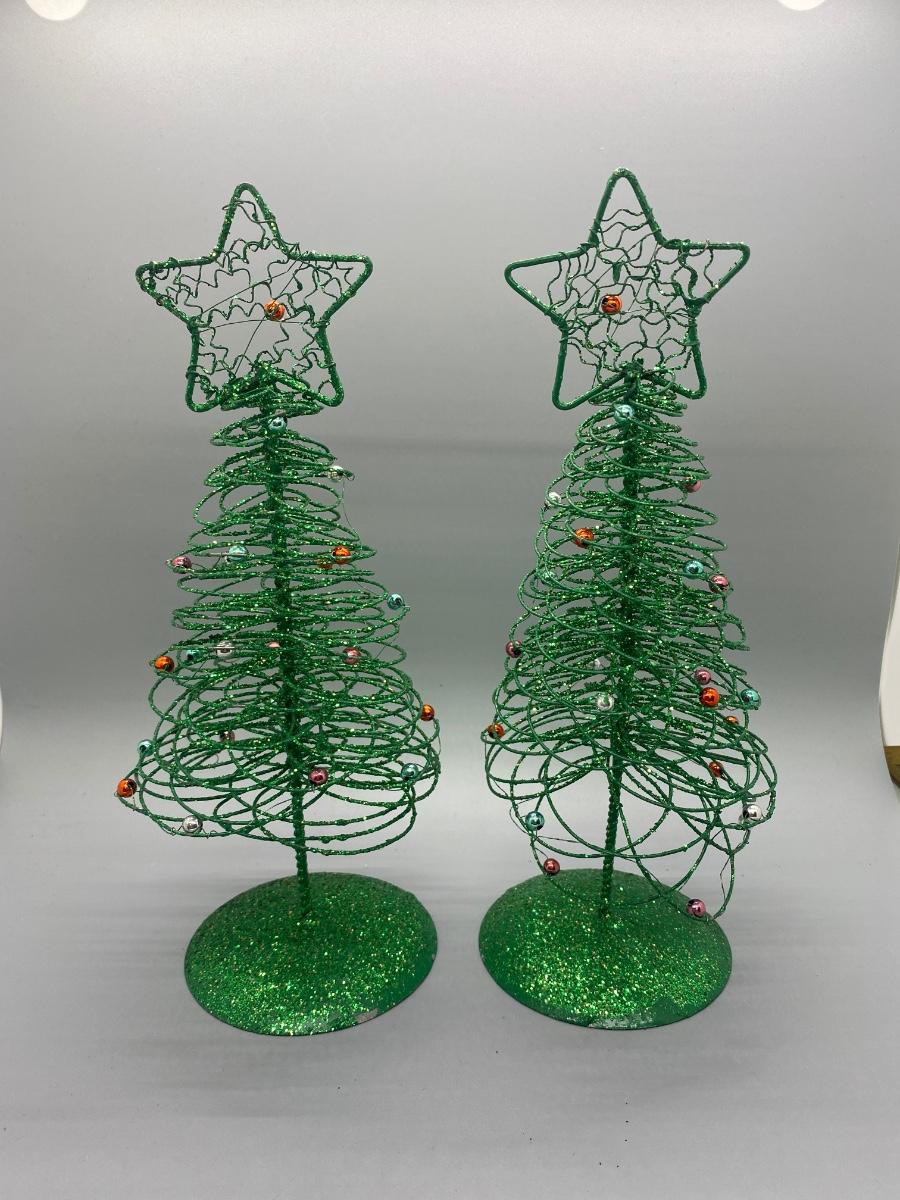 Pair of Green Glitter Springy Metal Christmas Tree Holiday Decor