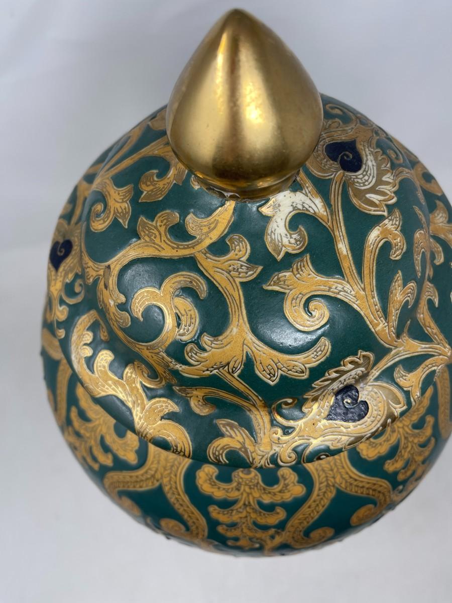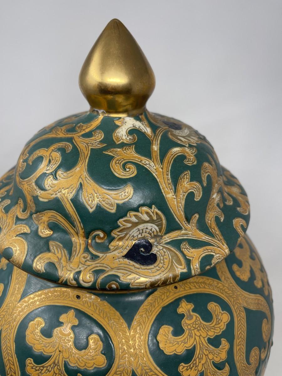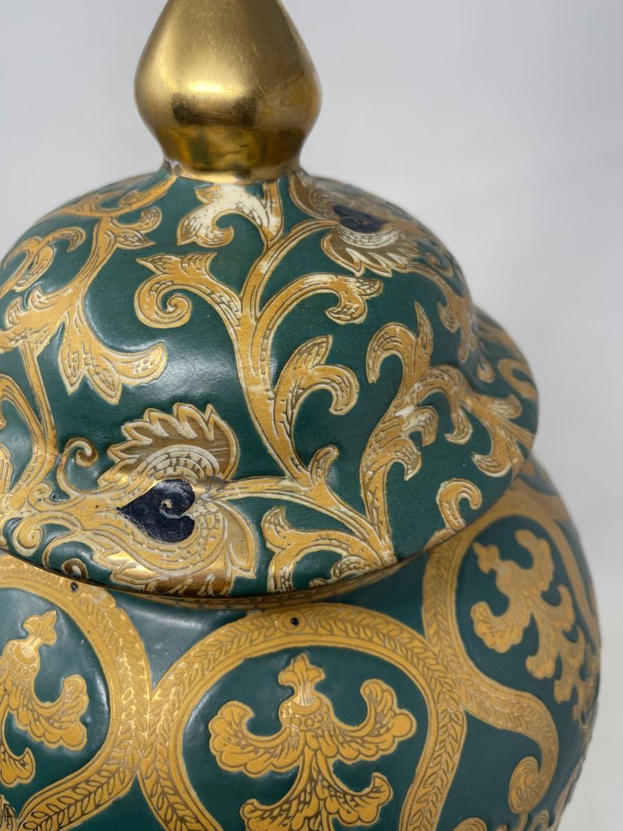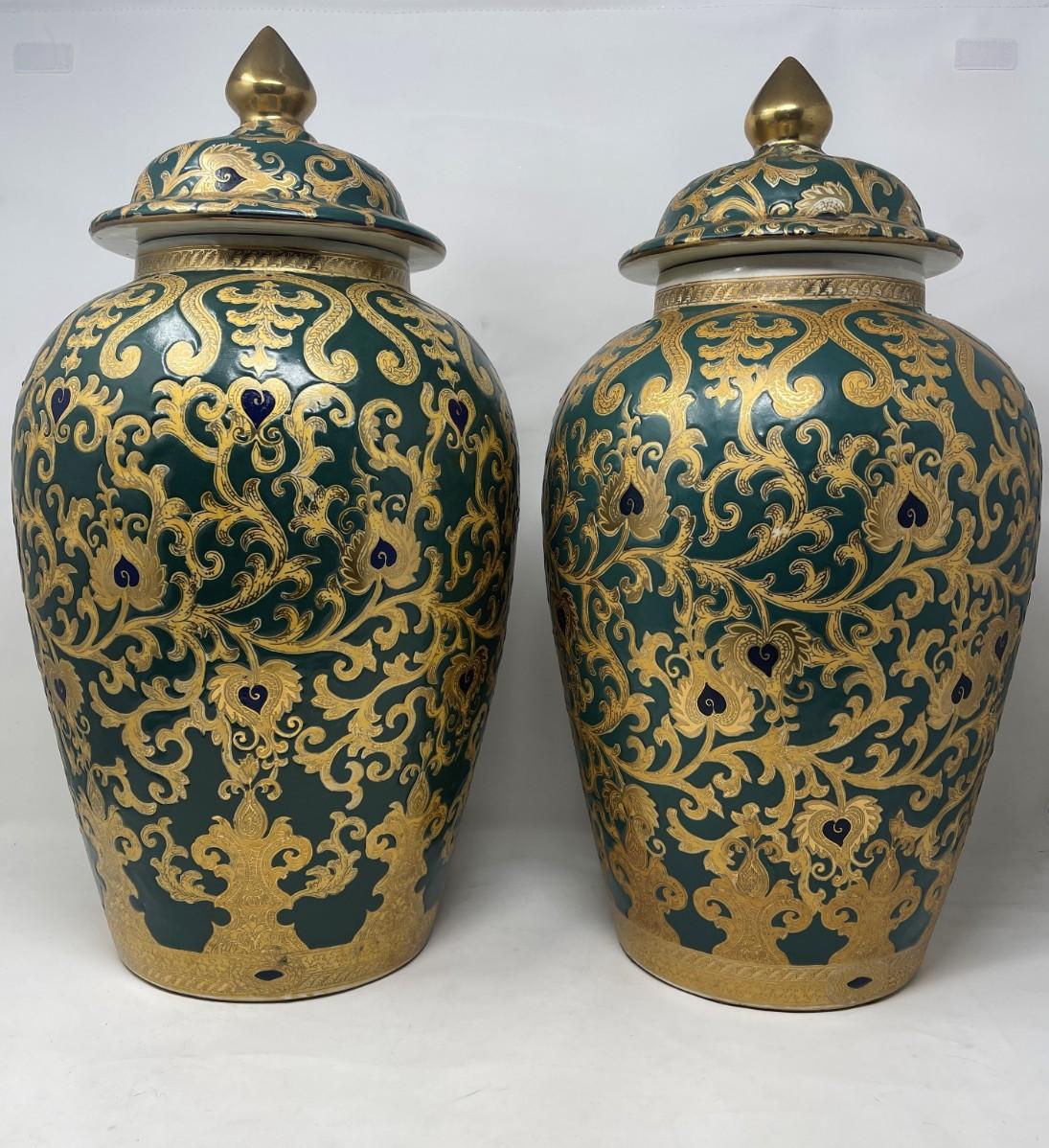 Pair of Green & Gold Ginger Jars with black highlights. Excellent condition. Each is 19" to top of finial.