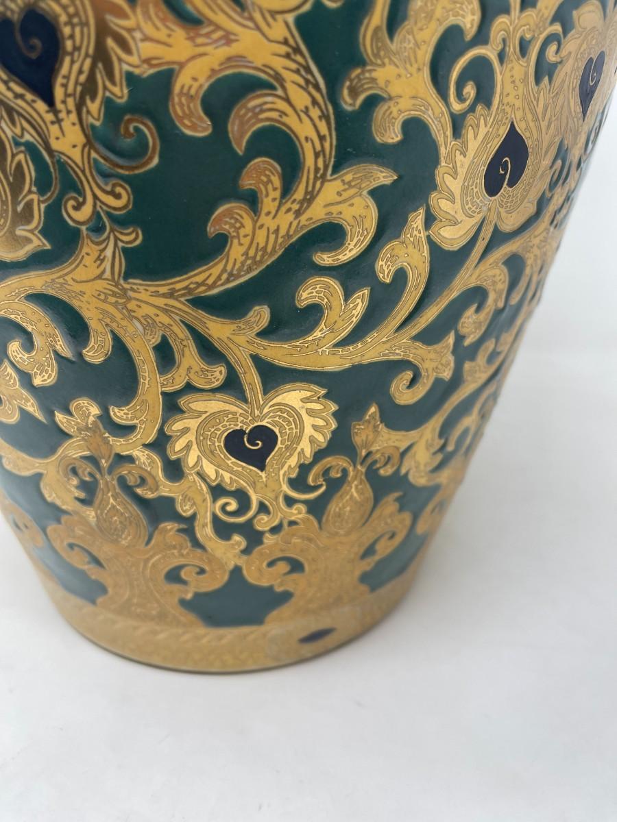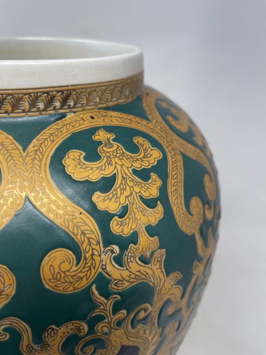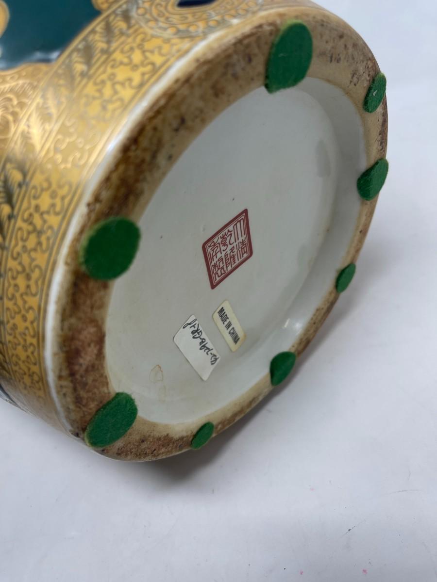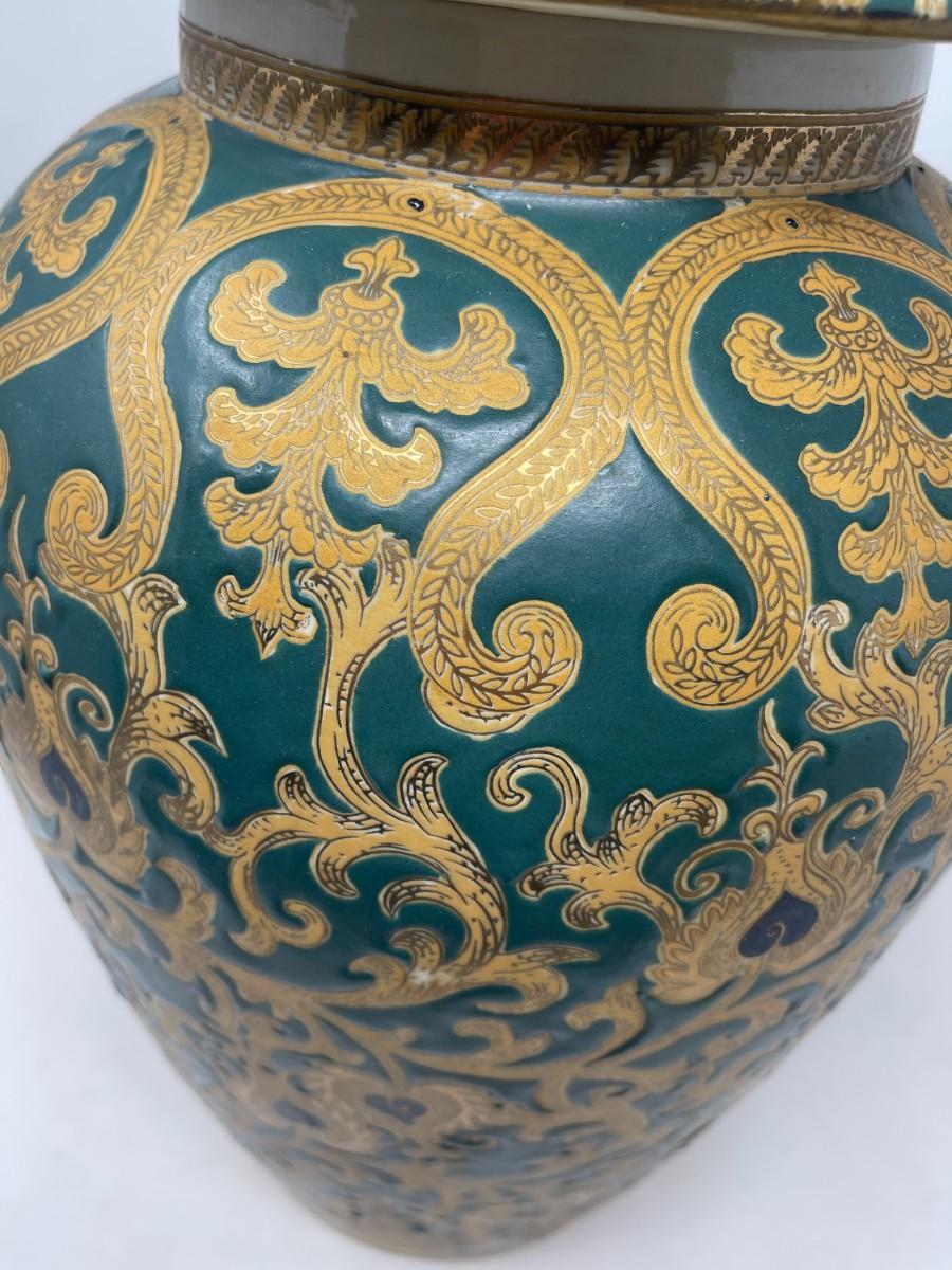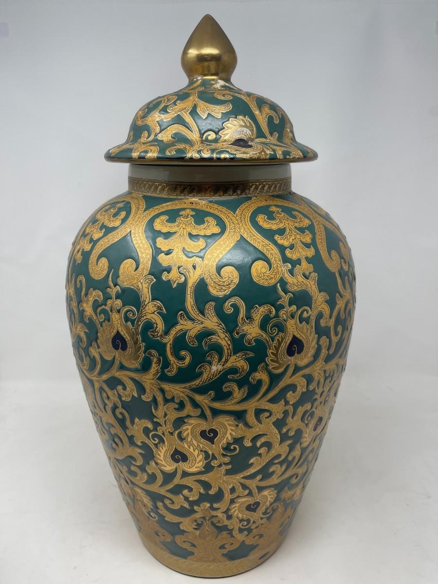 Pair of Green & Gold Ginger Jars with black highlights. Excellent condition. Each is 19" to top of finial.