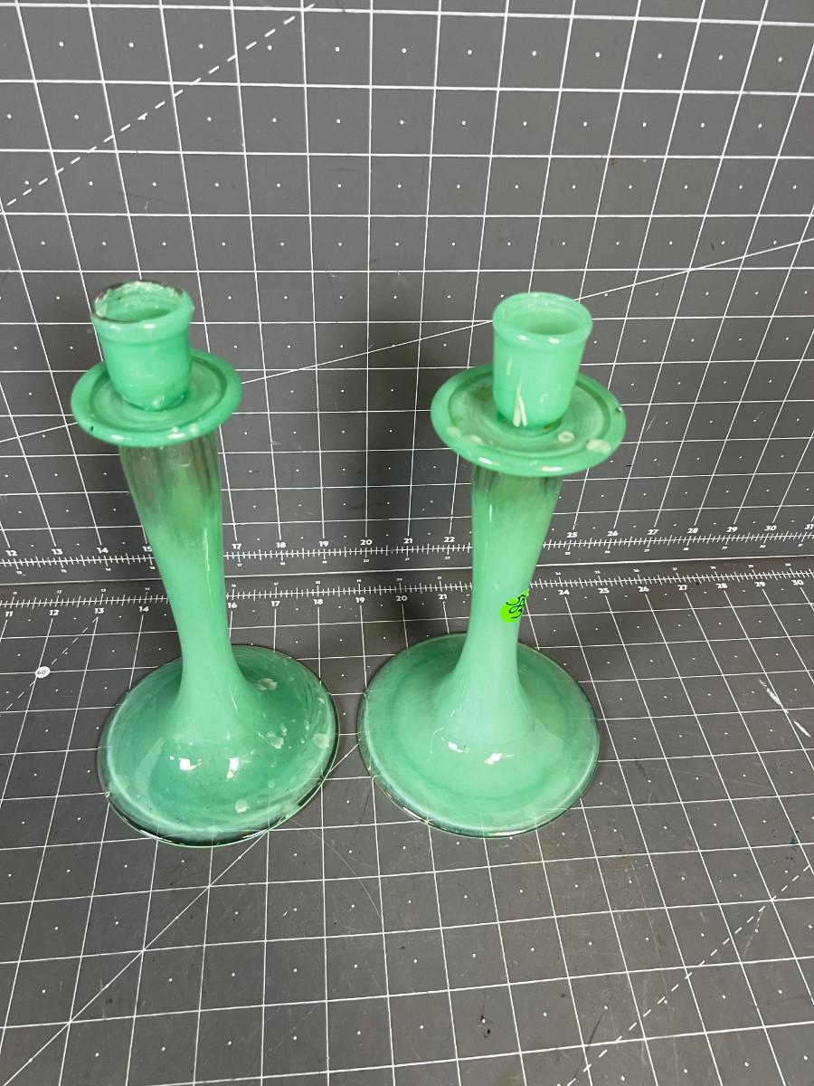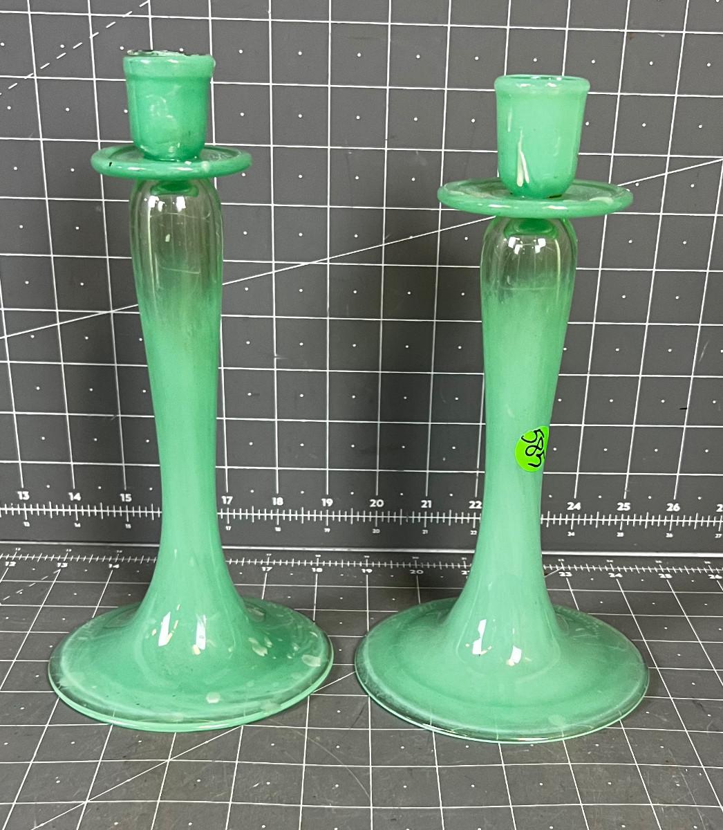 PAIR OF Green Hand Blown 9" Tall Candle Sticks