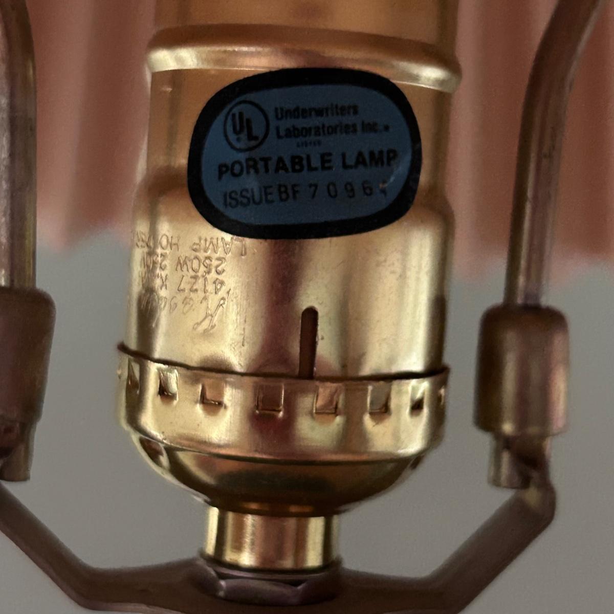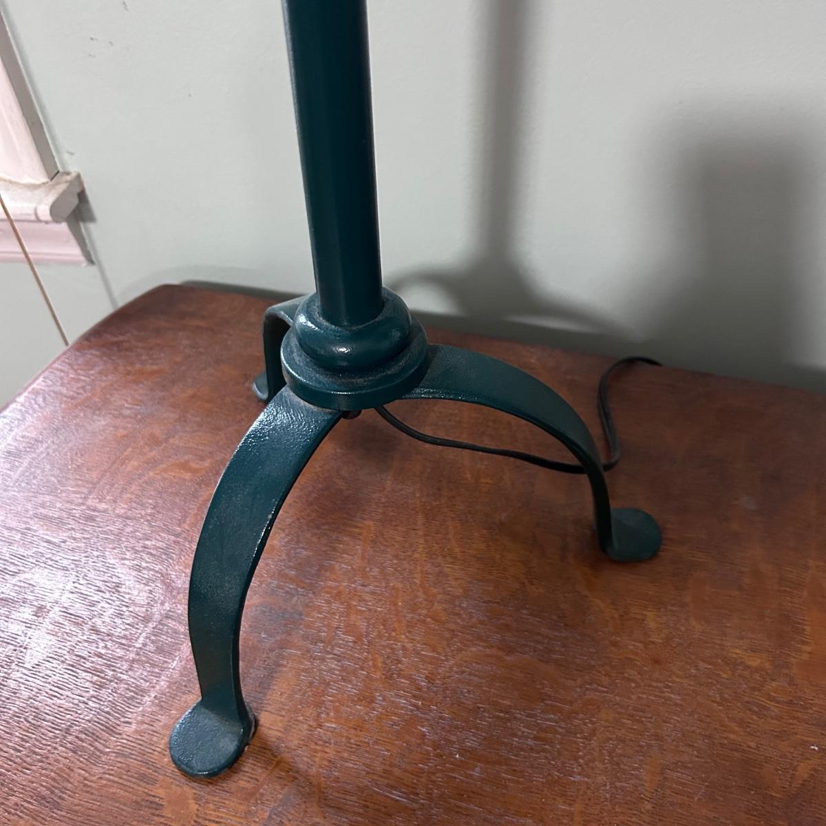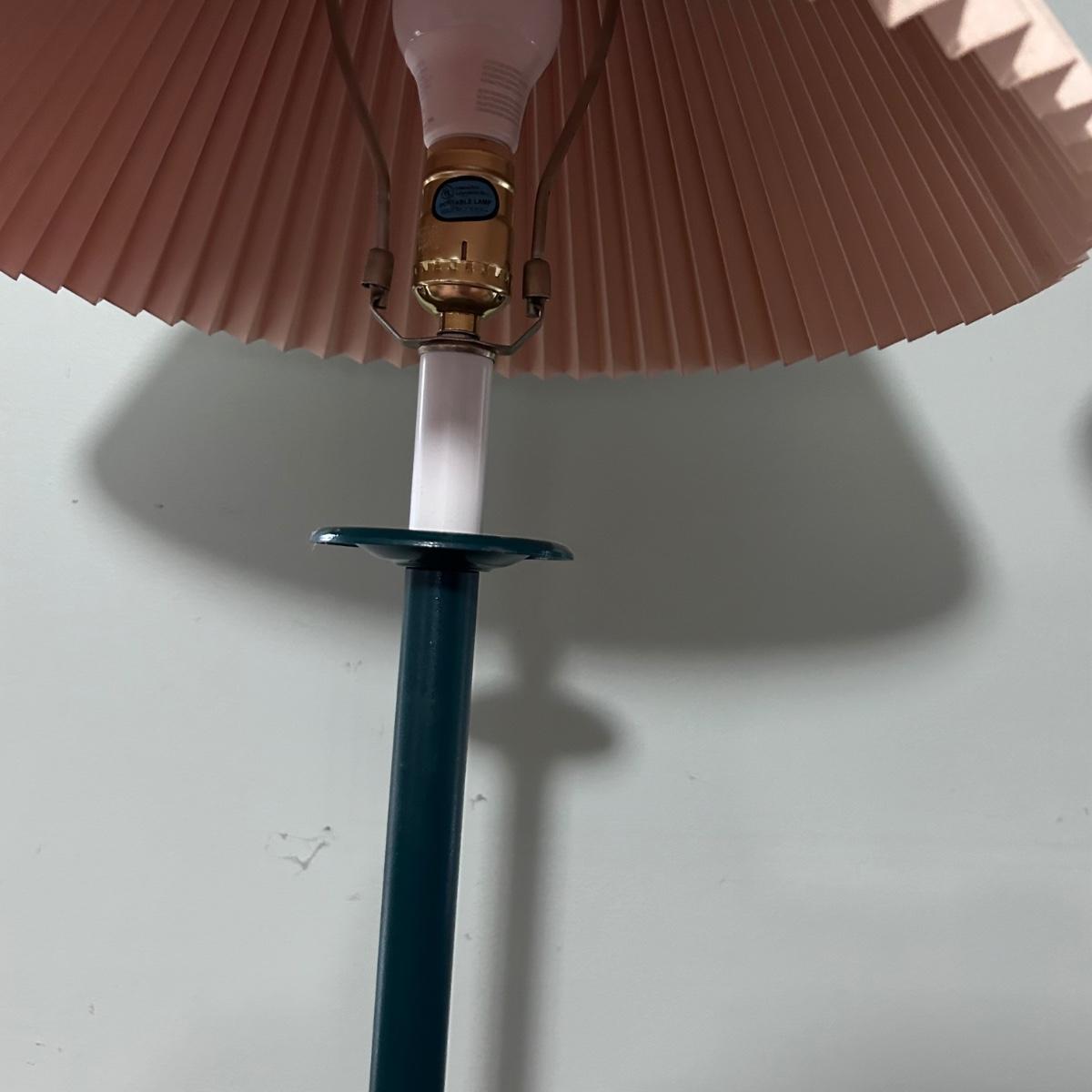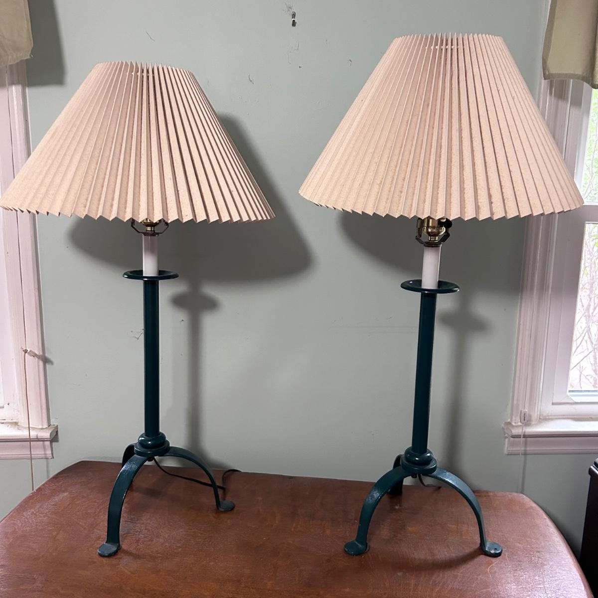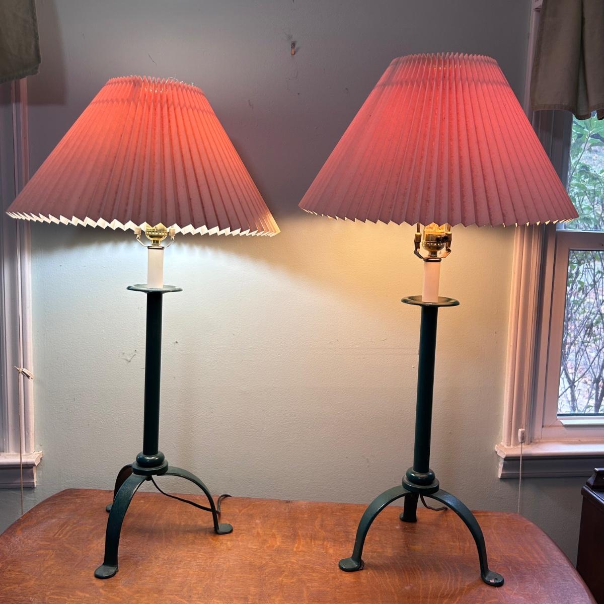 Lot includes two green painted metal lamps with tri-footed bases. The switches are 3way and shades are pleated with a good bit of dust to be cleaned off of them. One lamp is slightly taller than the other standing at 31” and the shades are 16” D. Both powered on. Local pick up only.