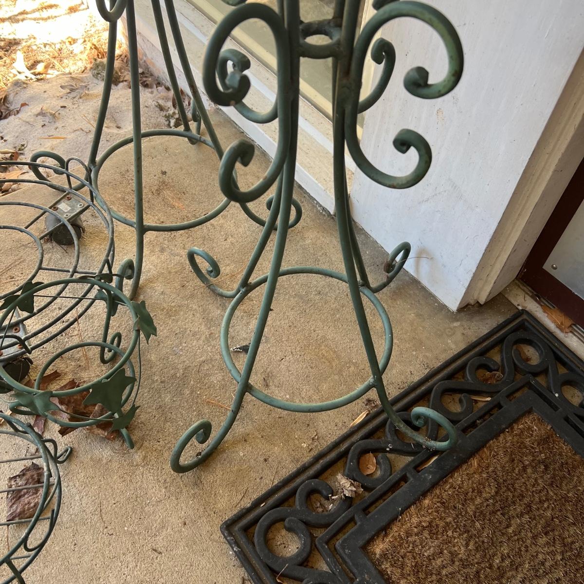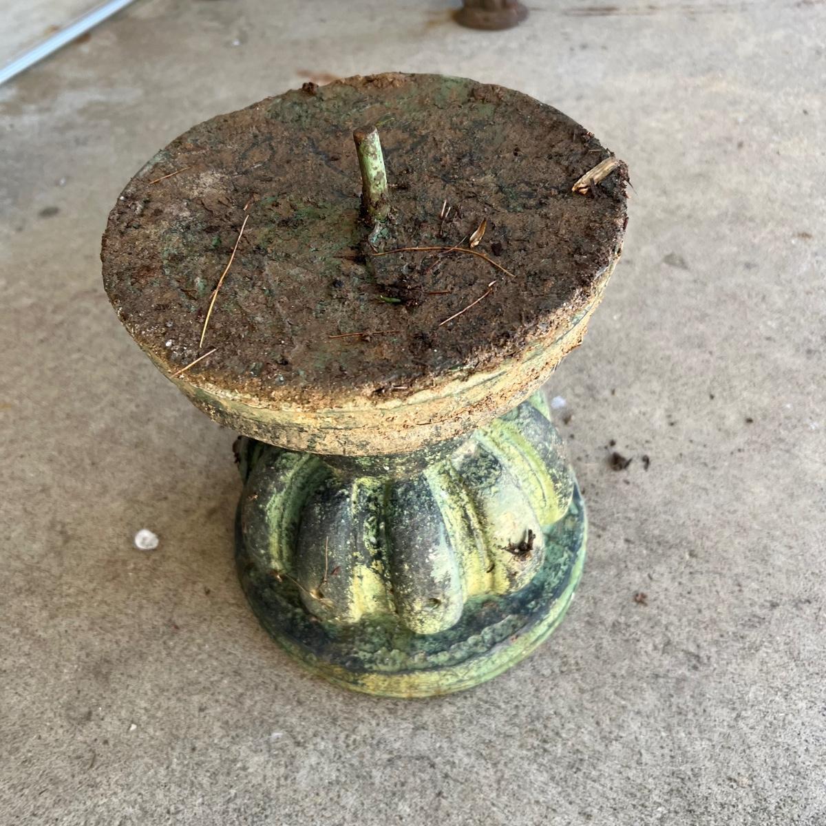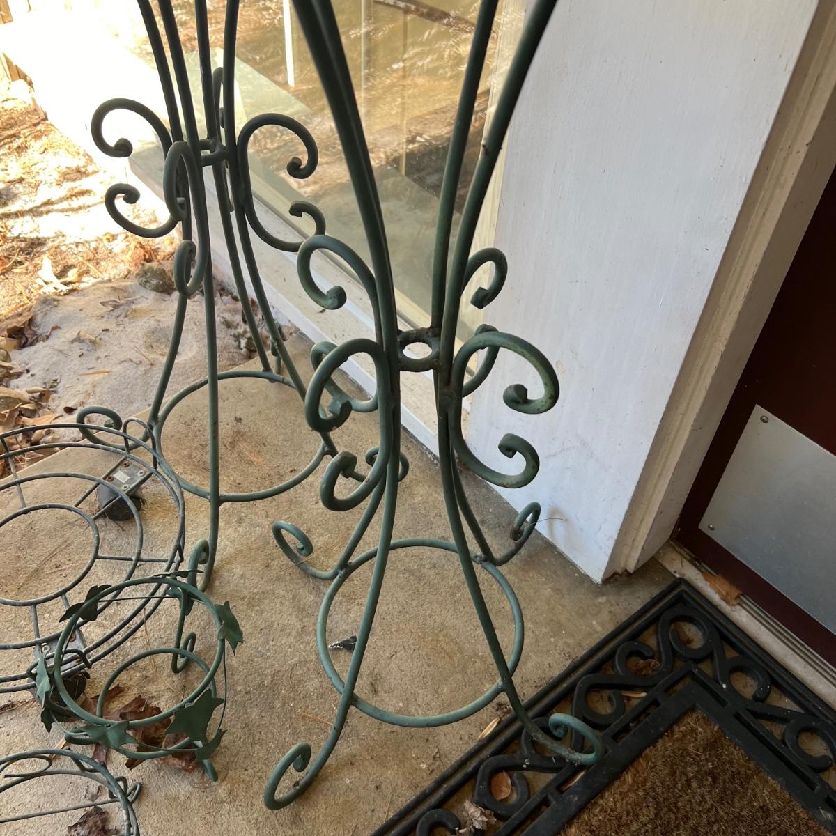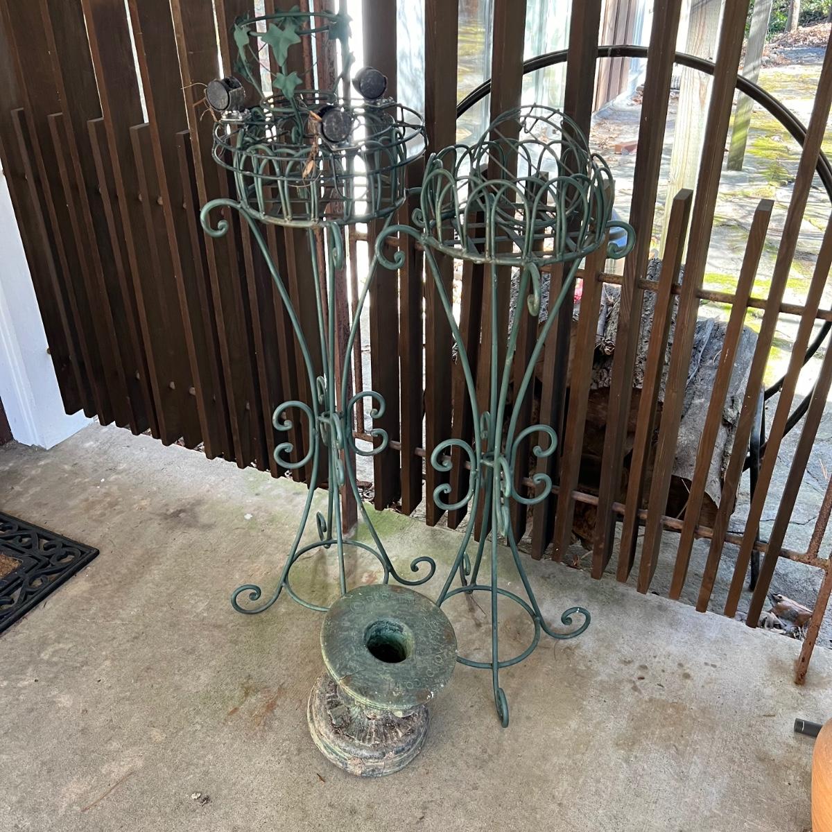 Most items are metal with a green colored finish and includes two sturdy tall plant stands that measure 10”D x 38”H, two small plant stands, a rolling pot stand on plastic casters and lastly, a cement base; this base has a metal rod poking out of its base which could be sawn off or used to anchor it in the dirt and used as a base for a plant pot or bird bath.