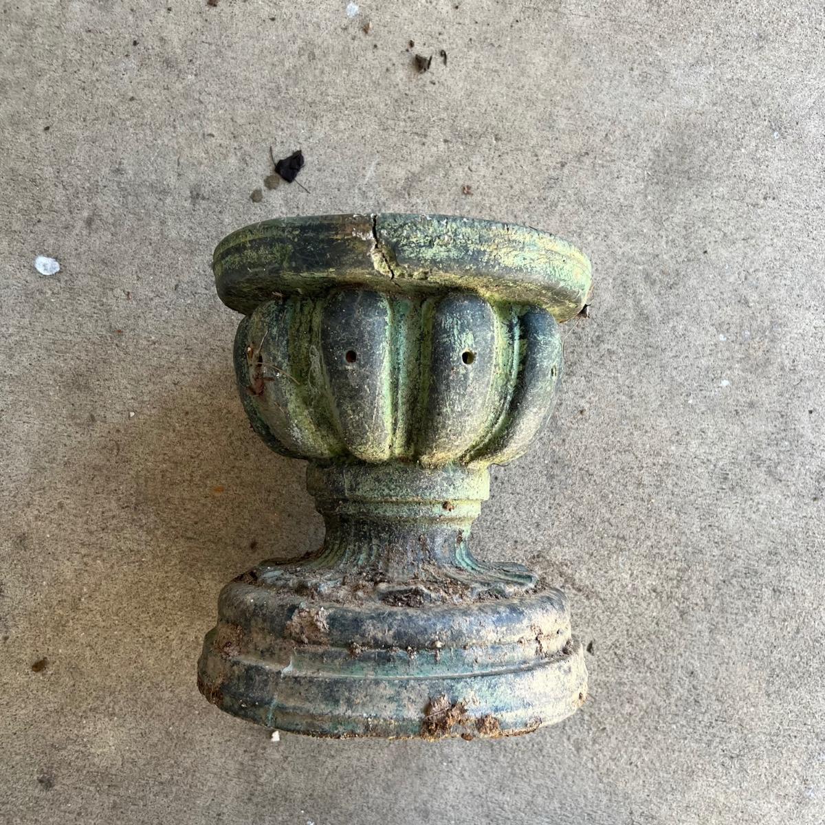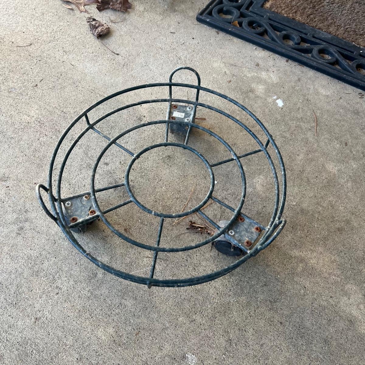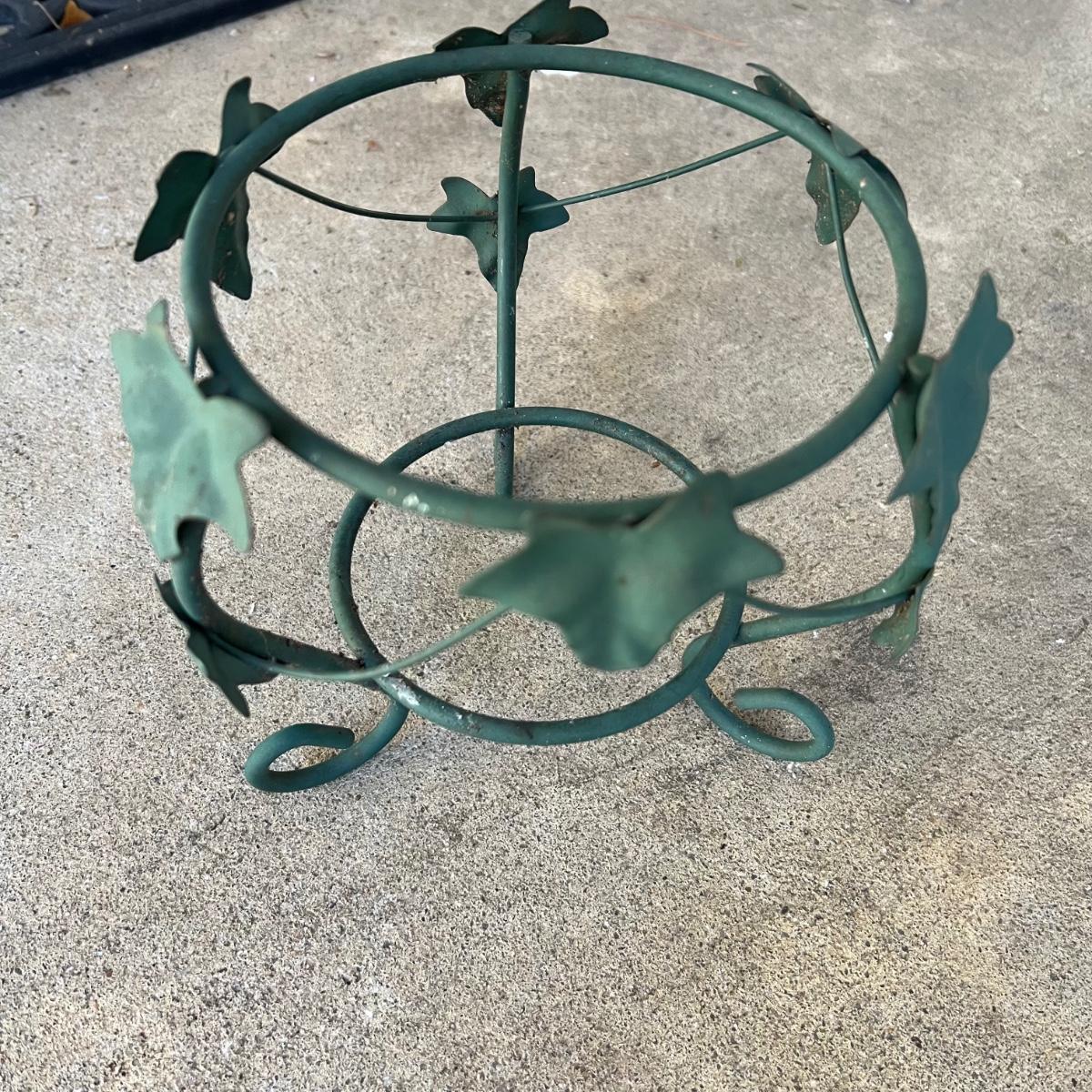 Most items are metal with a green colored finish and includes two sturdy tall plant stands that measure 10”D x 38”H, two small plant stands, a rolling pot stand on plastic casters and lastly, a cement base; this base has a metal rod poking out of its base which could be sawn off or used to anchor it in the dirt and used as a base for a plant pot or bird bath.