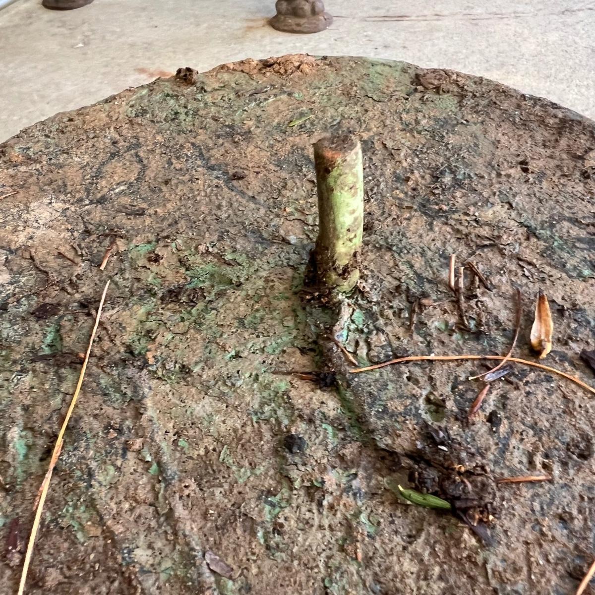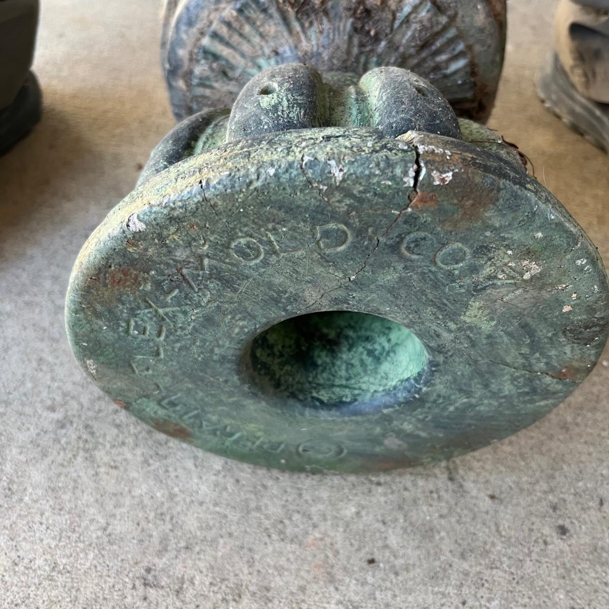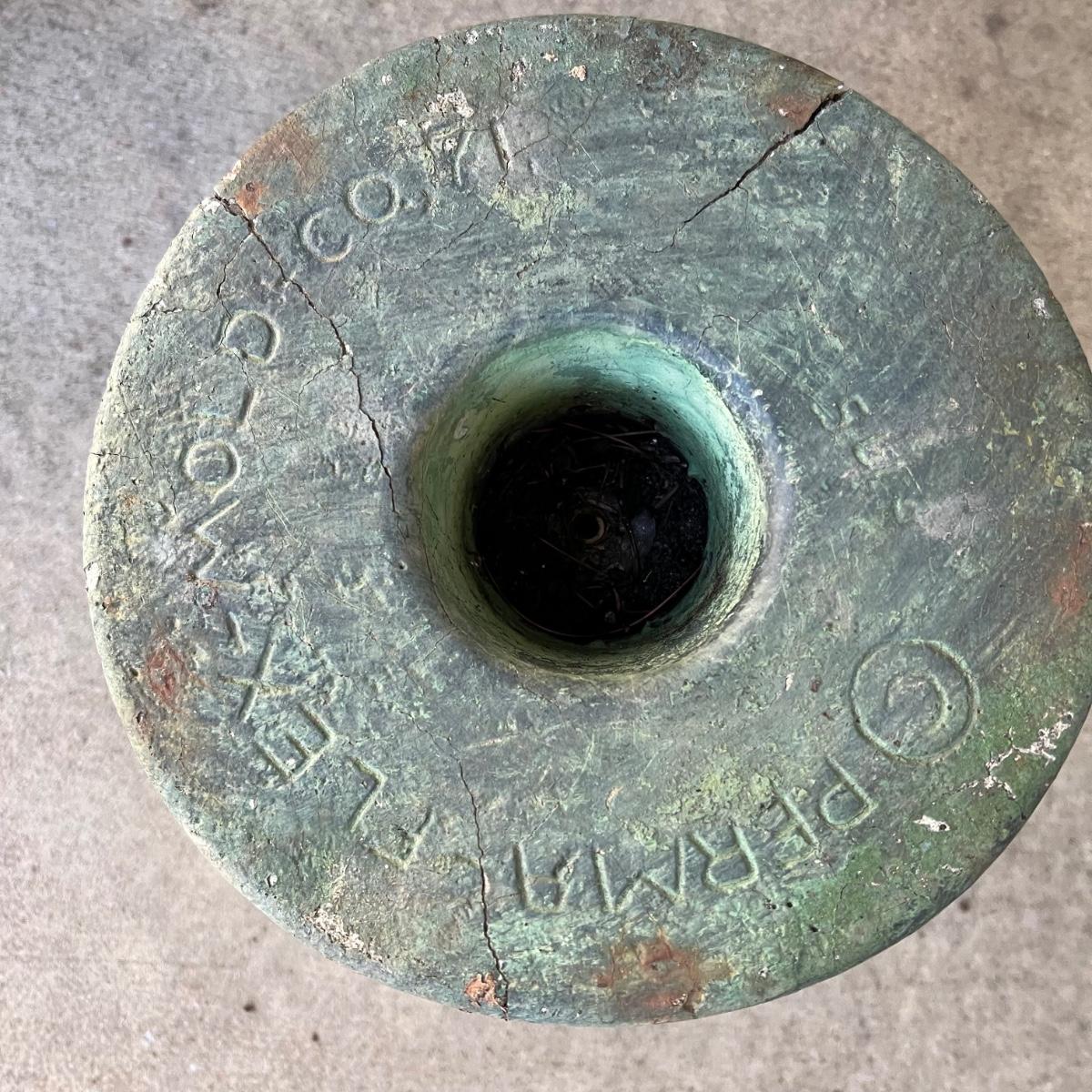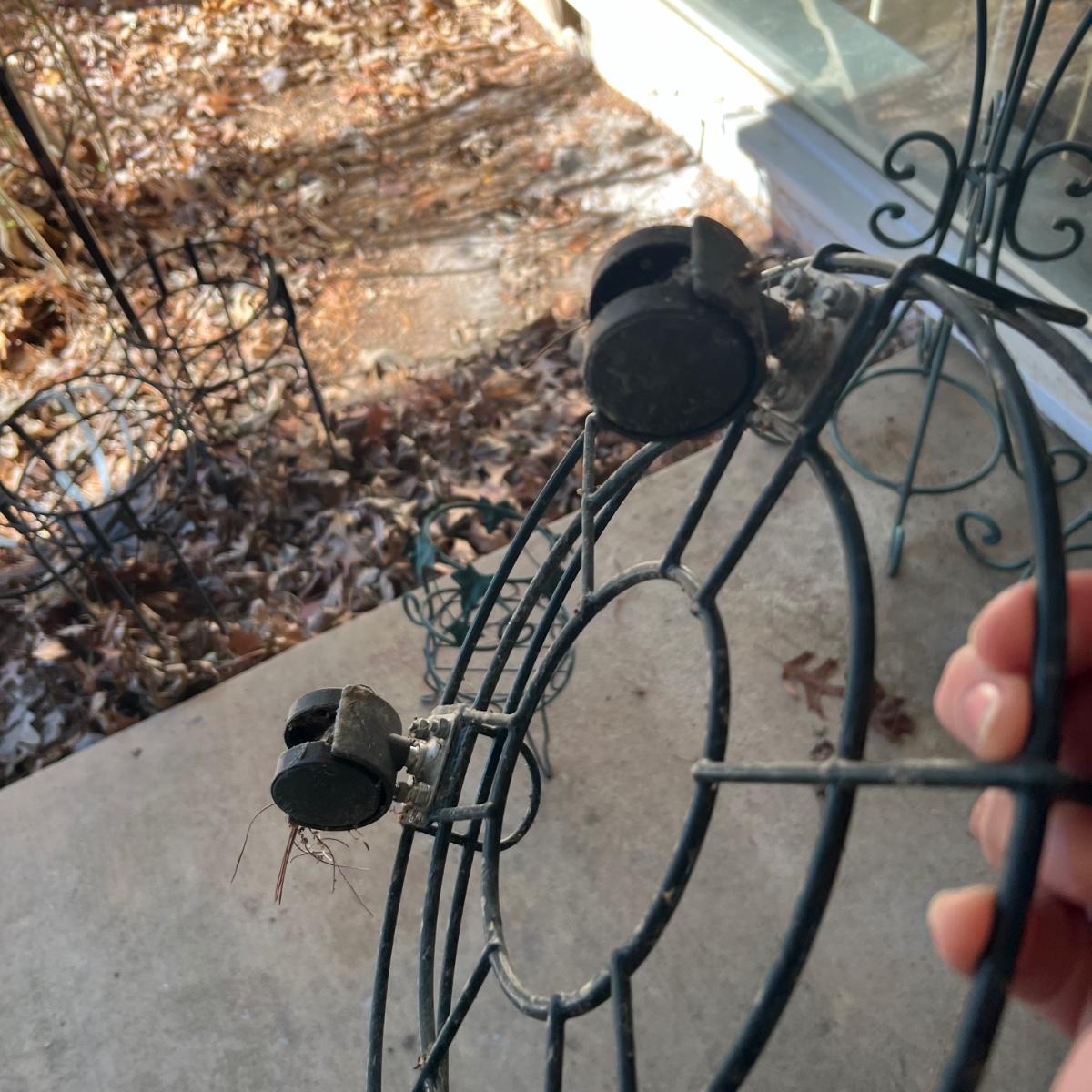 Most items are metal with a green colored finish and includes two sturdy tall plant stands that measure 10”D x 38”H, two small plant stands, a rolling pot stand on plastic casters and lastly, a cement base; this base has a metal rod poking out of its base which could be sawn off or used to anchor it in the dirt and used as a base for a plant pot or bird bath.