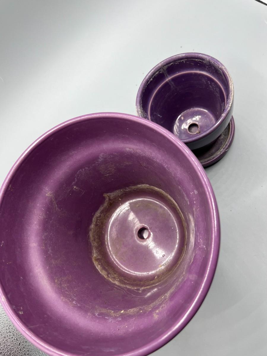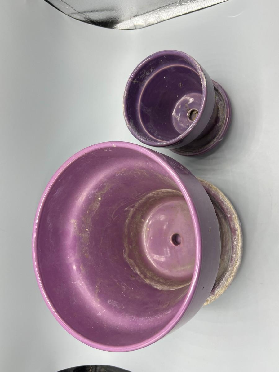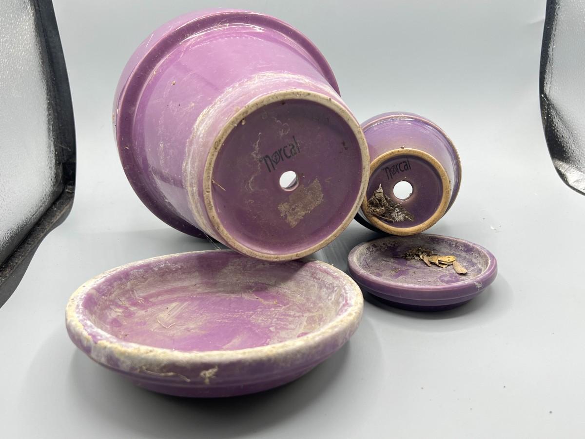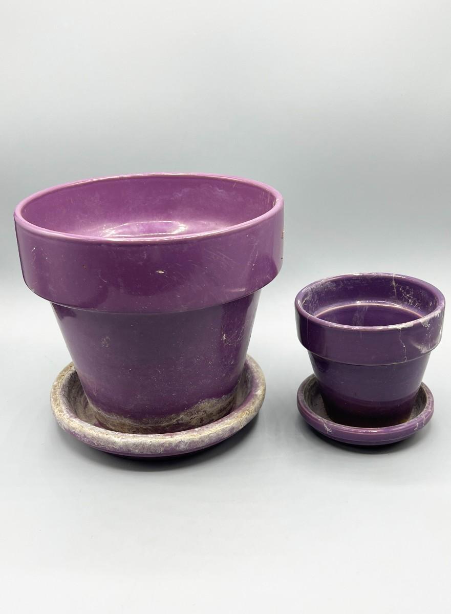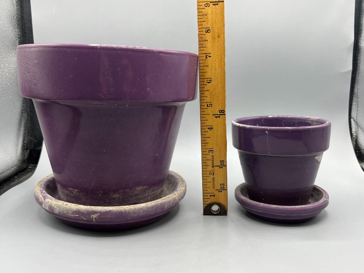 Pair of Purple Flower Garden Planter Pots, there is some light wear, but there is no significant damage and is in good displayable condition. Check pictures for more details and for sizing.