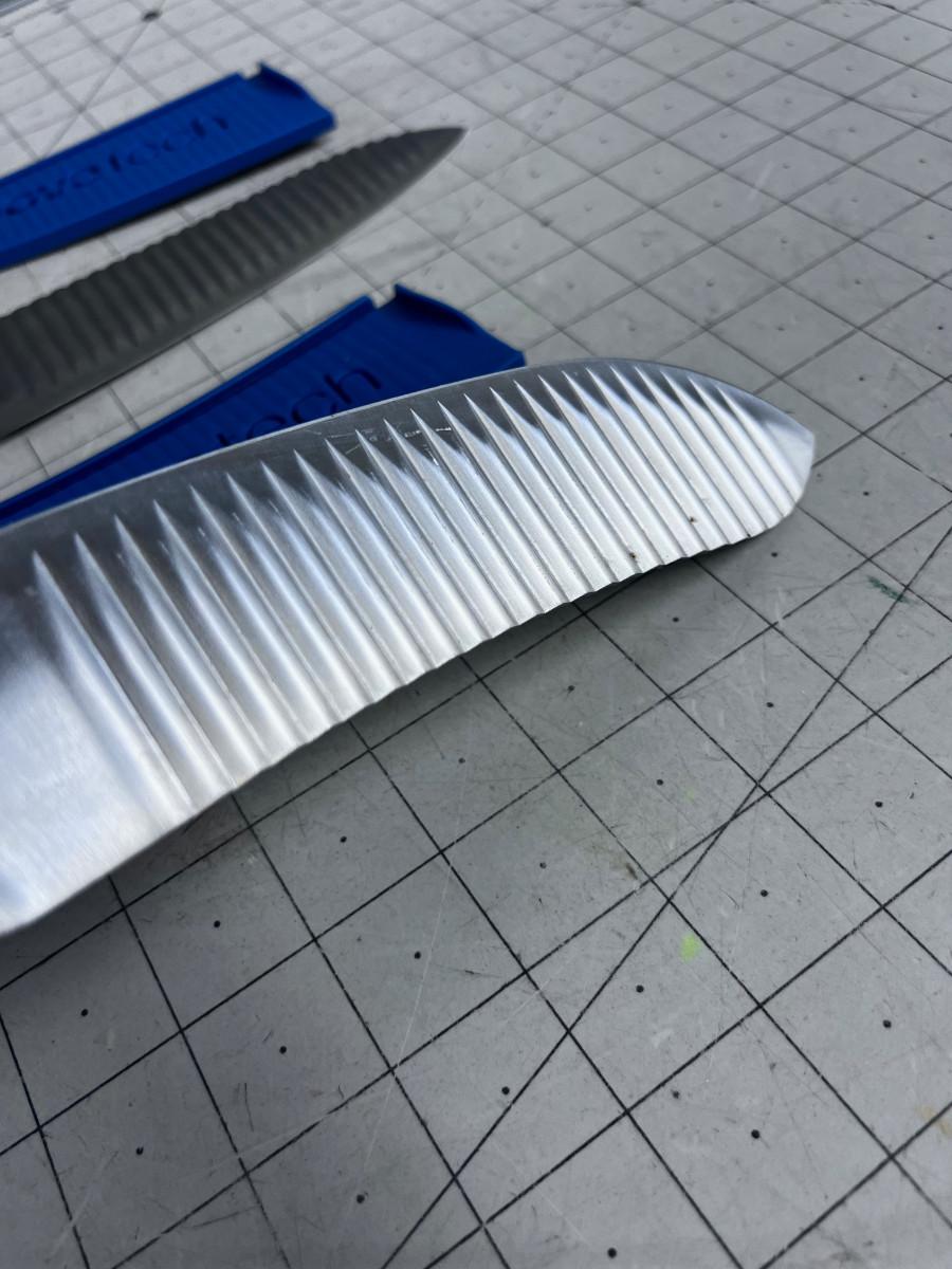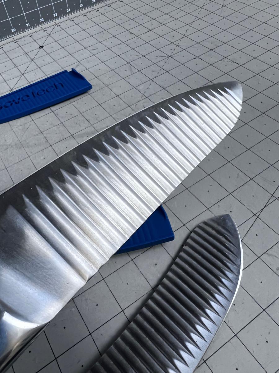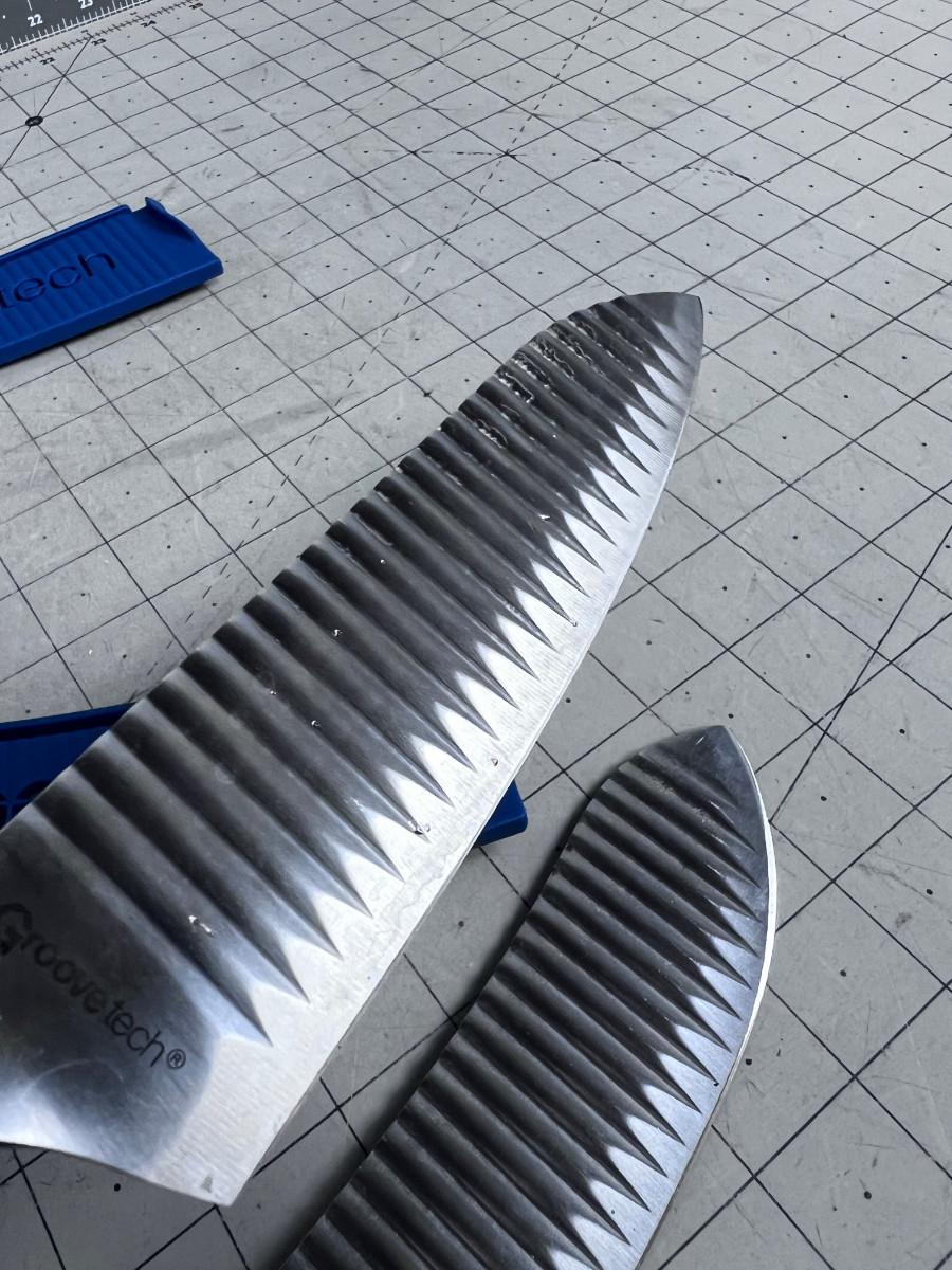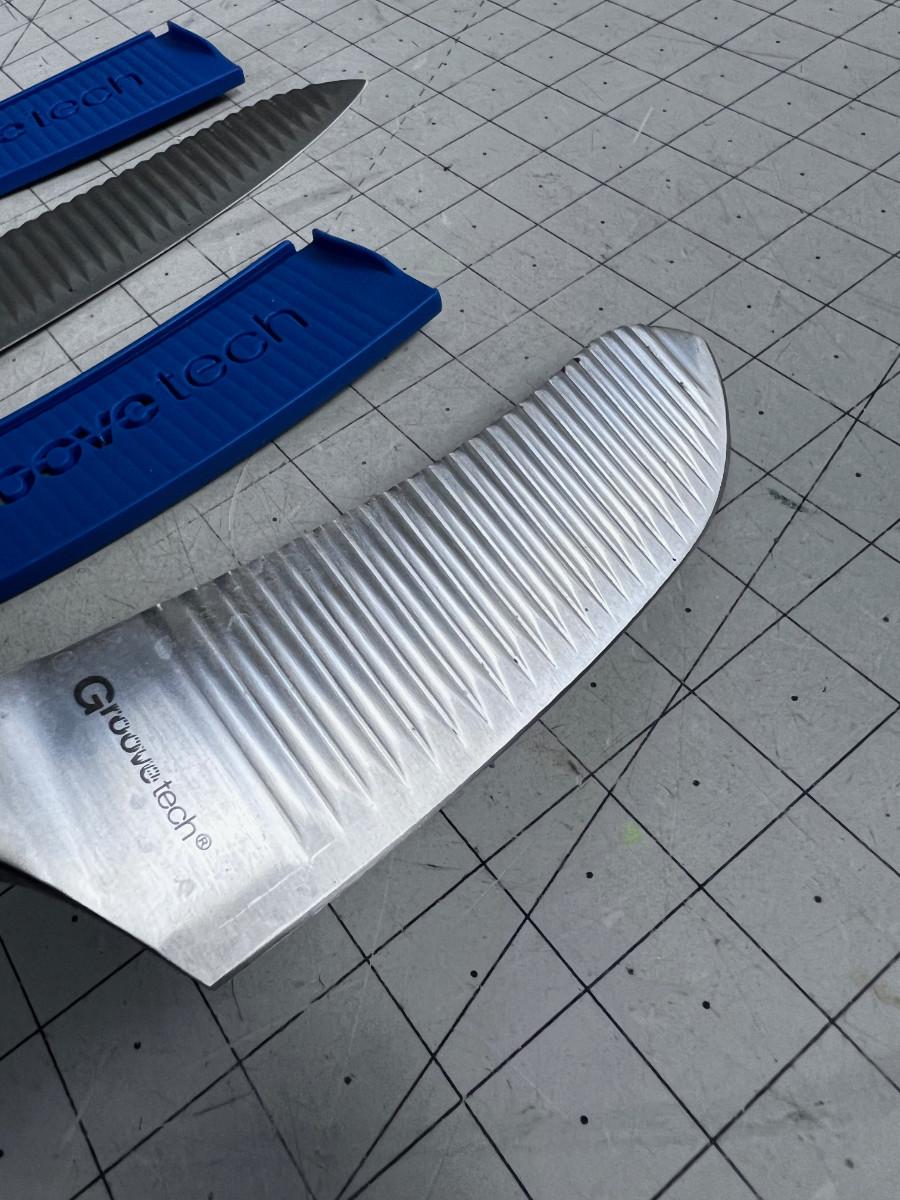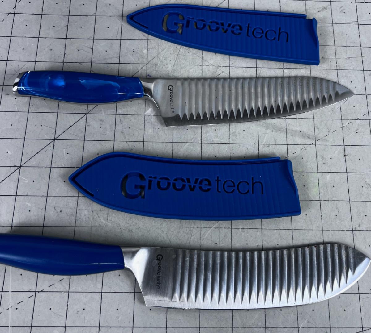 Pair of Grooved TECH knives, Blue Handles and Blade Covers