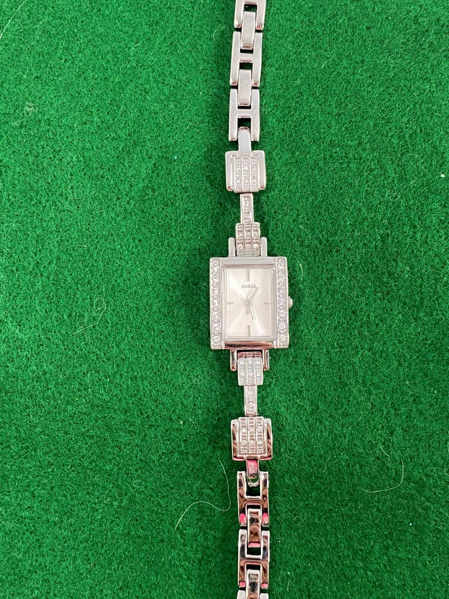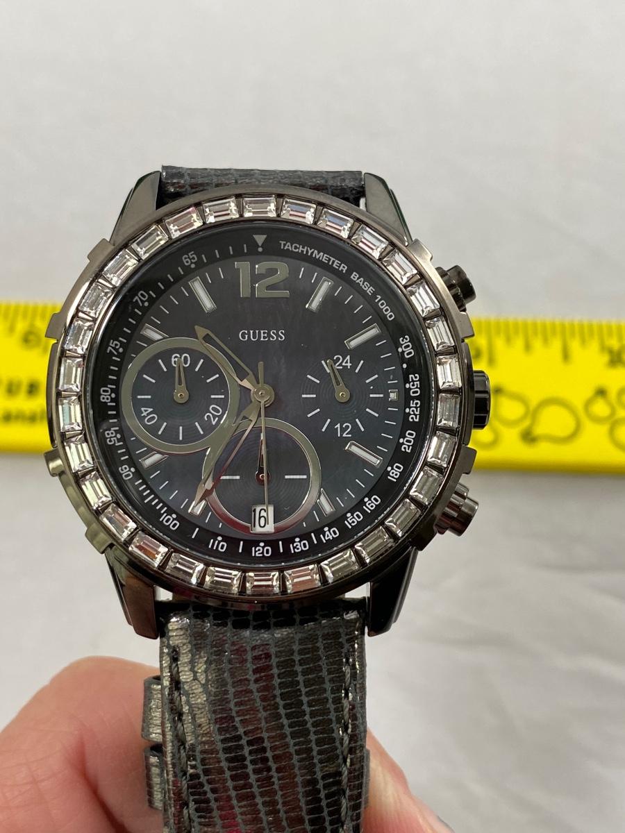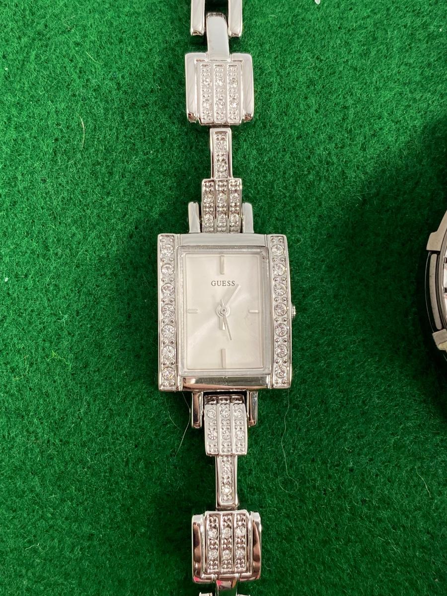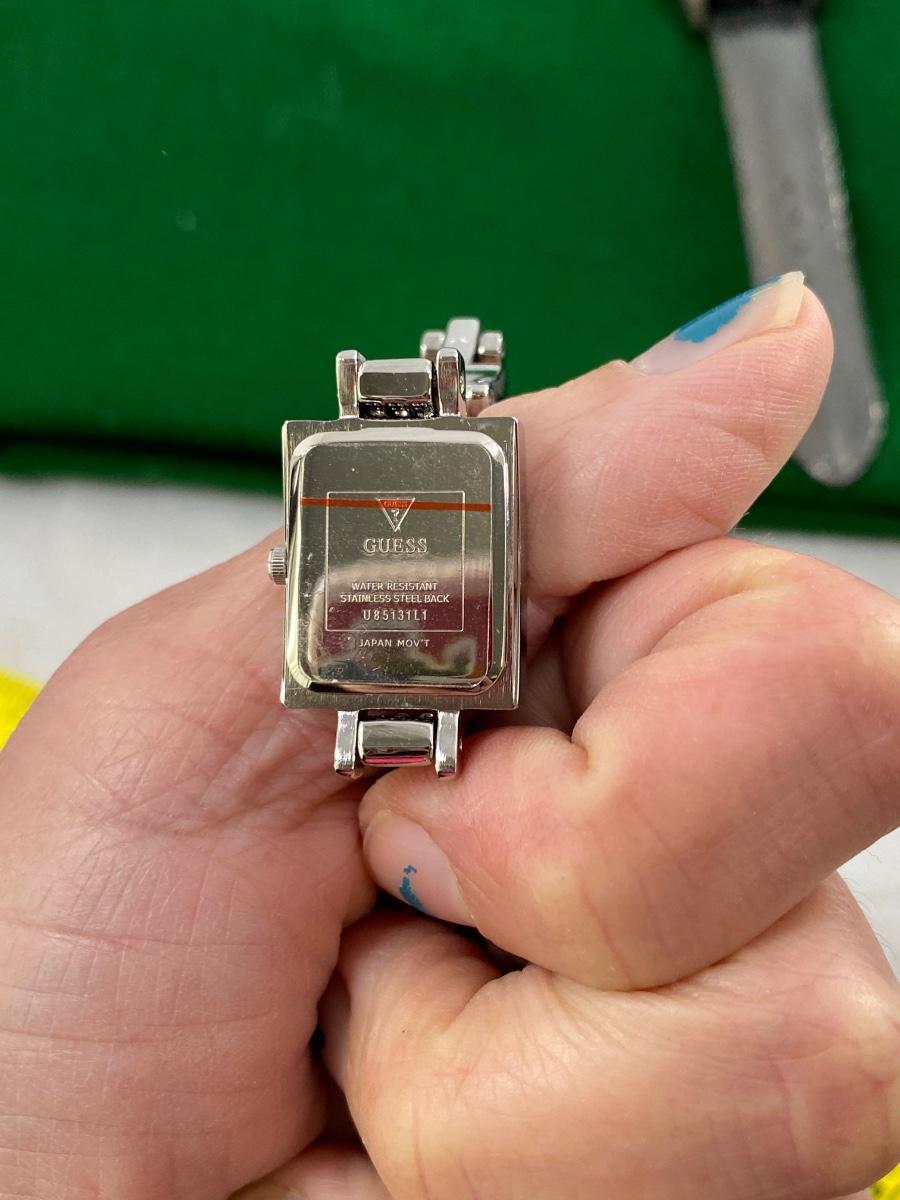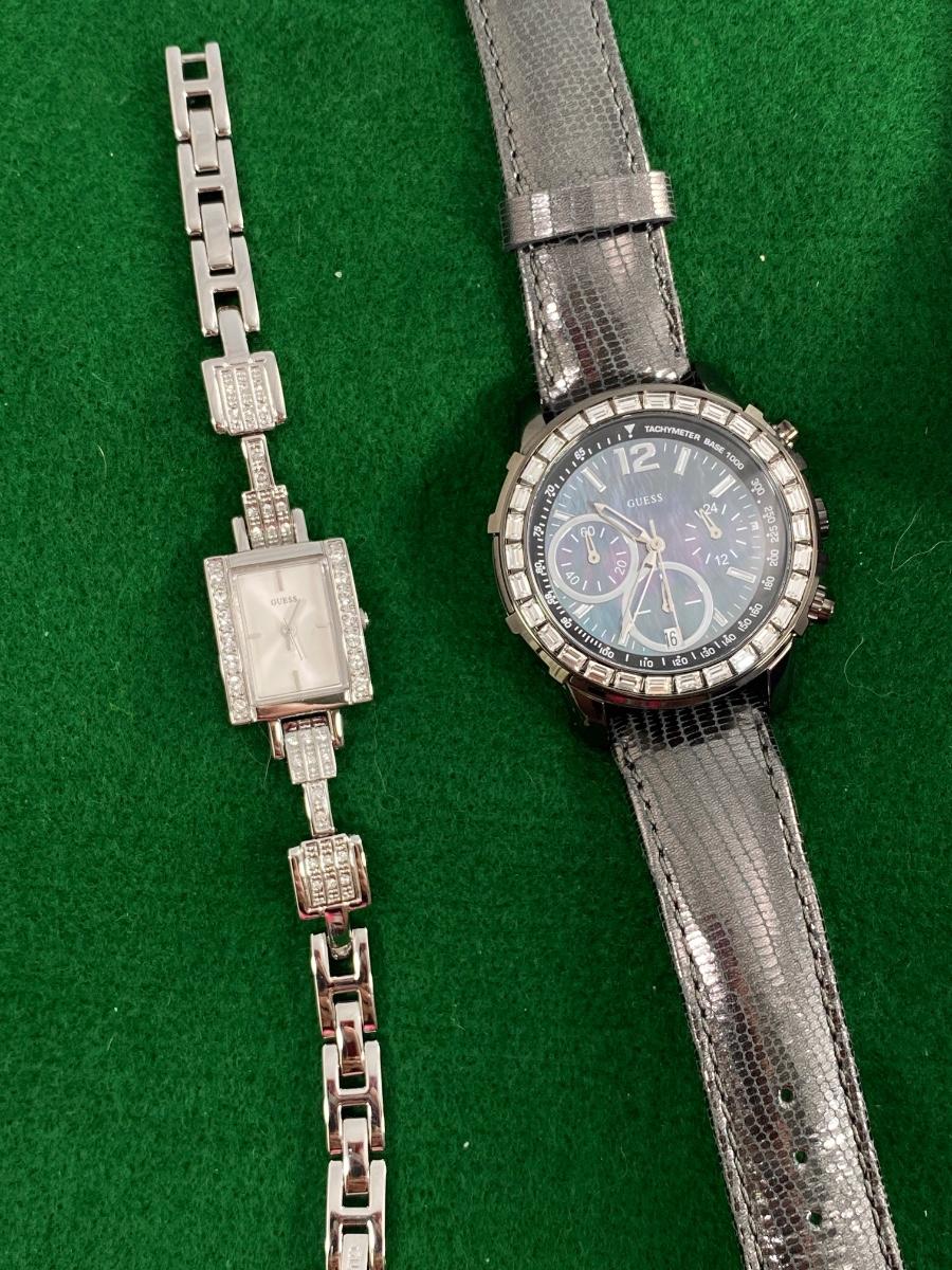 Pair of GUESS brand wristwatches. Both look to be unworn; one still has hang tag attached. Need new batteries. Silver tone rhinestone watch has two removeable links for sizing. Come with vinyl GUESS zipper bag pouches.