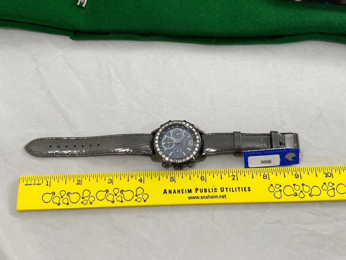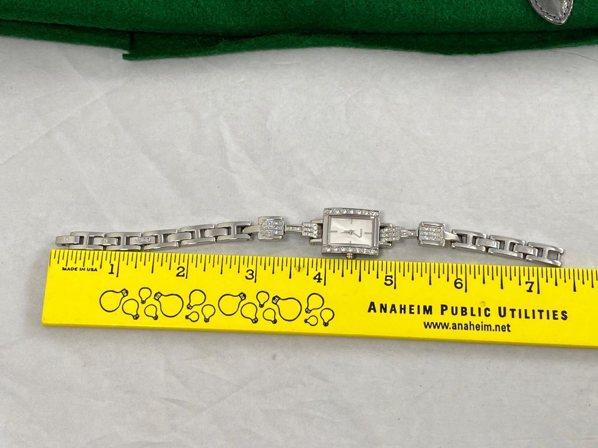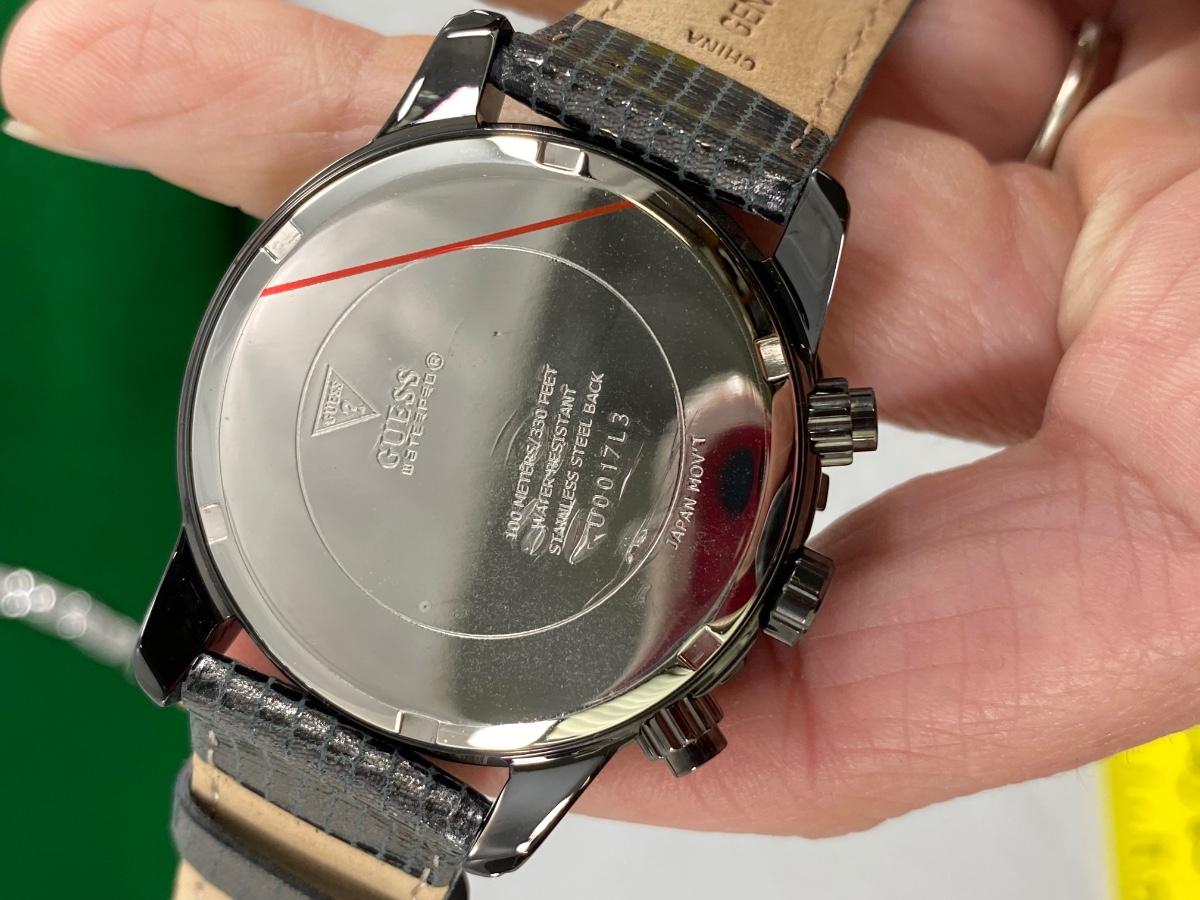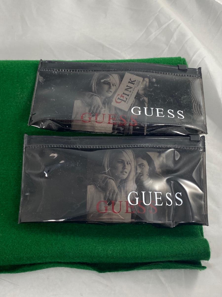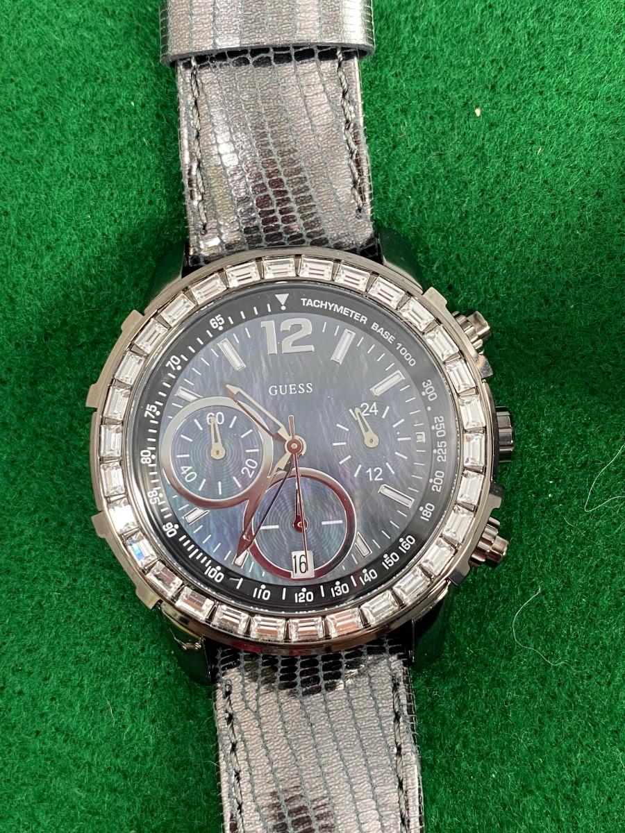 Pair of GUESS brand wristwatches. Both look to be unworn; one still has hang tag attached. Need new batteries. Silver tone rhinestone watch has two removeable links for sizing. Come with vinyl GUESS zipper bag pouches.
