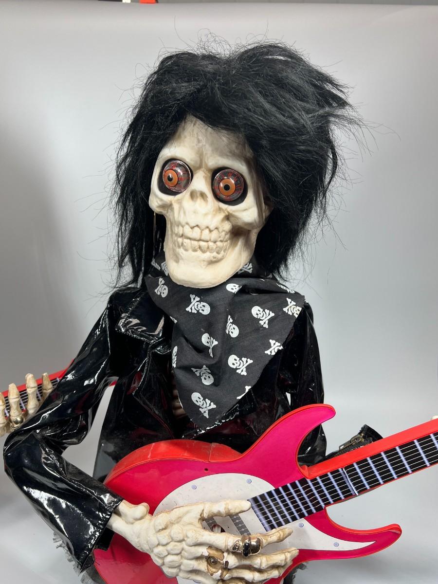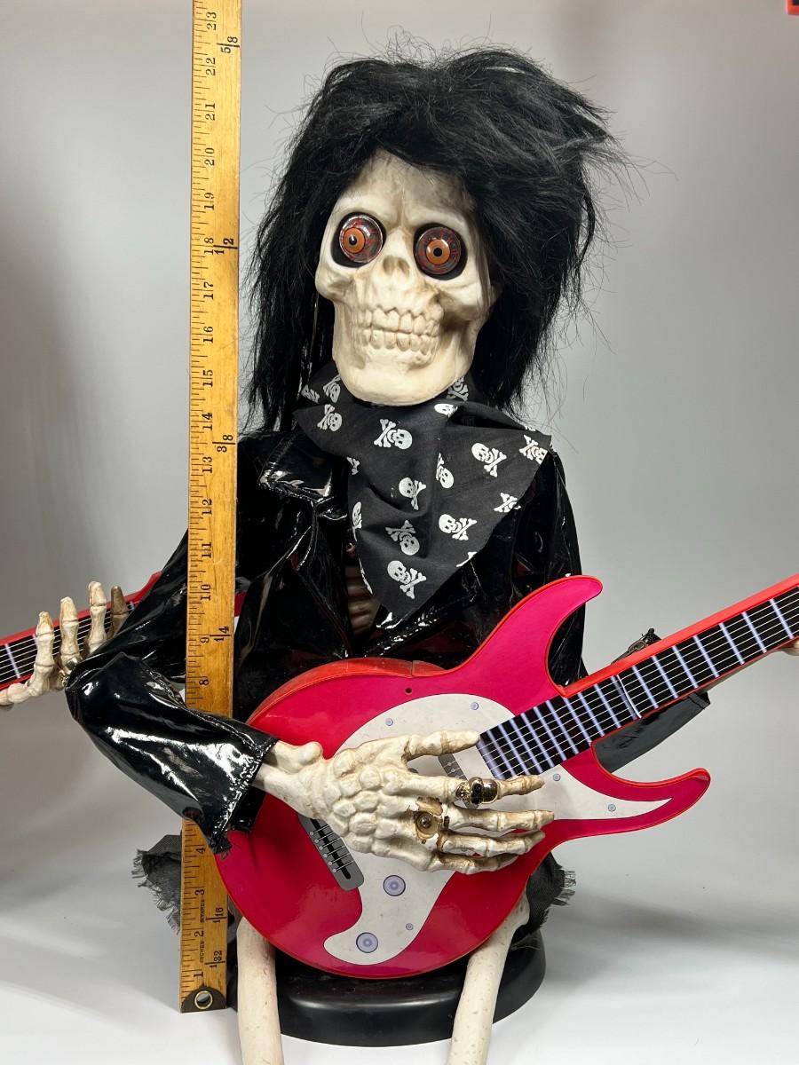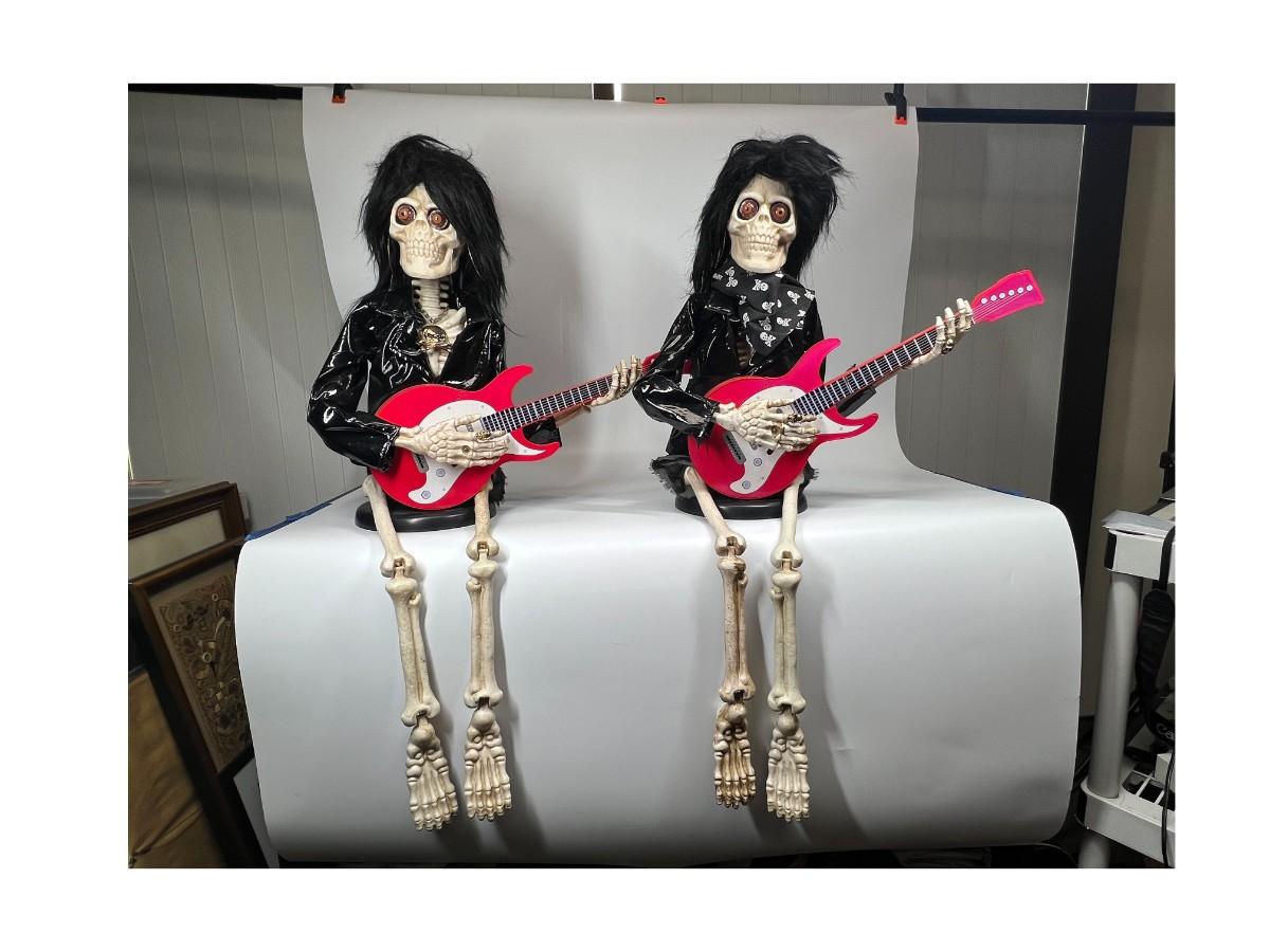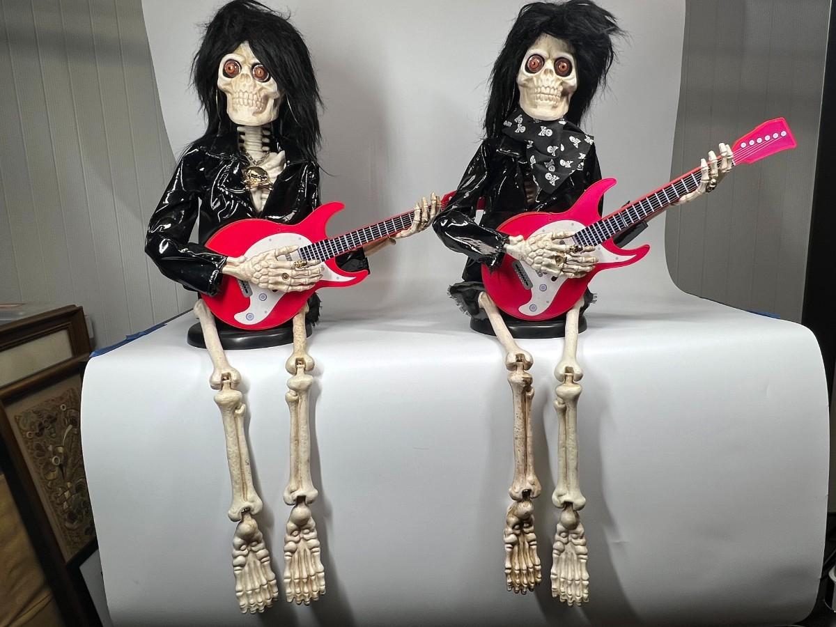 Pair of creepy guitar playing skeletons. Battery operated, light up and musical, Tested and both are working. Large, sitting size is over 20" plus.