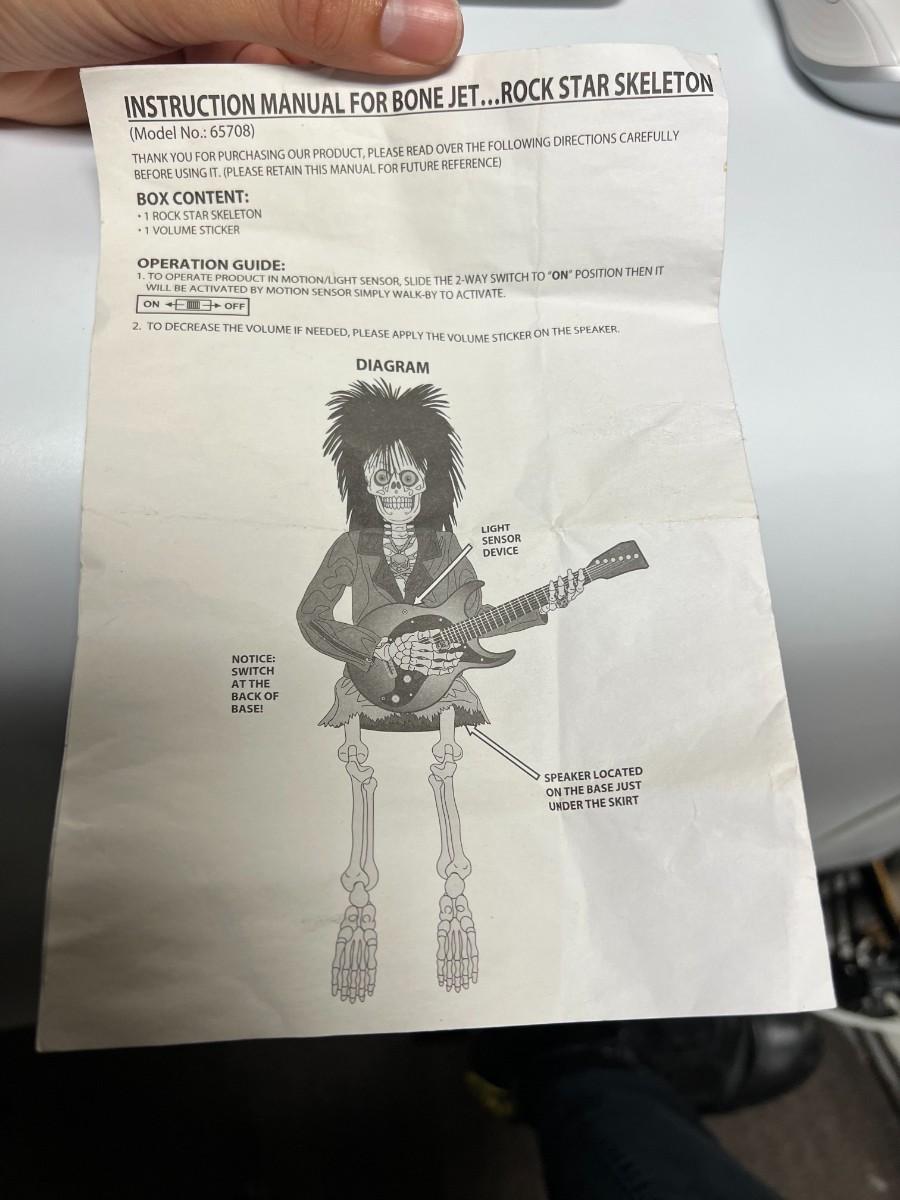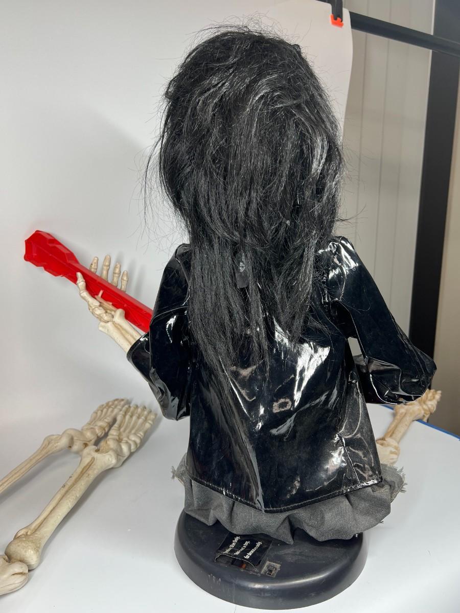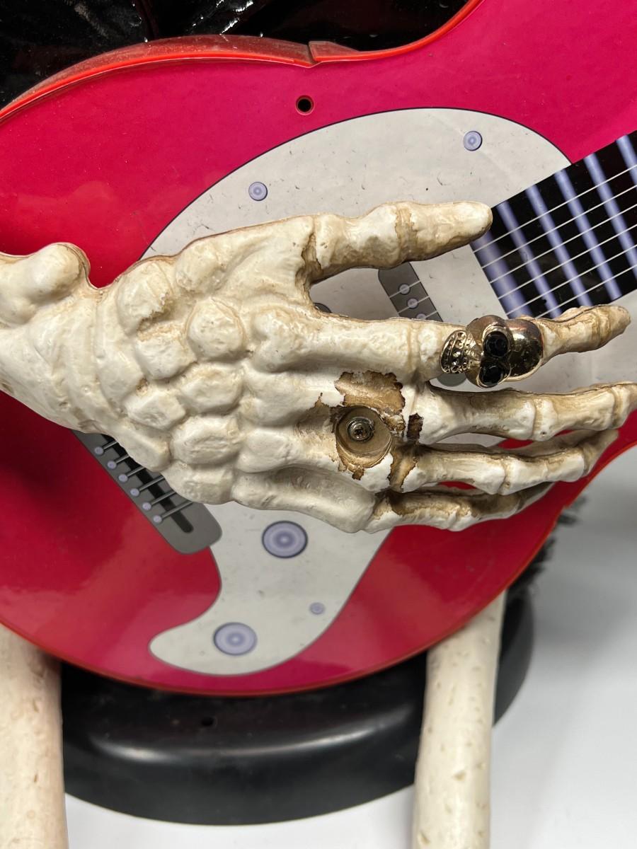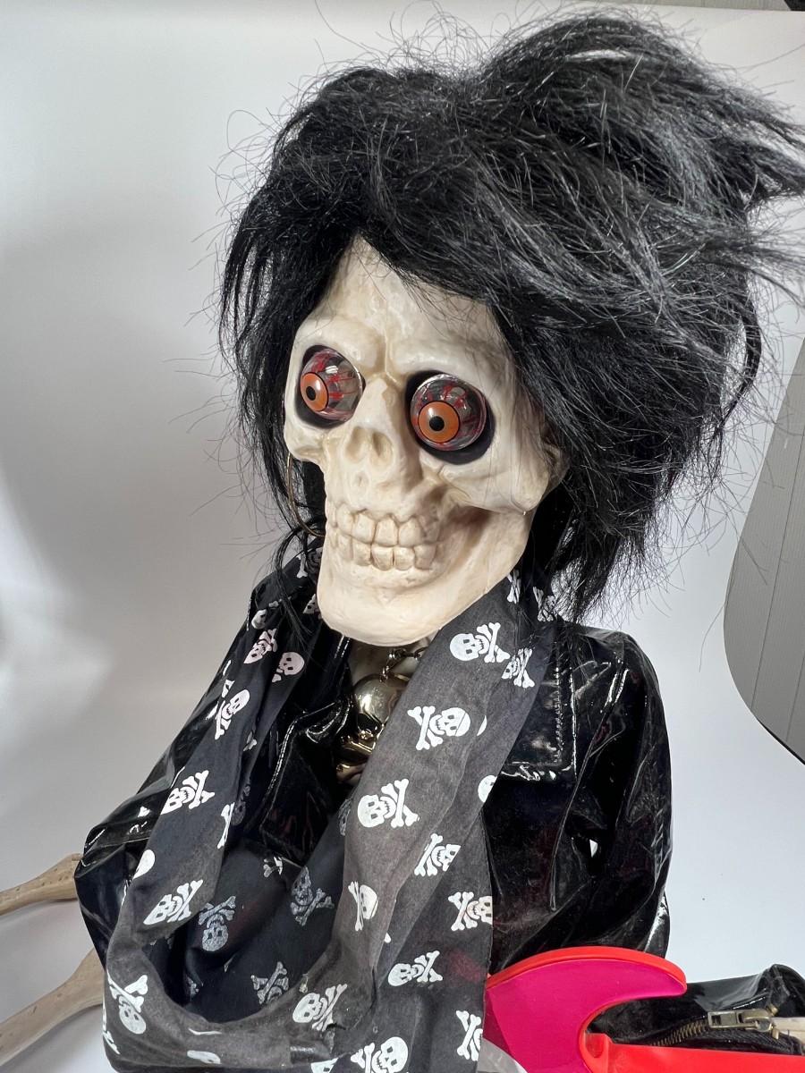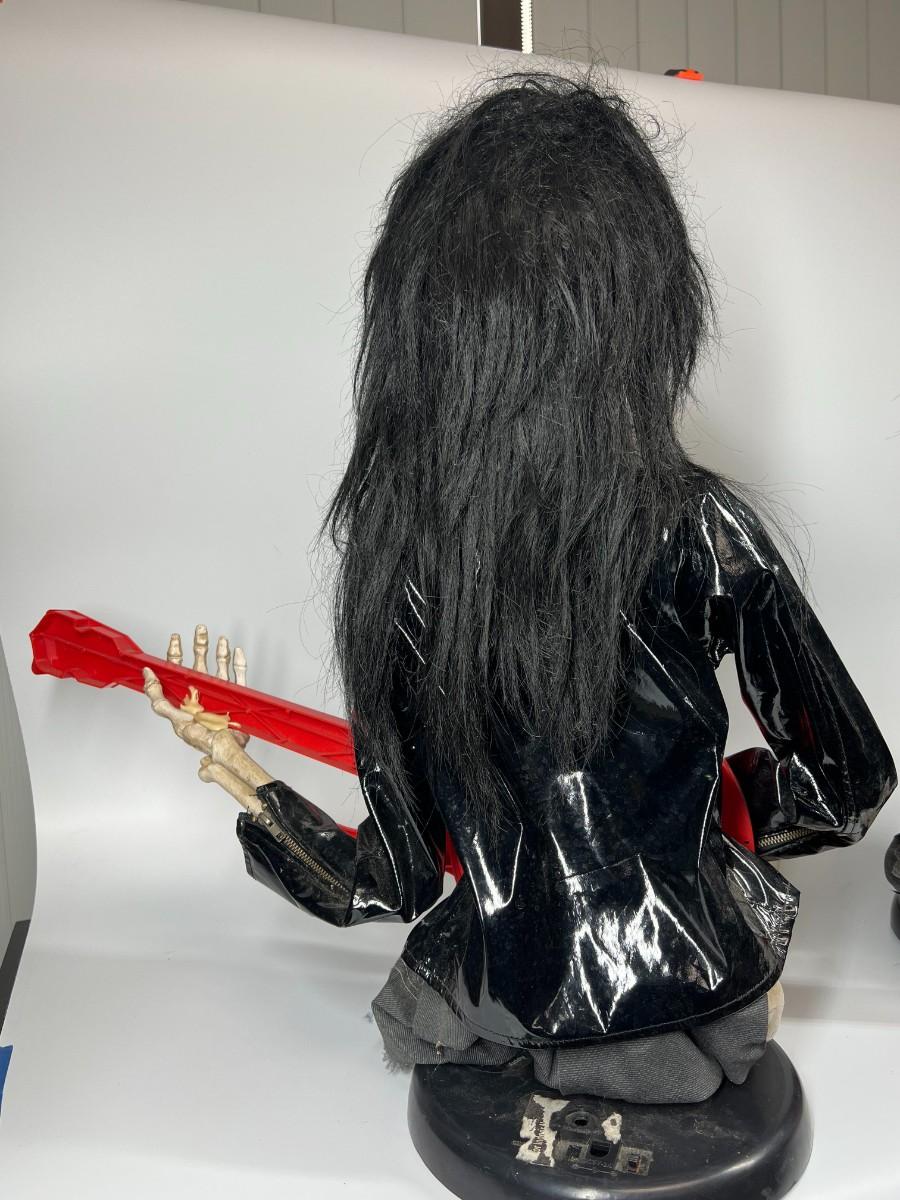 Pair of creepy guitar playing skeletons. Battery operated, light up and musical, Tested and both are working. Large, sitting size is over 20" plus.