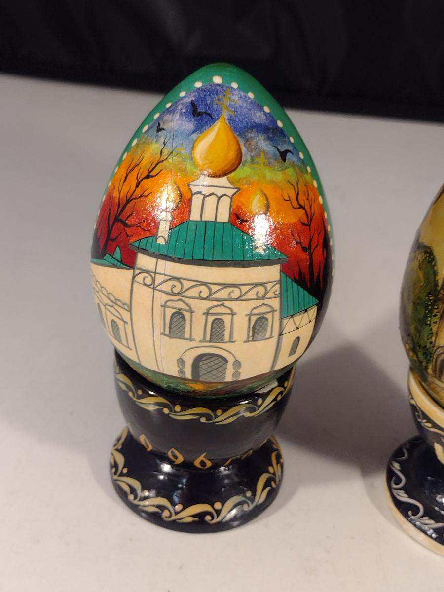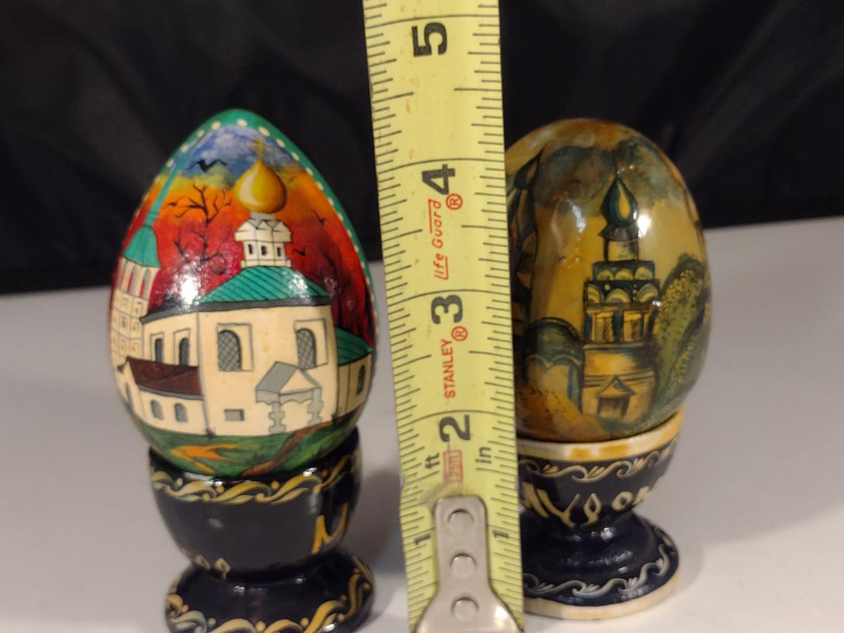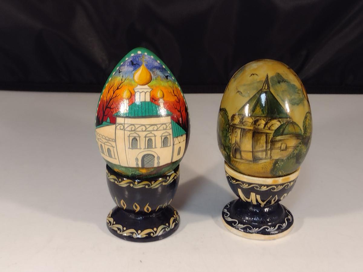 Pair of Hand Painted Russian Lacquer Eggs with Cup Stands