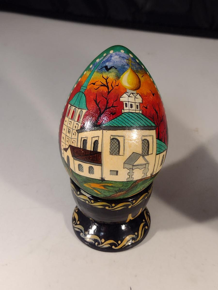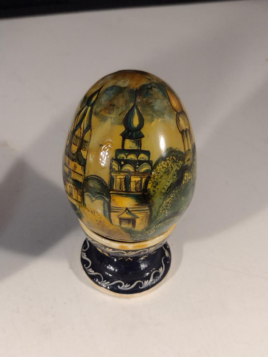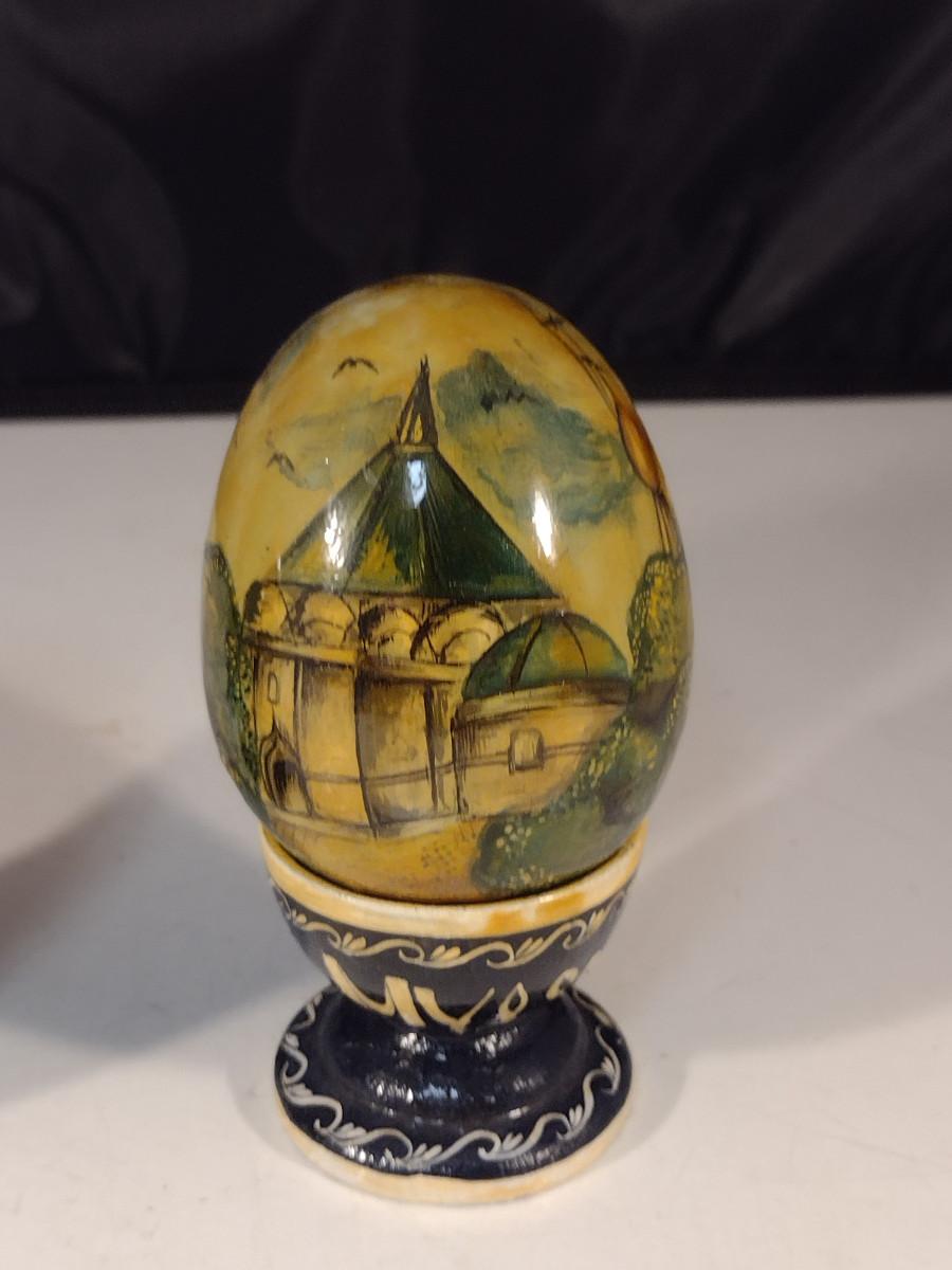 Pair of Hand Painted Russian Lacquer Eggs with Cup Stands