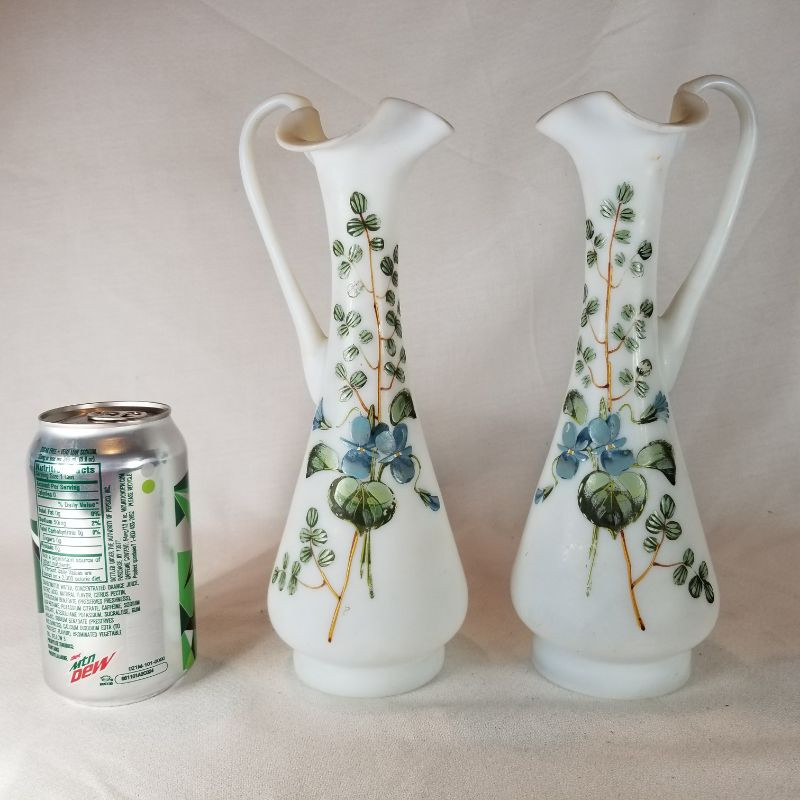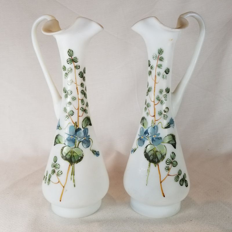 This offering is a beautiful pair of hand-painted, hand-blown vases or narrow pitchers if you prefer. Very nice satin milk glass. Very small amount of missing paint but consistent with age. They are 10-inches tall and would look marvelous on any dressing table or mantel.