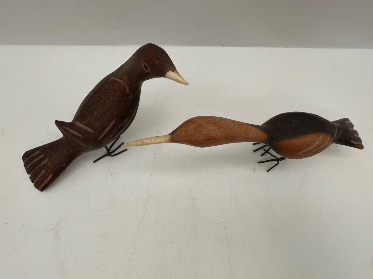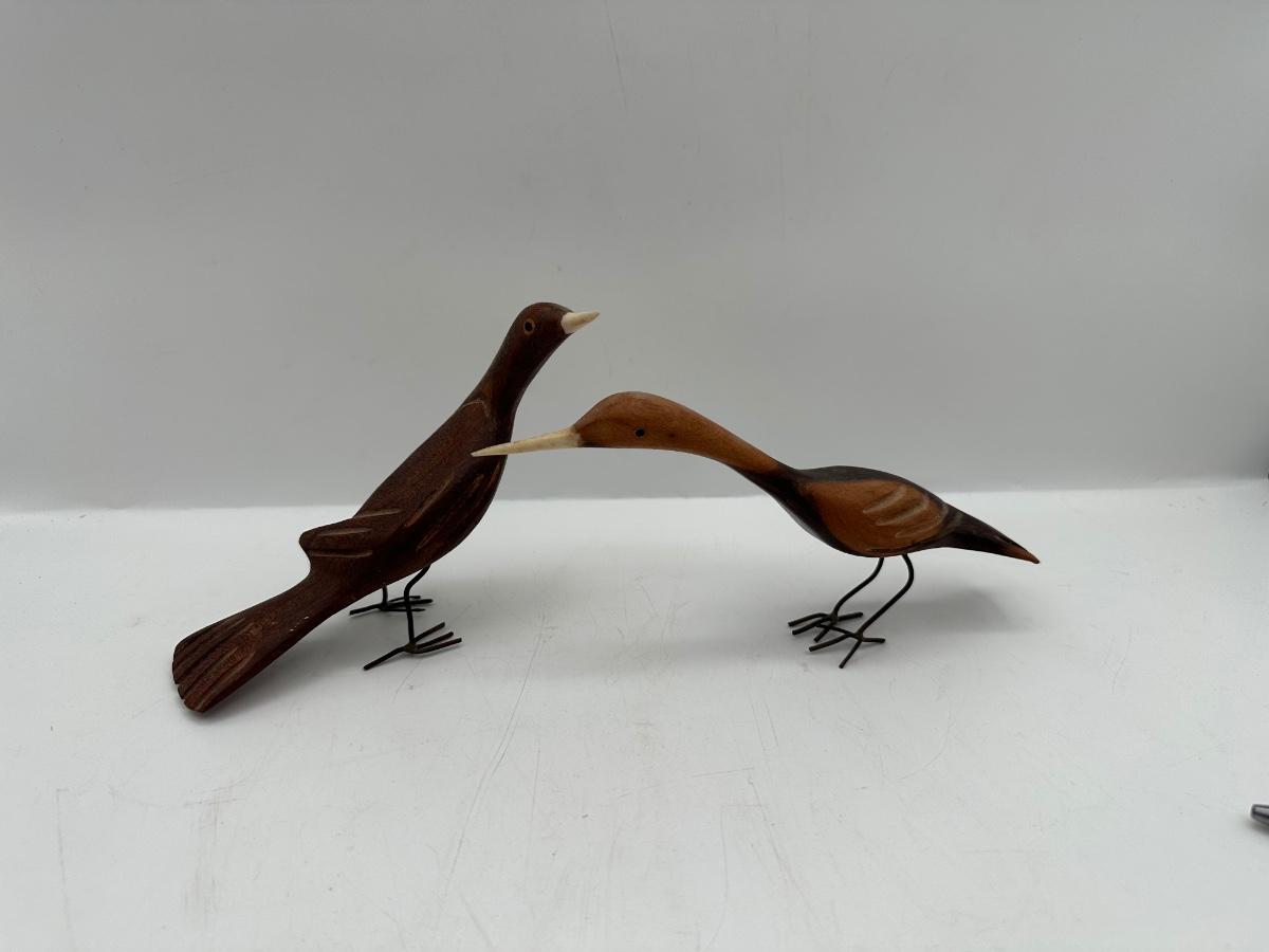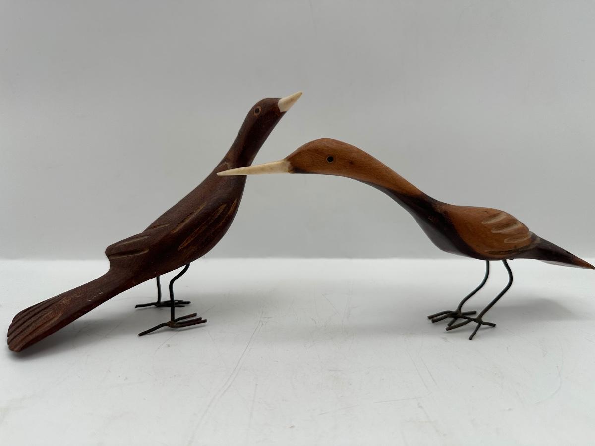 Pair of Hand-Carved Wooden Birds with Wire Legs