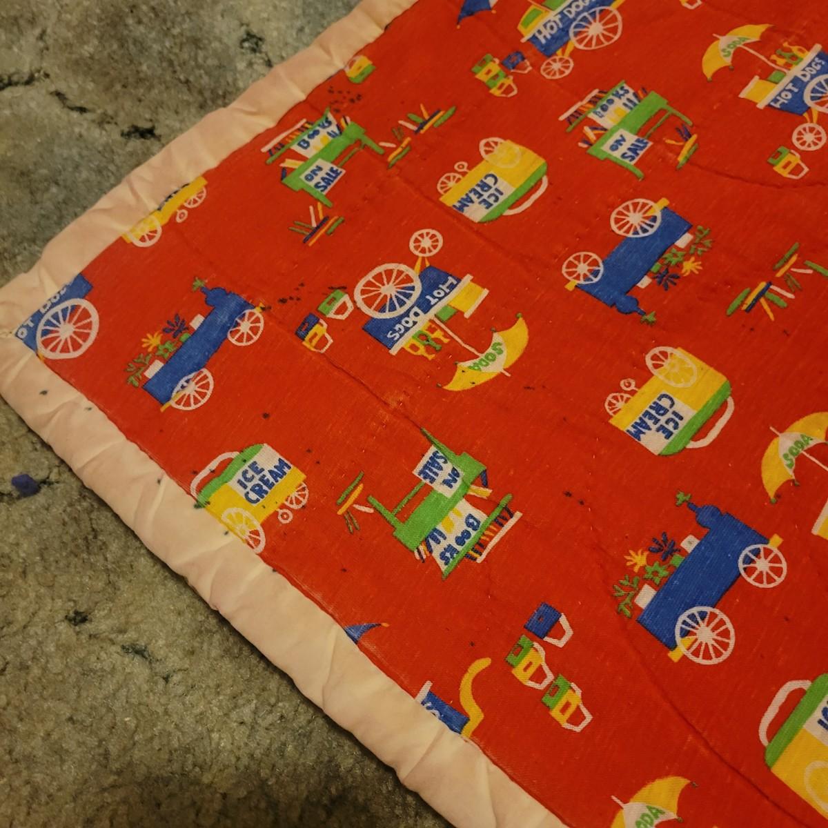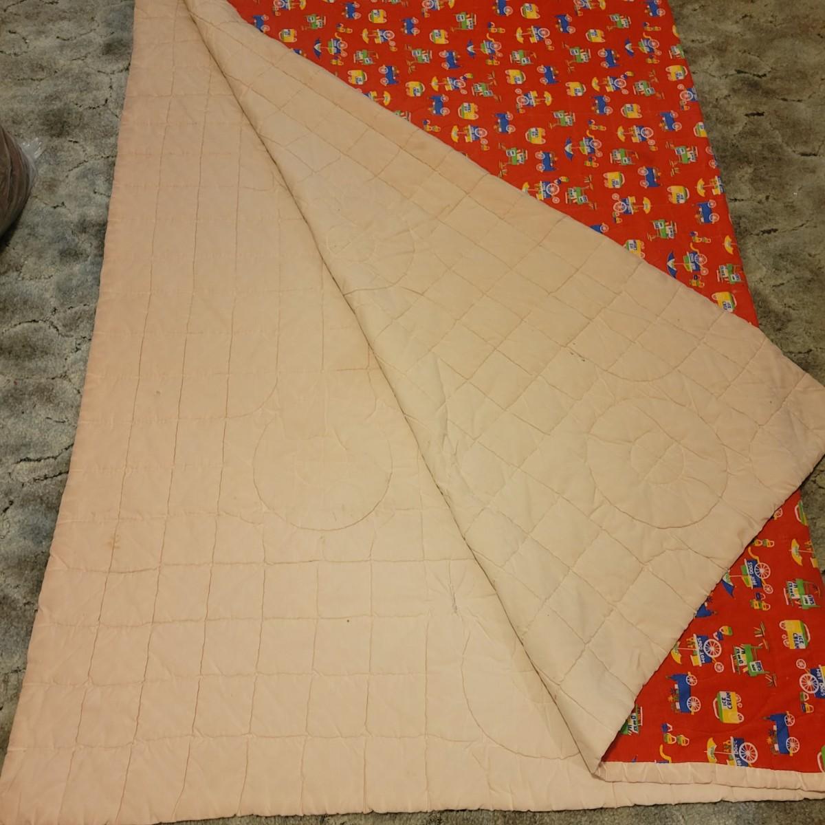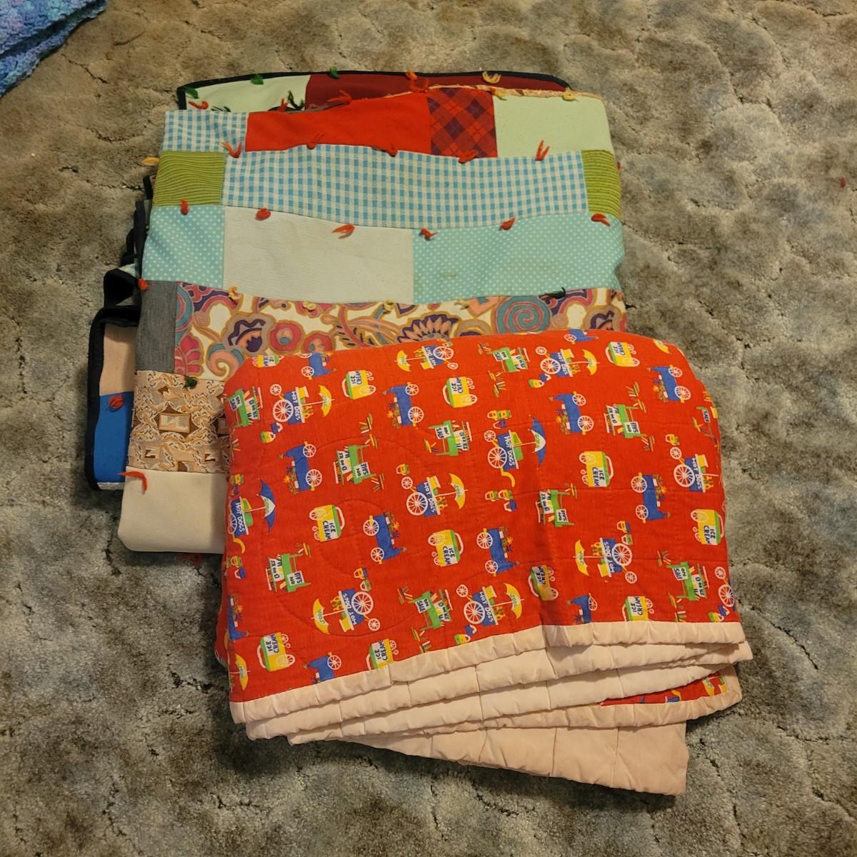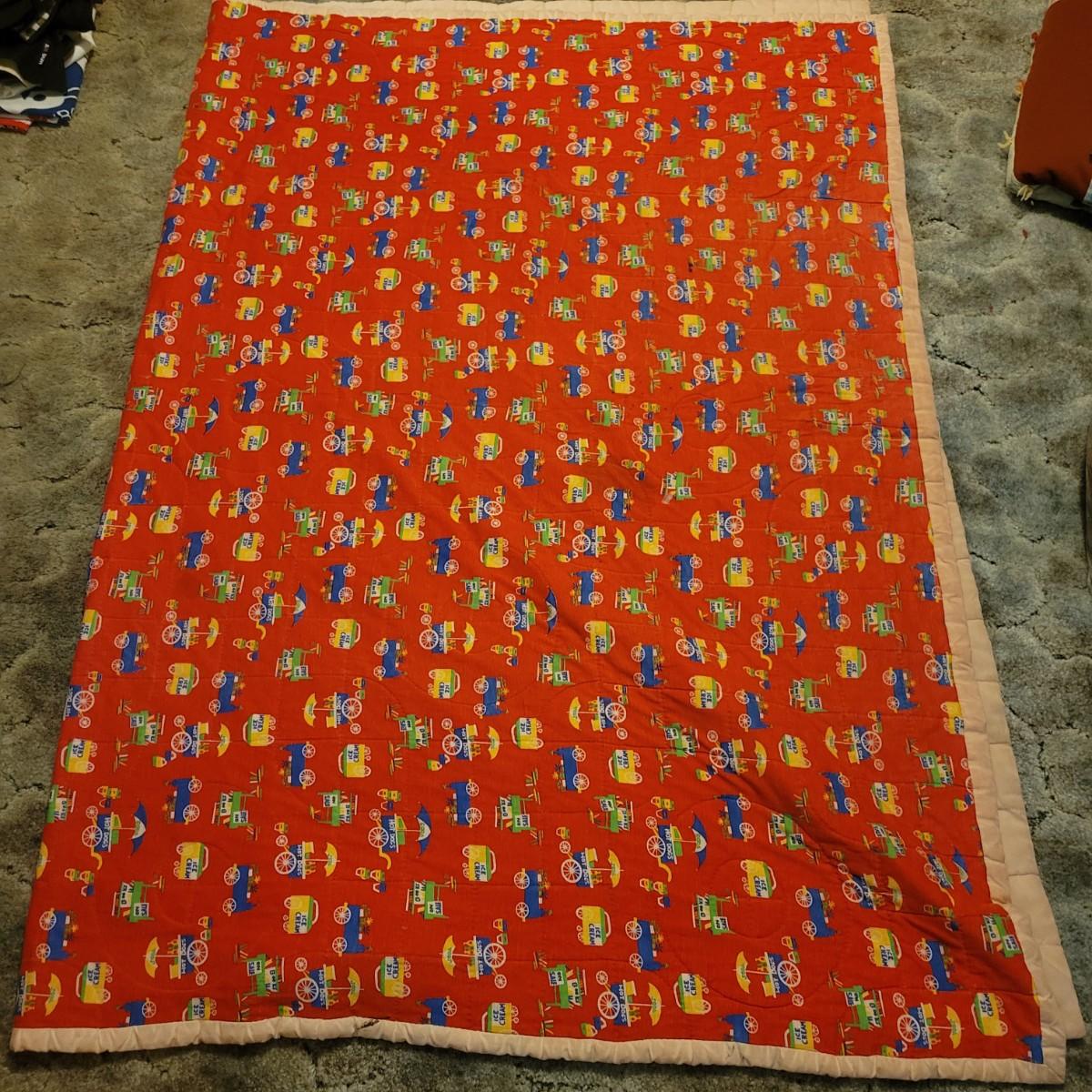 A pair of handcrafted quilts in fair condition with both pieces having some stains. One quilt has red fabric with ice cream and hot dog carts and is cream on the other side. Measures approximately 58" x 82". The other quilt is a patchwork of different fabric panels with yarn accent knots, other side is a dark blue fabric. Measures approximately 92" x 100" Shipping available