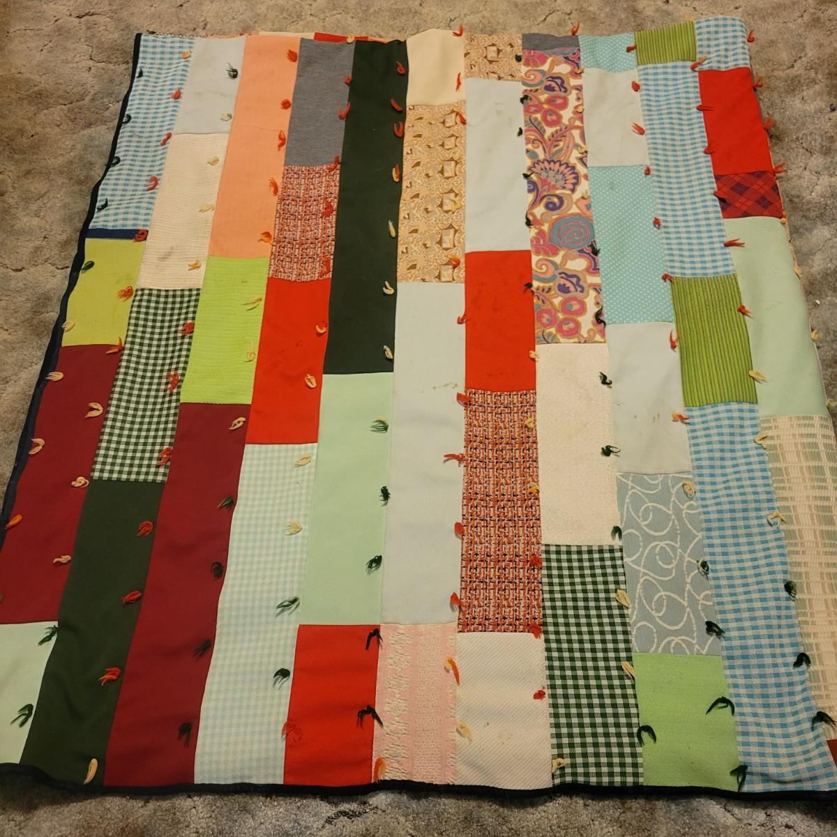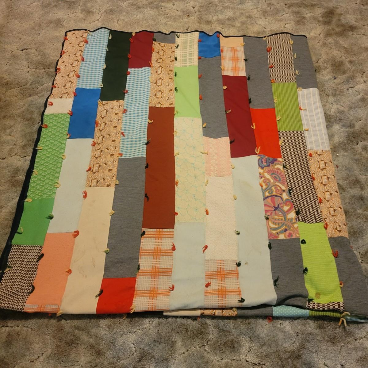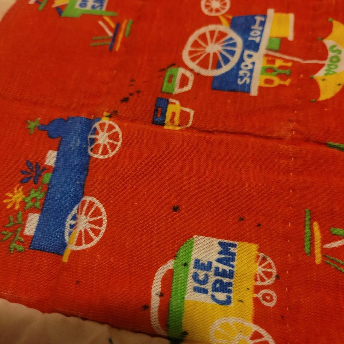 A pair of handcrafted quilts in fair condition with both pieces having some stains. One quilt has red fabric with ice cream and hot dog carts and is cream on the other side. Measures approximately 58" x 82". The other quilt is a patchwork of different fabric panels with yarn accent knots, other side is a dark blue fabric. Measures approximately 92" x 100" Shipping available