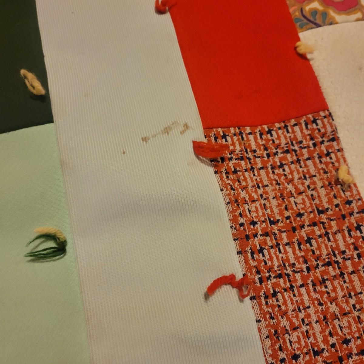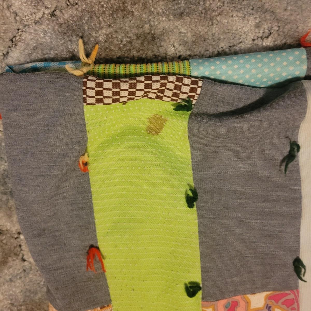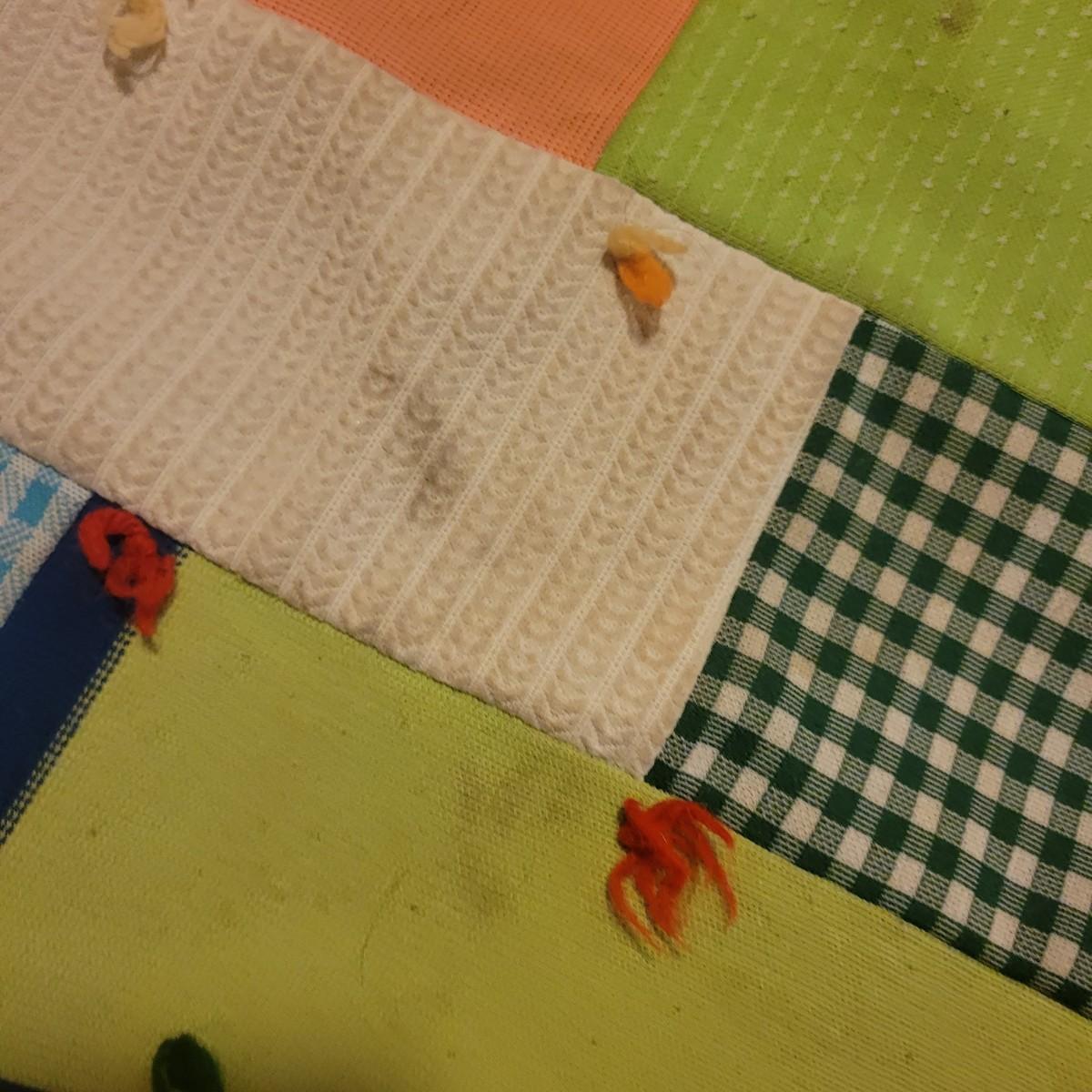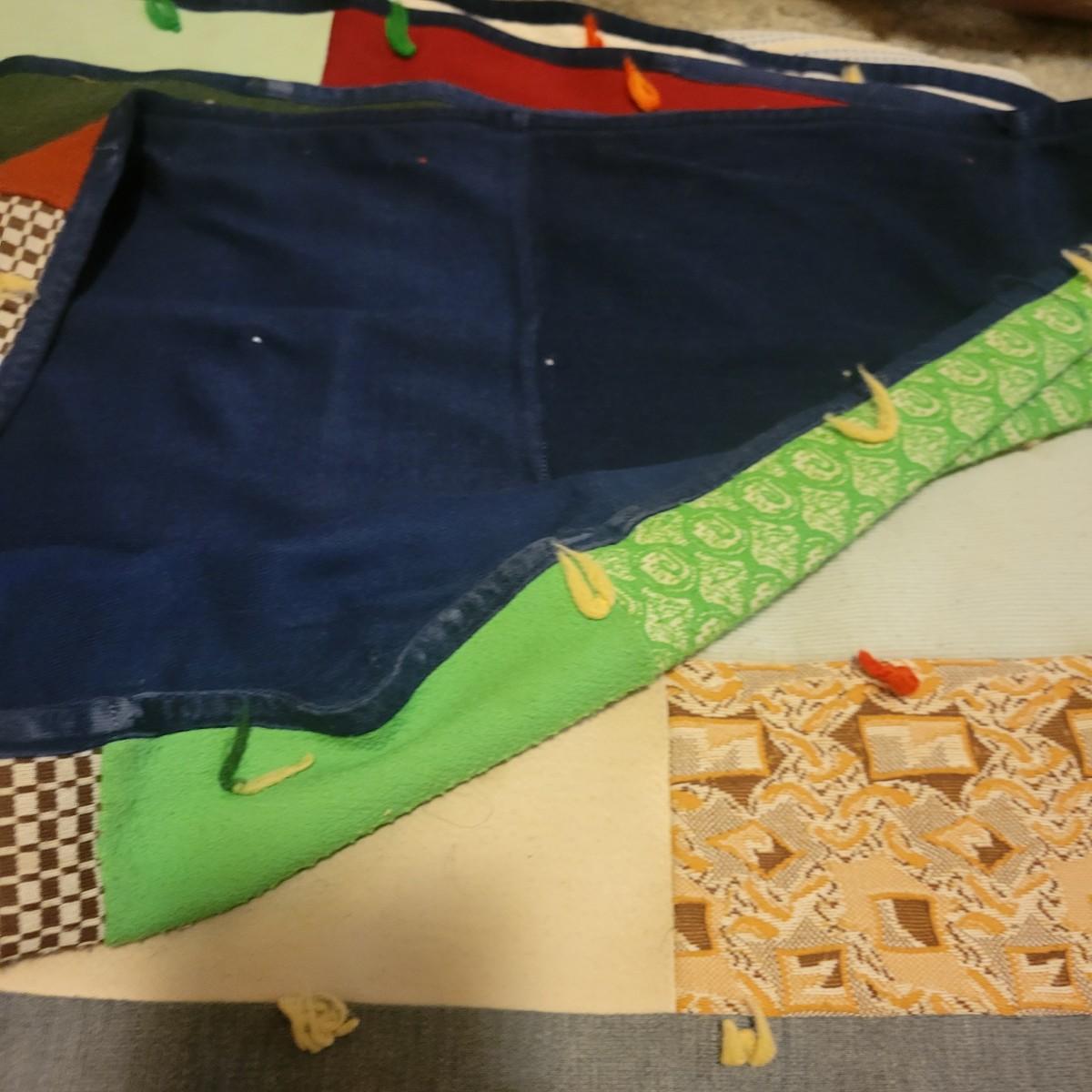 A pair of handcrafted quilts in fair condition with both pieces having some stains. One quilt has red fabric with ice cream and hot dog carts and is cream on the other side. Measures approximately 58" x 82". The other quilt is a patchwork of different fabric panels with yarn accent knots, other side is a dark blue fabric. Measures approximately 92" x 100" Shipping available