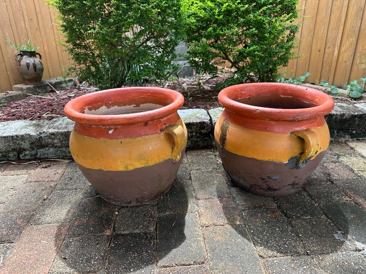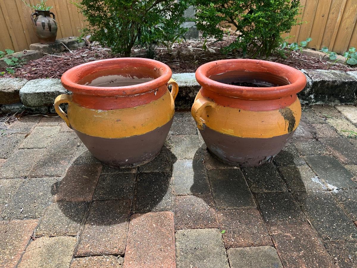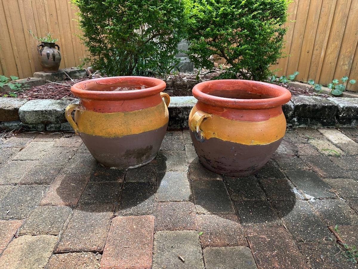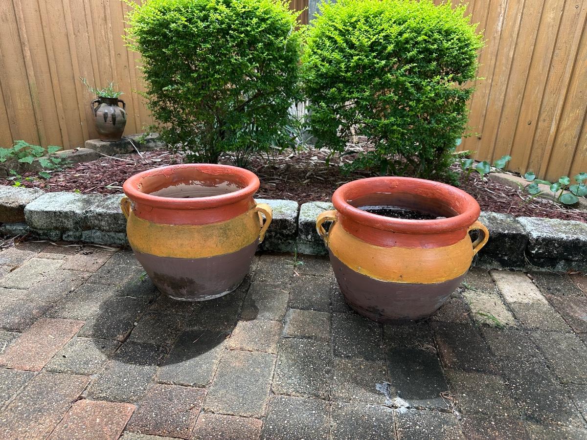 Set of two large terracotta planters with side handles. Painted