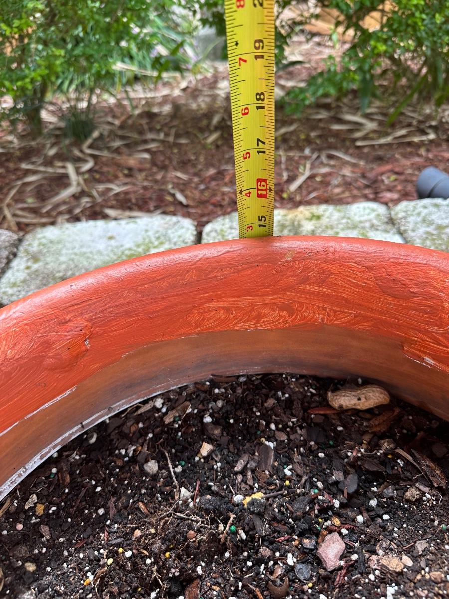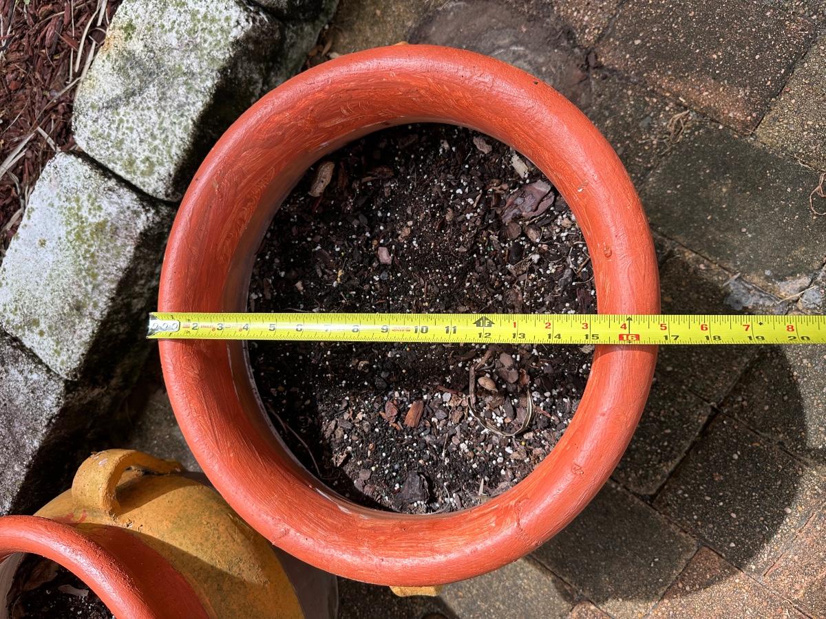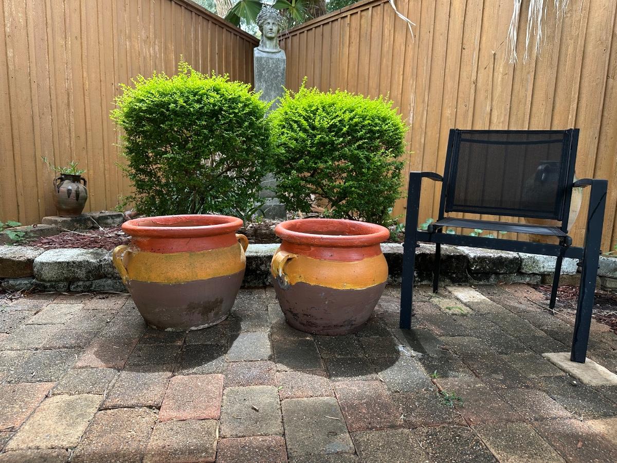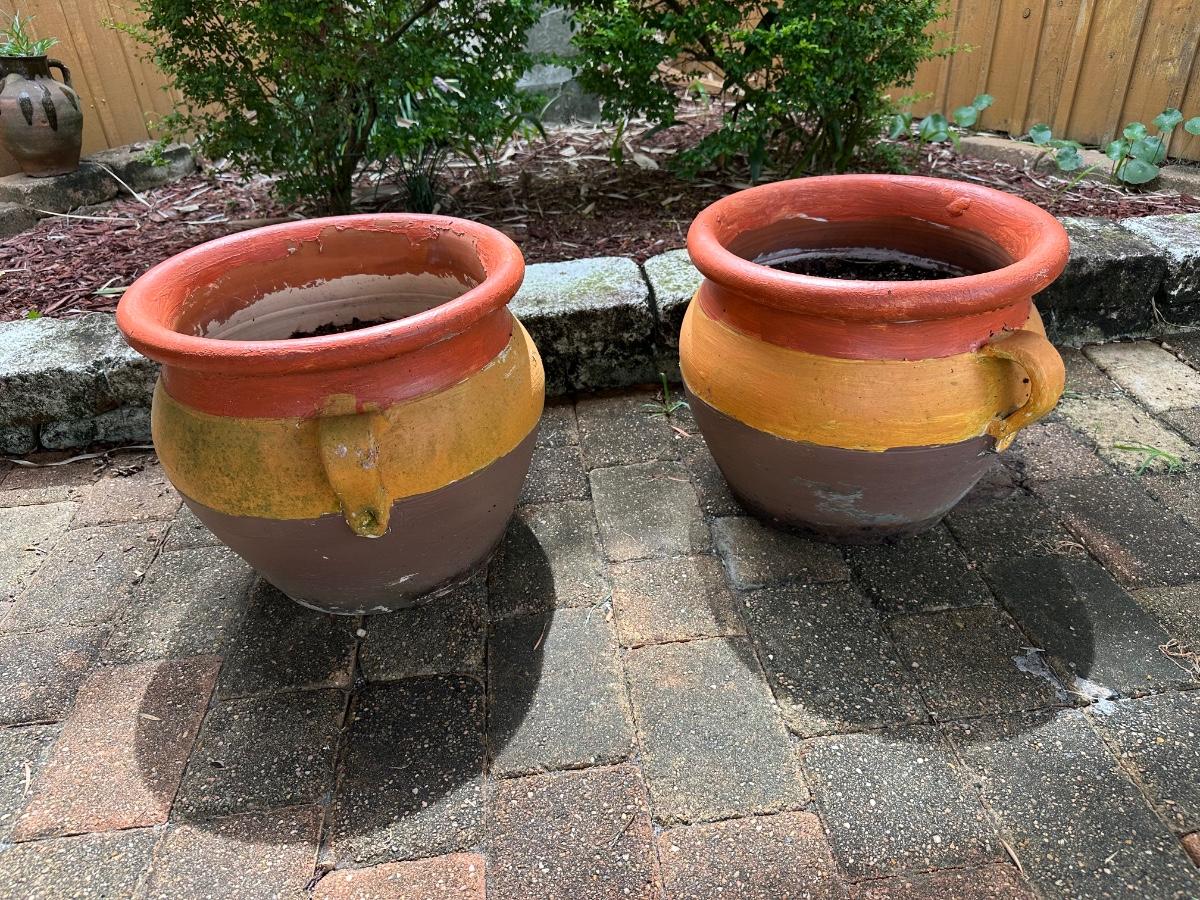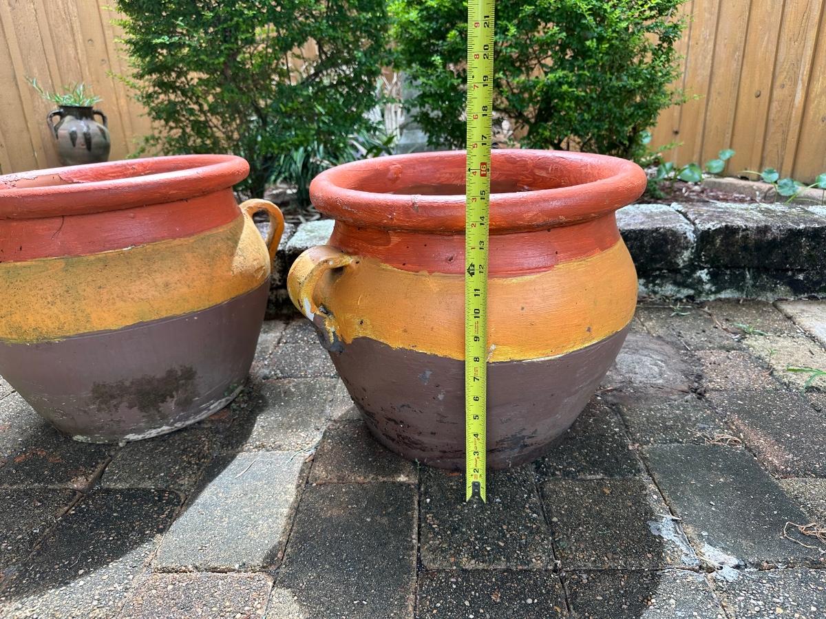 Set of two large terracotta planters with side handles. Painted