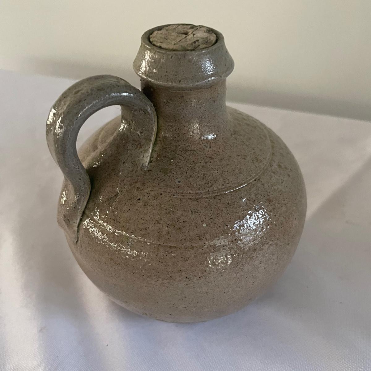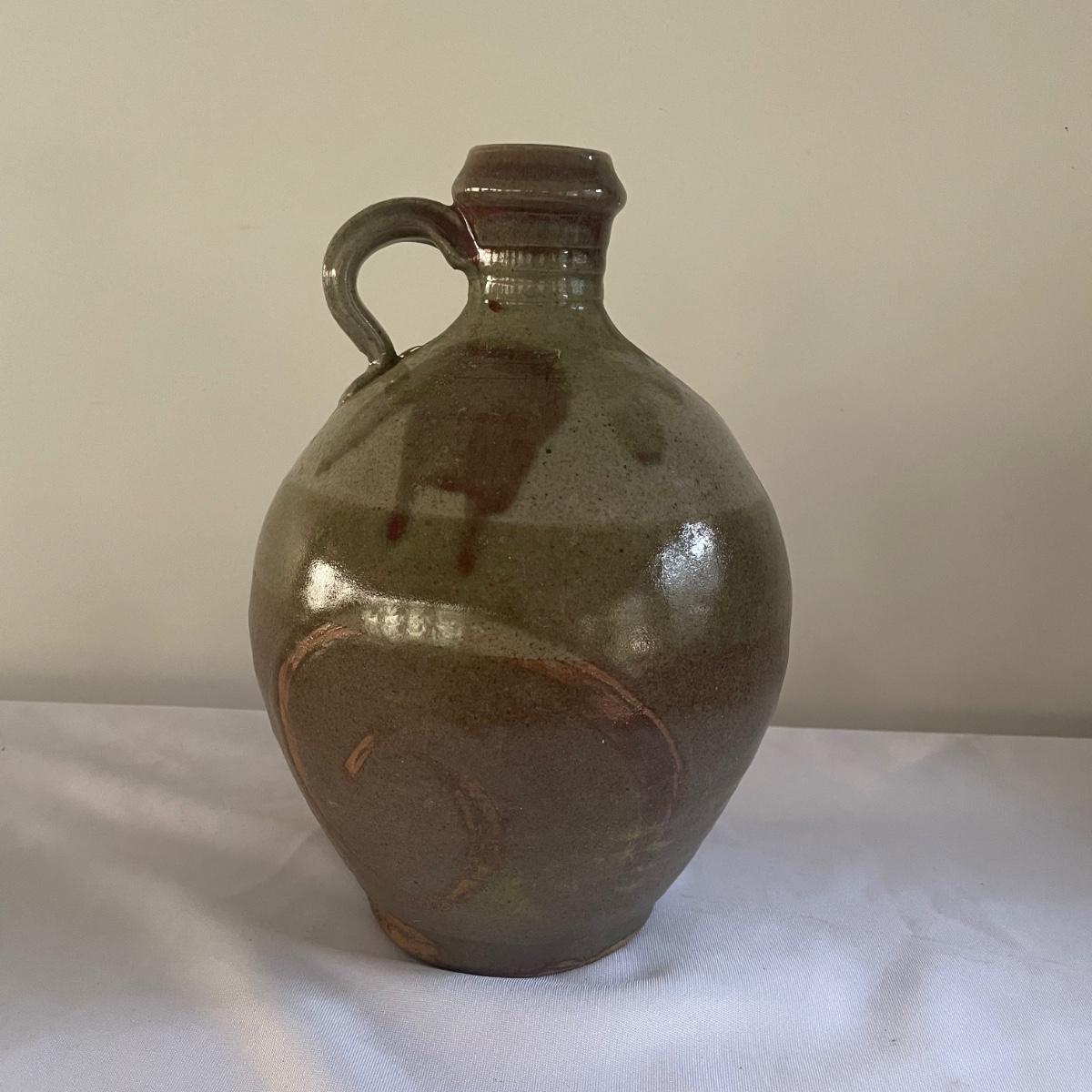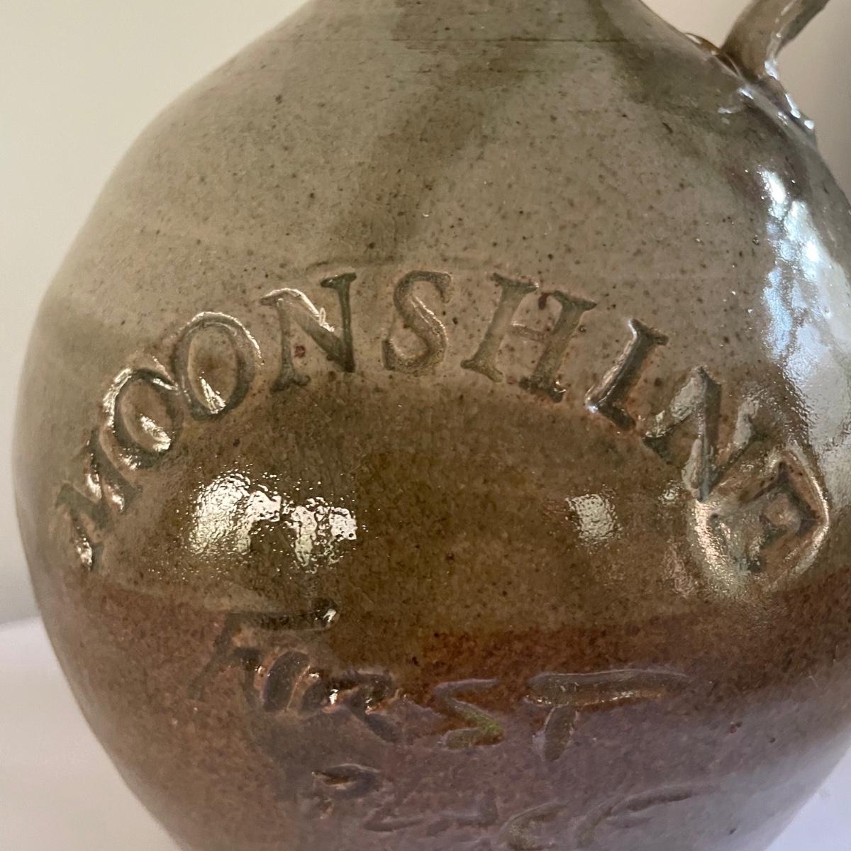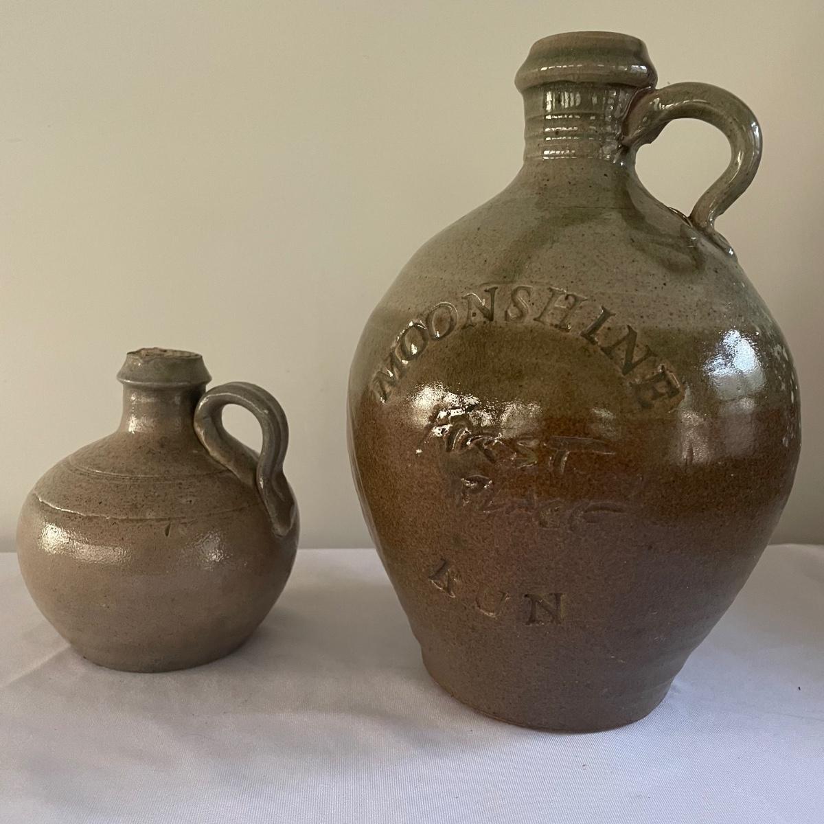 The larger pottery jug measures 4” d x 10”; it has "Moonshine Run" stamped into the side. Markings pertain to an event and not to the maker of the piece. It’s paired with a smaller jug that has the maker's stamp which is indecipherable.