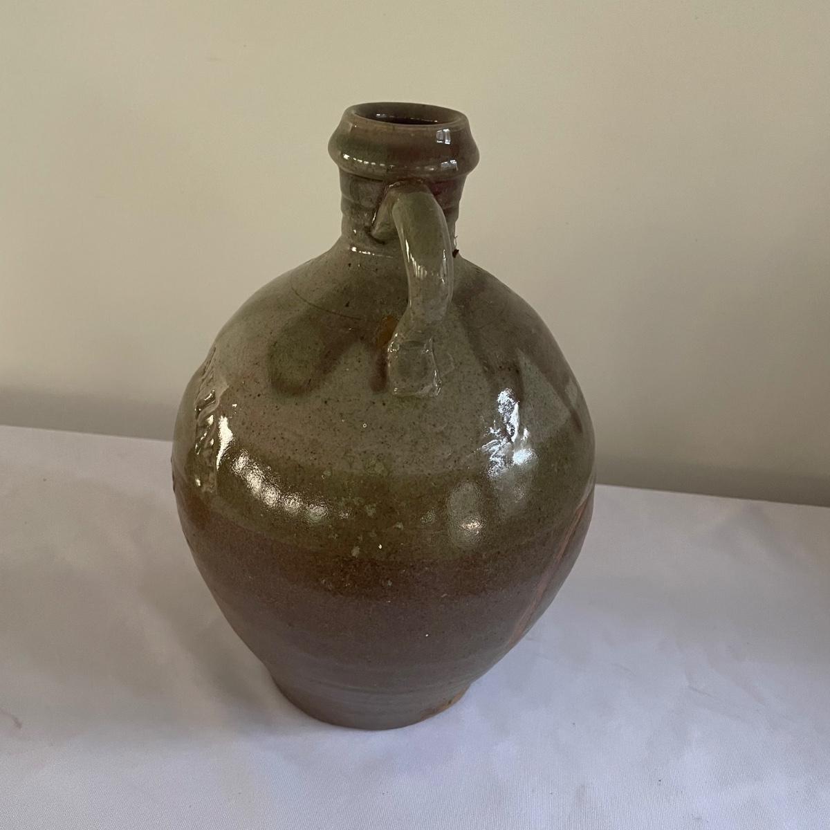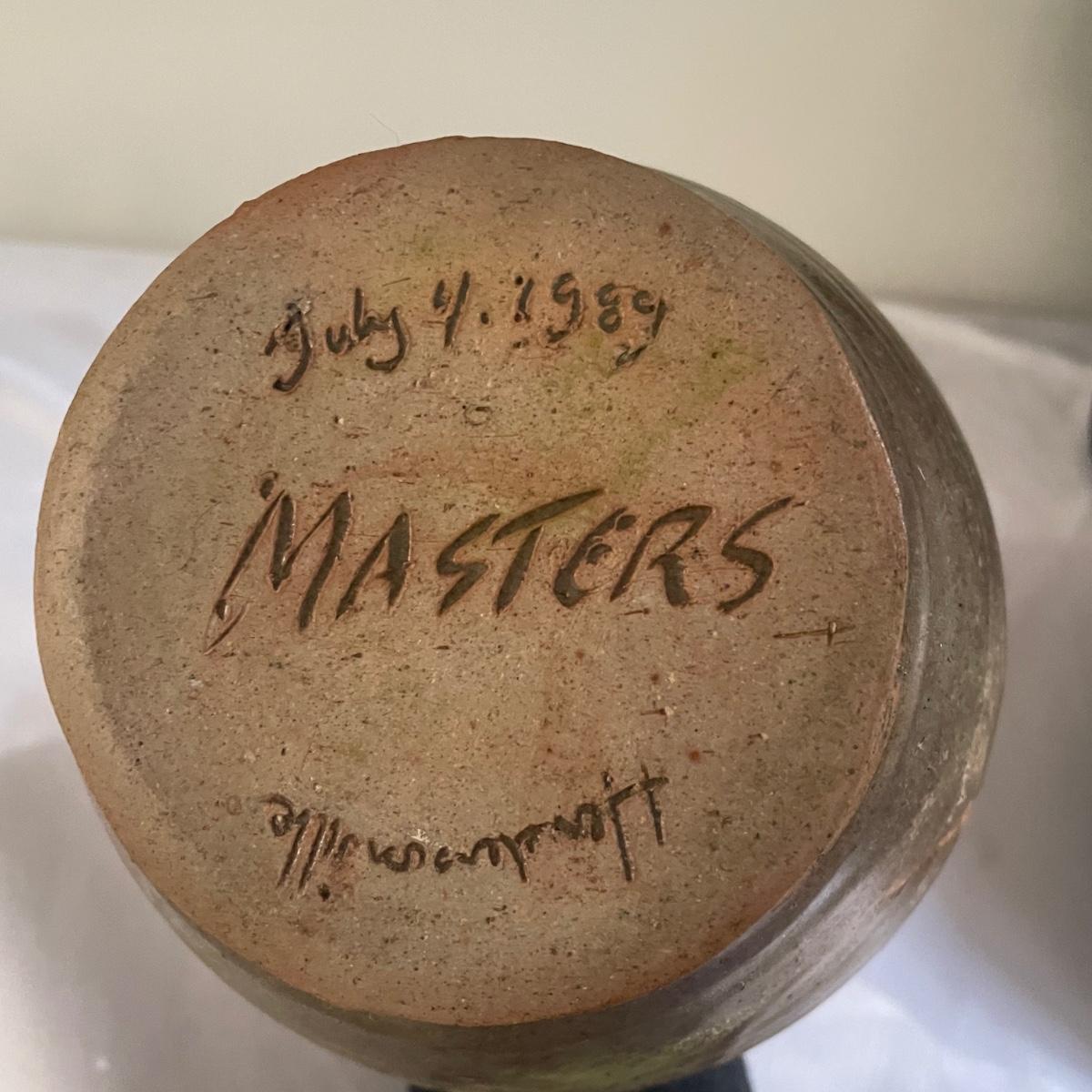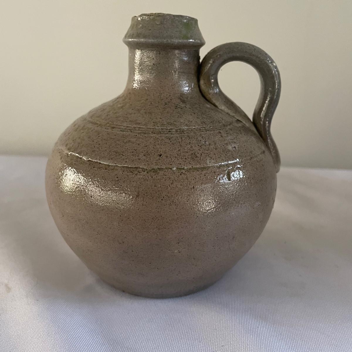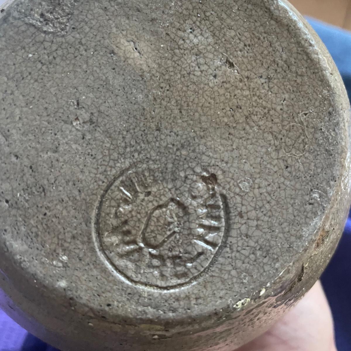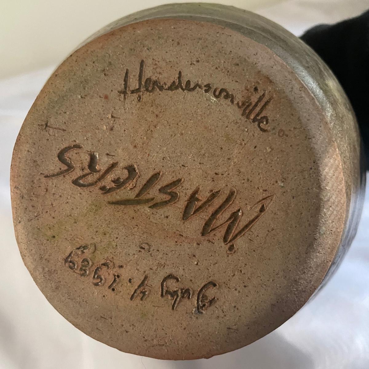 The larger pottery jug measures 4” d x 10”; it has "Moonshine Run" stamped into the side. Markings pertain to an event and not to the maker of the piece. It’s paired with a smaller jug that has the maker's stamp which is indecipherable.