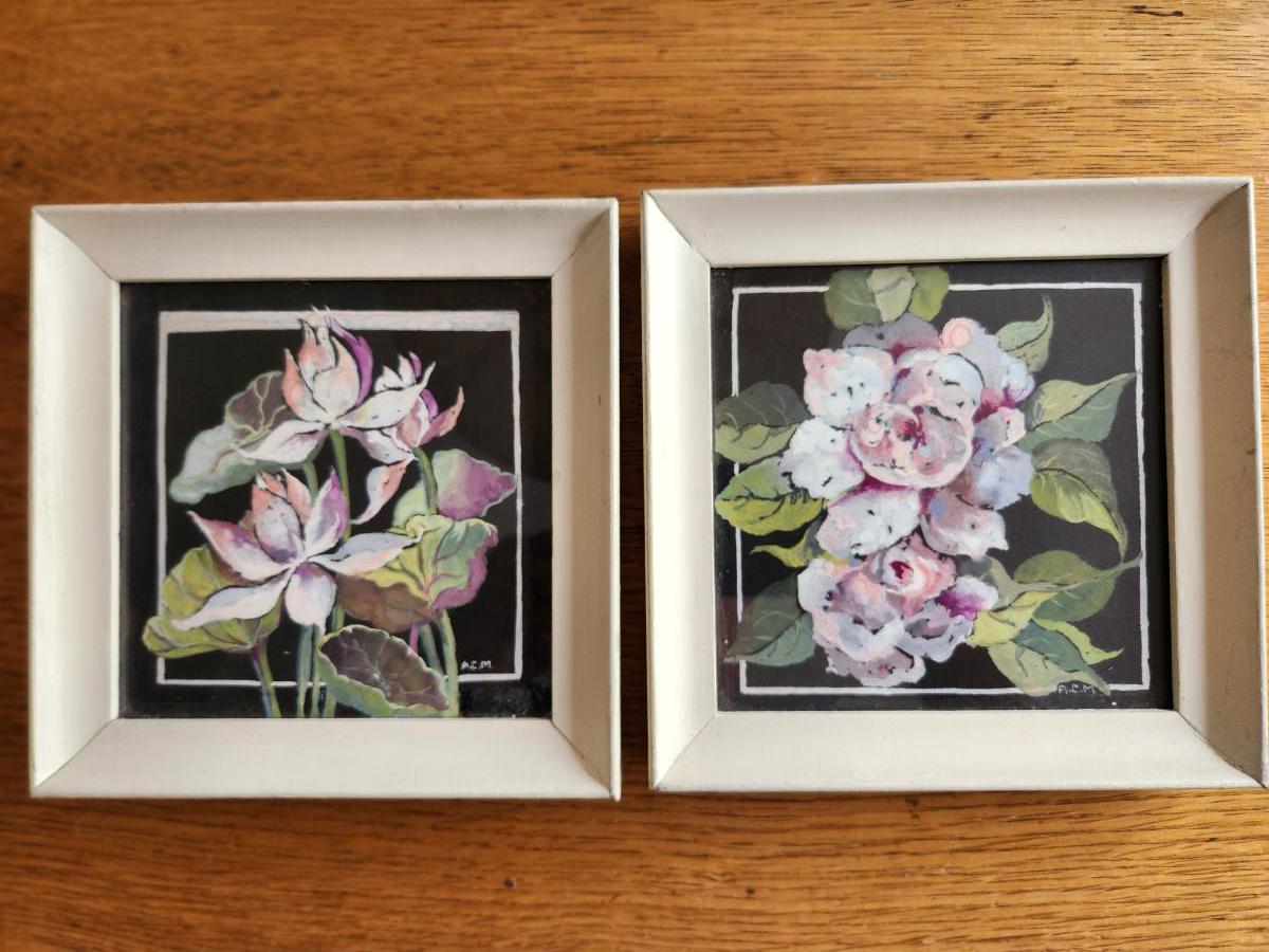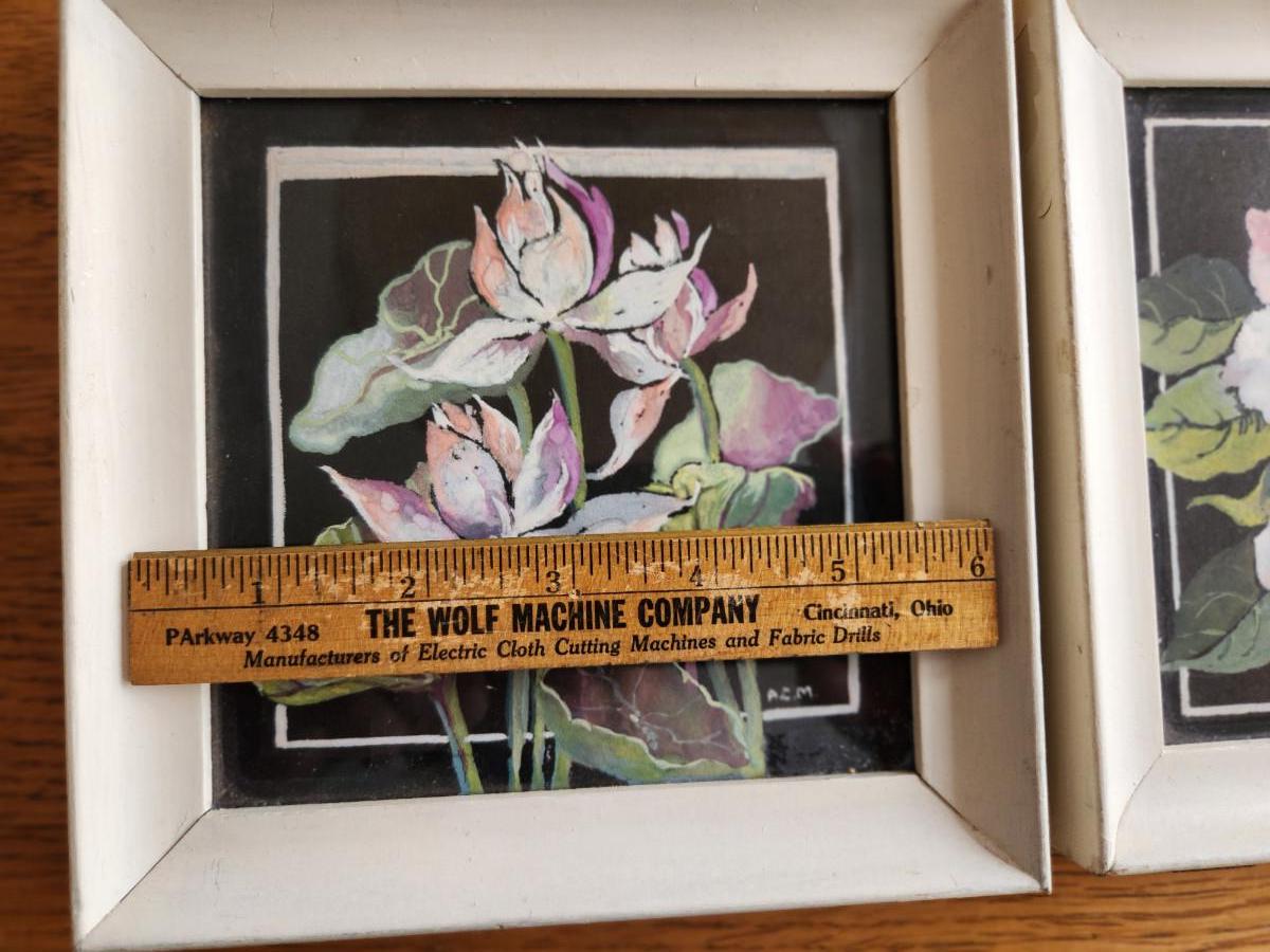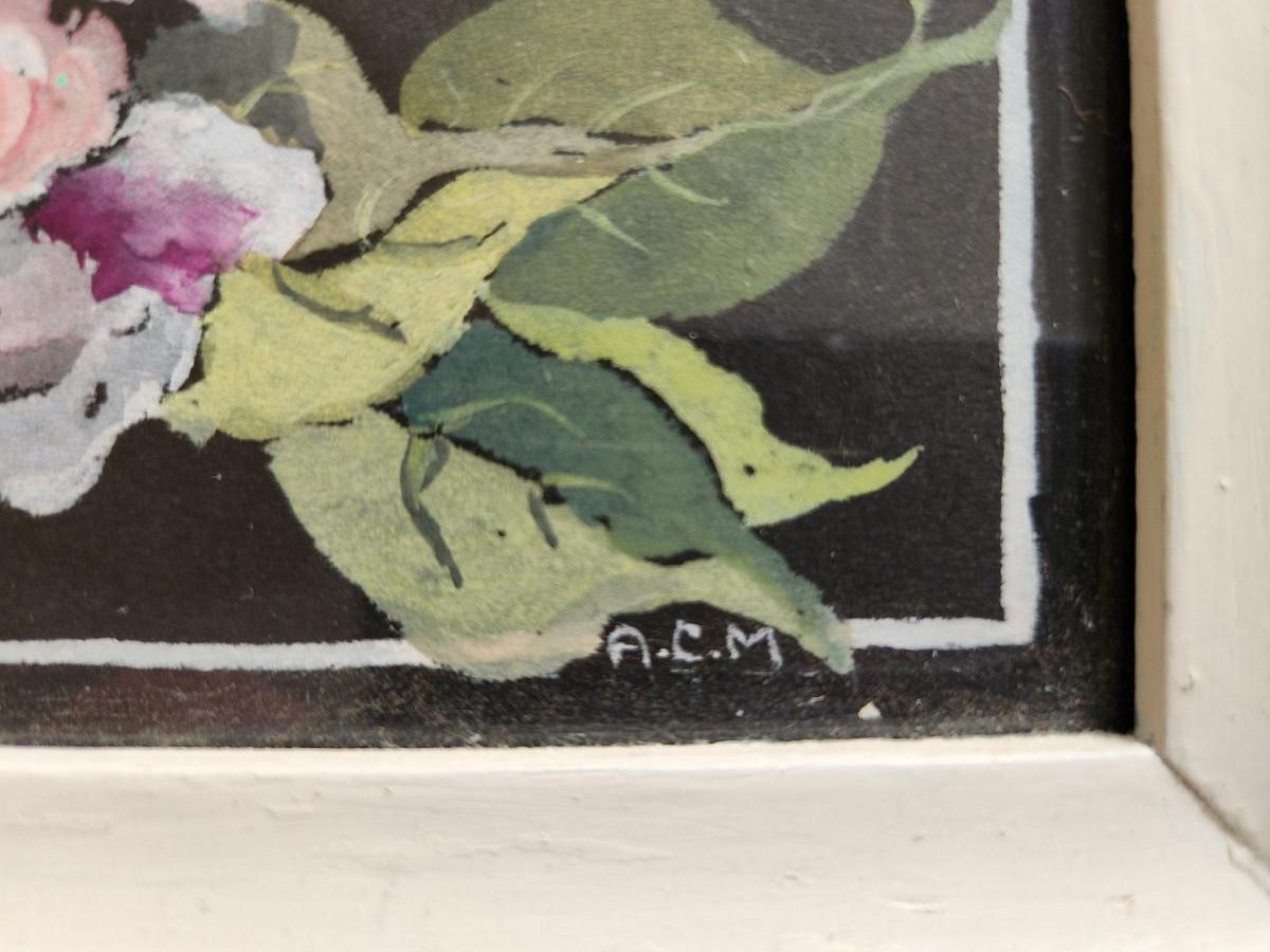 This auction lot is for a Pair of Hand-Painted Flower Pictures. These nicely painted pictures appear to be oil on board. They are both signed with the initials ACM. The painting are framed in a 1950's style. Great for most any wall, but would look great in a ladies boudoir with similar colors. See photo for sizing.