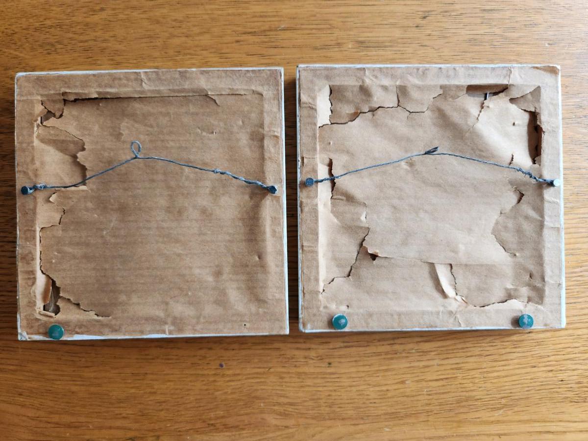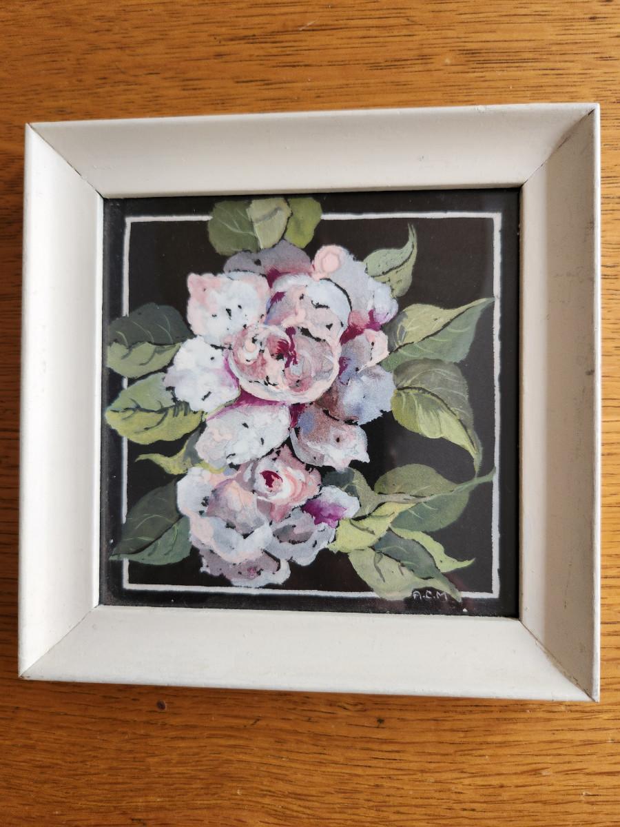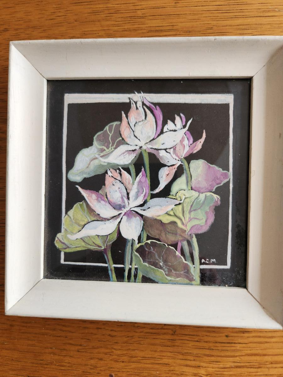 This auction lot is for a Pair of Hand-Painted Flower Pictures. These nicely painted pictures appear to be oil on board. They are both signed with the initials ACM. The painting are framed in a 1950's style. Great for most any wall, but would look great in a ladies boudoir with similar colors. See photo for sizing.