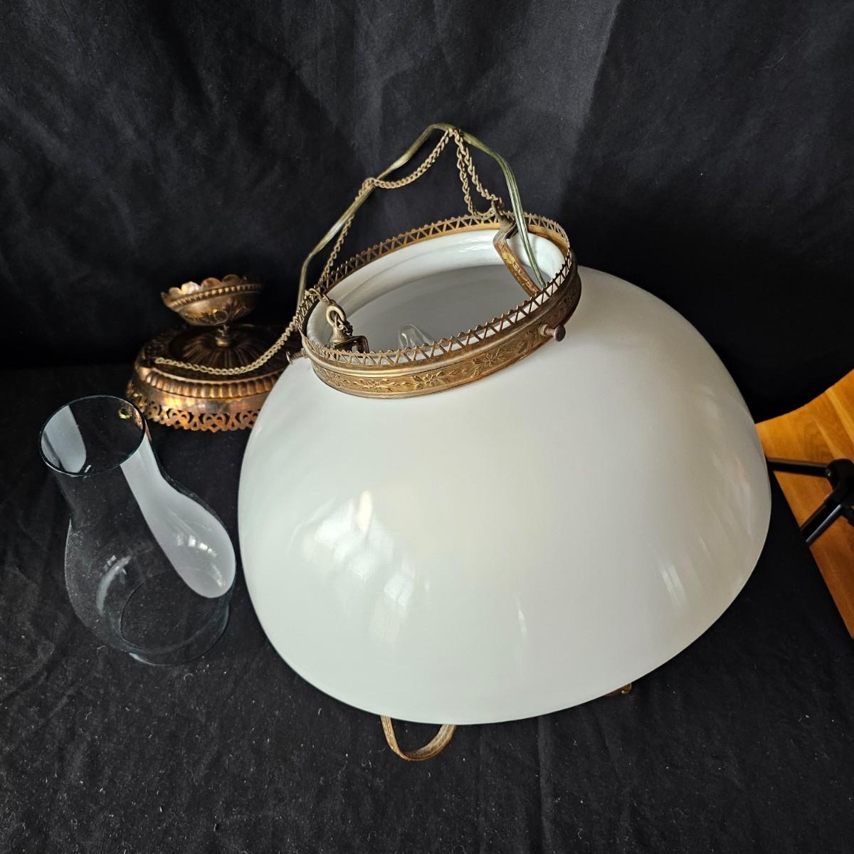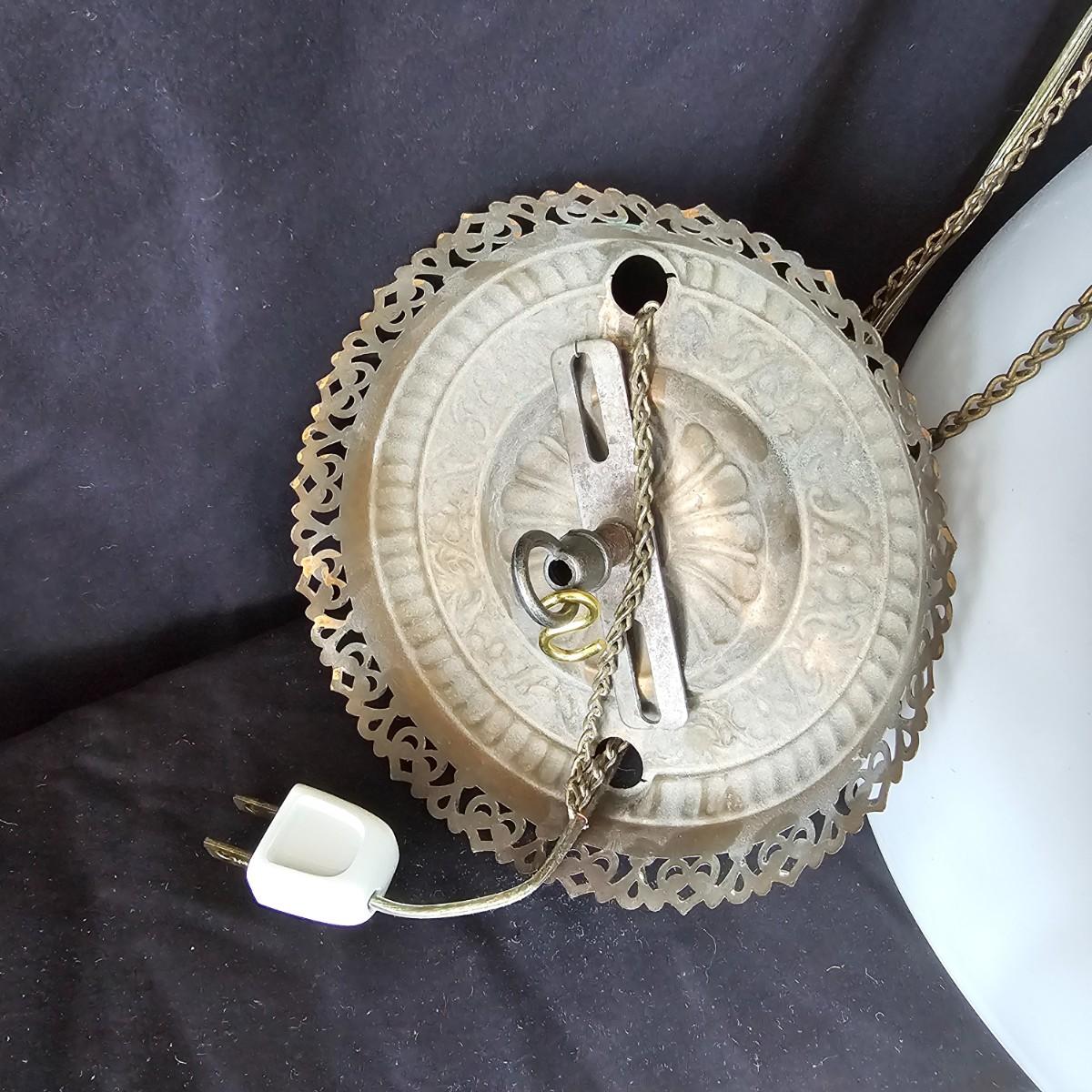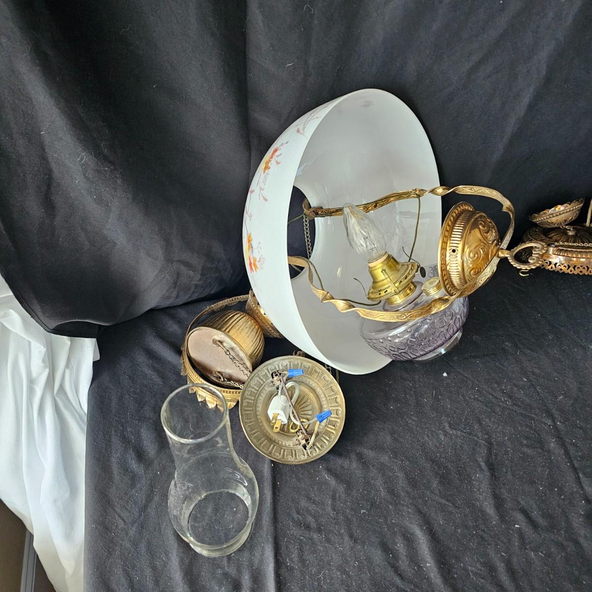 Two vintage style oil lamps converted to electric and designed to hang. Glass shades and chimneys as well as gold crown pieces to complete the look. Both lamps have plugs at the top of their hanging gear, we're custom made for previous location. Lamps measure 13"D x 34"H or length. Note that large white shades are different as well as the clear glass chimneys. Both lamps powered on when plugged in. Includes vintage style bulbs. See photos for details. Local pickup only.