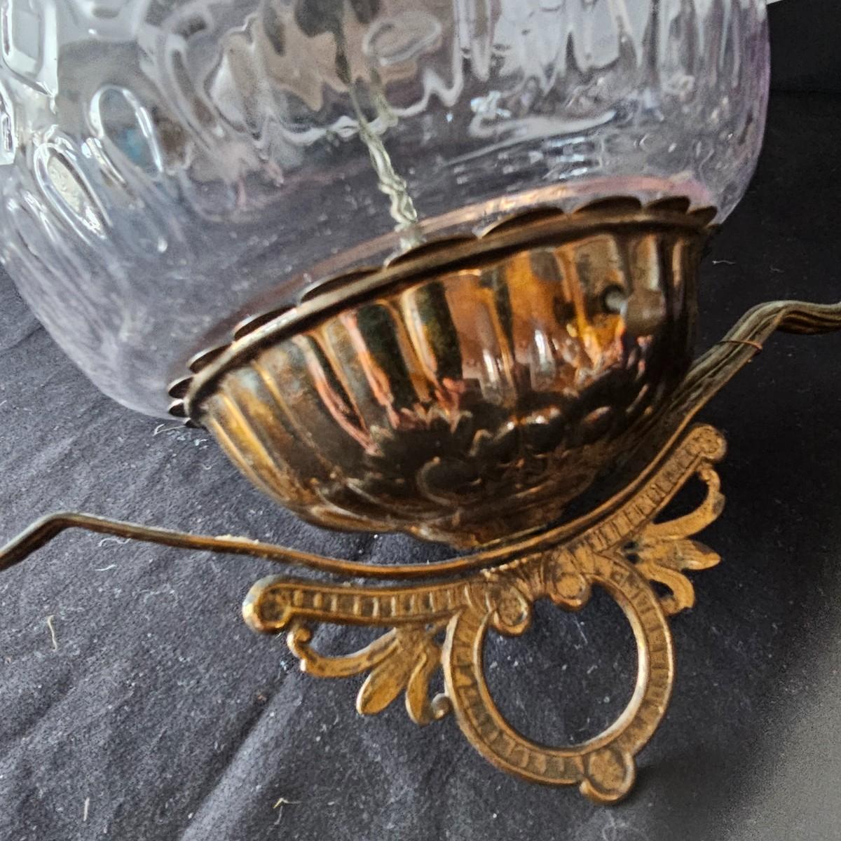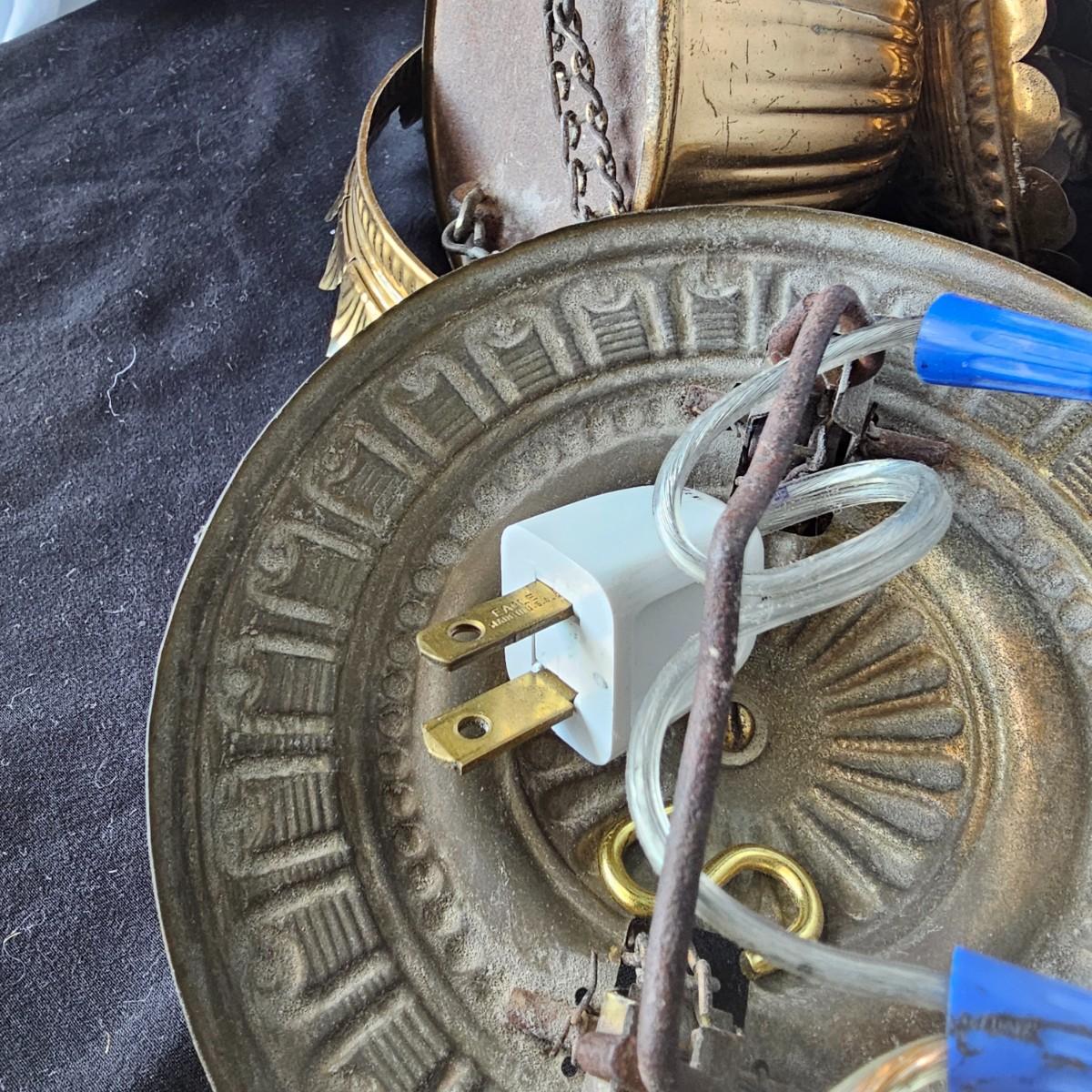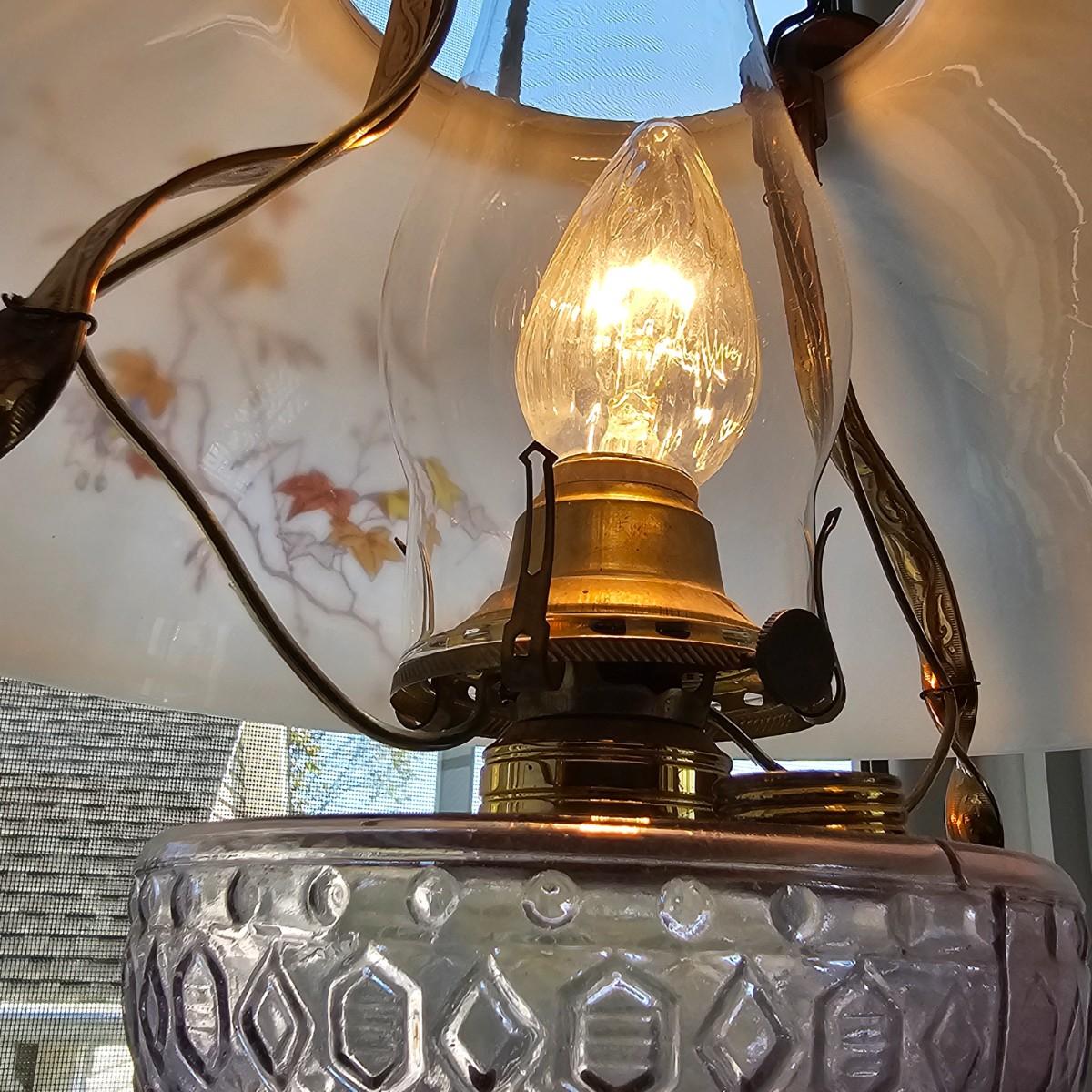 Two vintage style oil lamps converted to electric and designed to hang. Glass shades and chimneys as well as gold crown pieces to complete the look. Both lamps have plugs at the top of their hanging gear, we're custom made for previous location. Lamps measure 13"D x 34"H or length. Note that large white shades are different as well as the clear glass chimneys. Both lamps powered on when plugged in. Includes vintage style bulbs. See photos for details. Local pickup only.