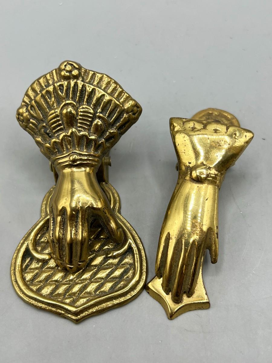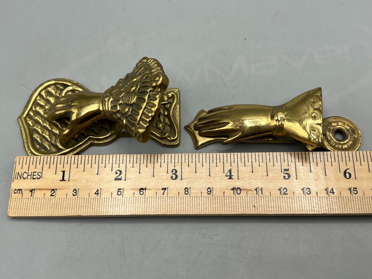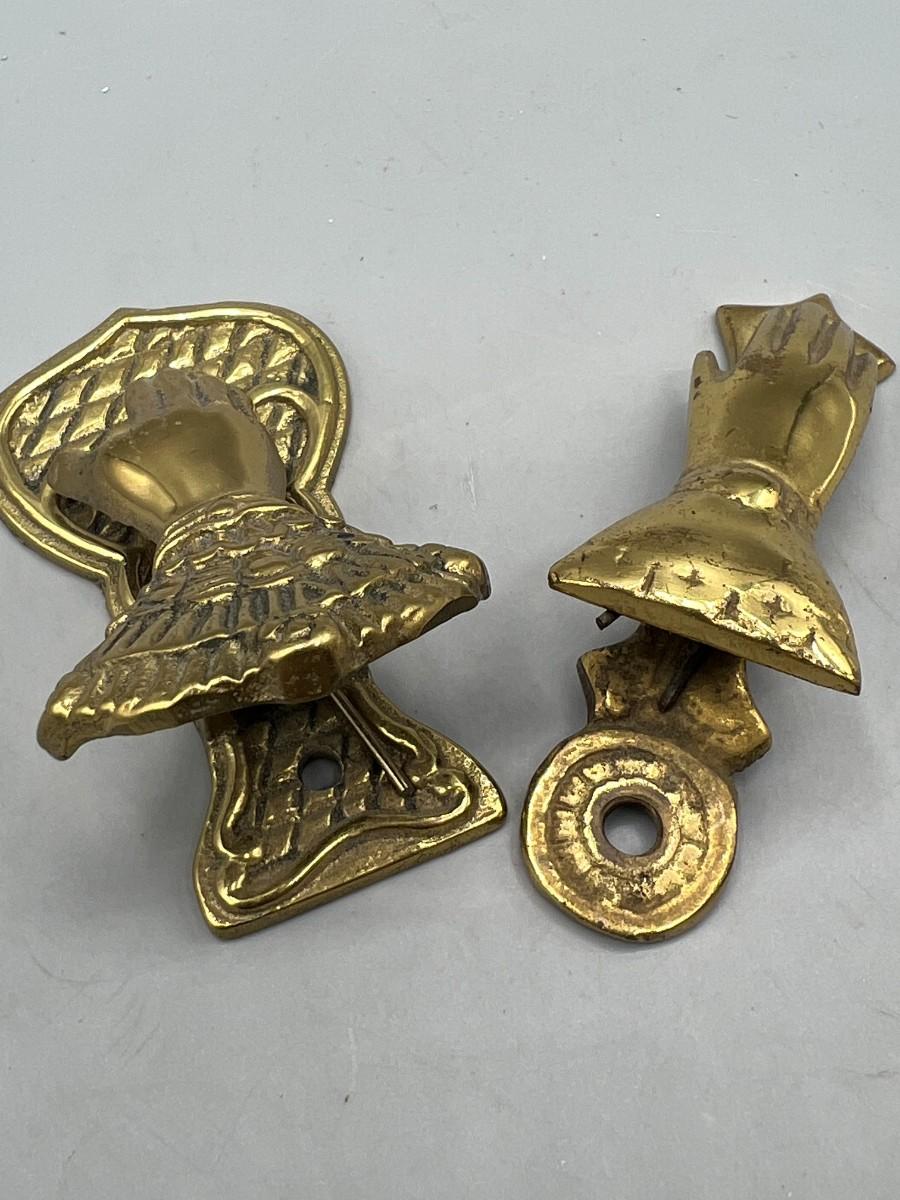 Pair of Hanging Shiny Brass Ladies Hand Paper Clip Note Holders. Small 3" size clips. In good condition.