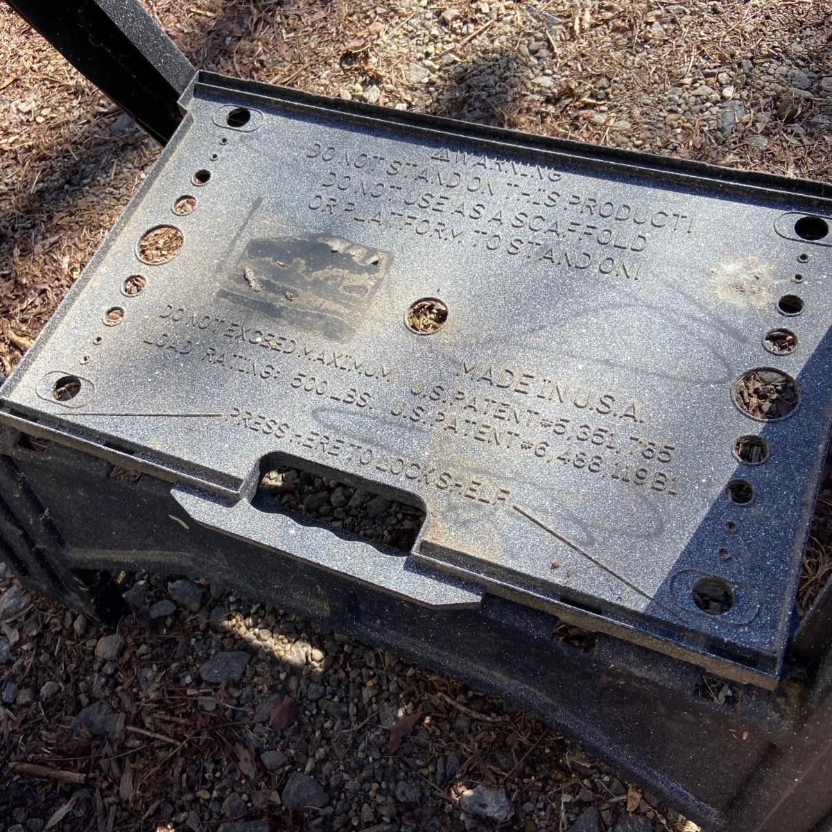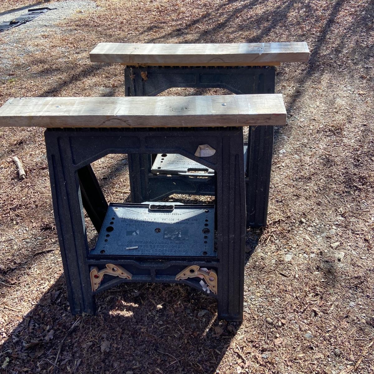 This lot contains two plastic, heavy duty saw horses. They measure 35” x 17” (at the base) x 32”H. They both have a shelf that locks them into place and a 500lb maximum load. Local pick up only.