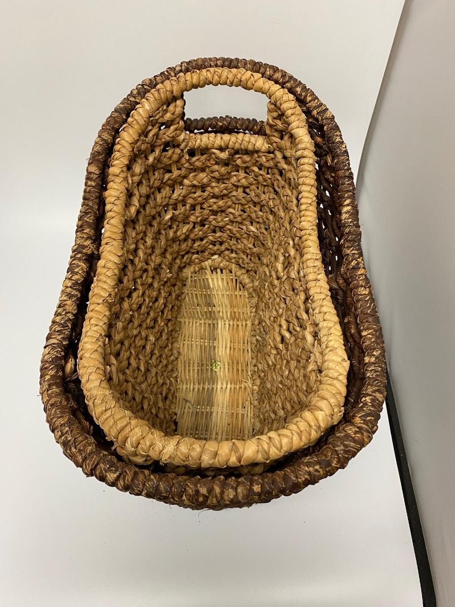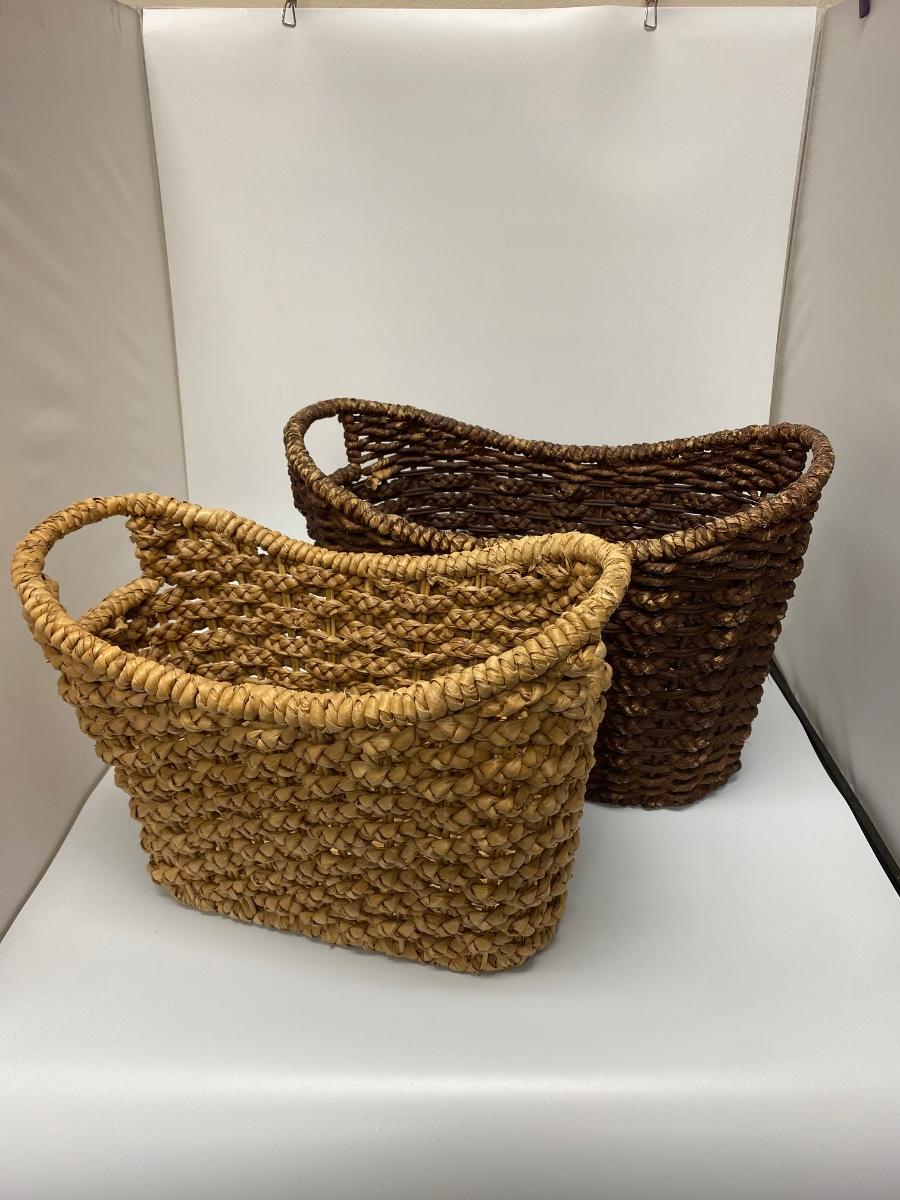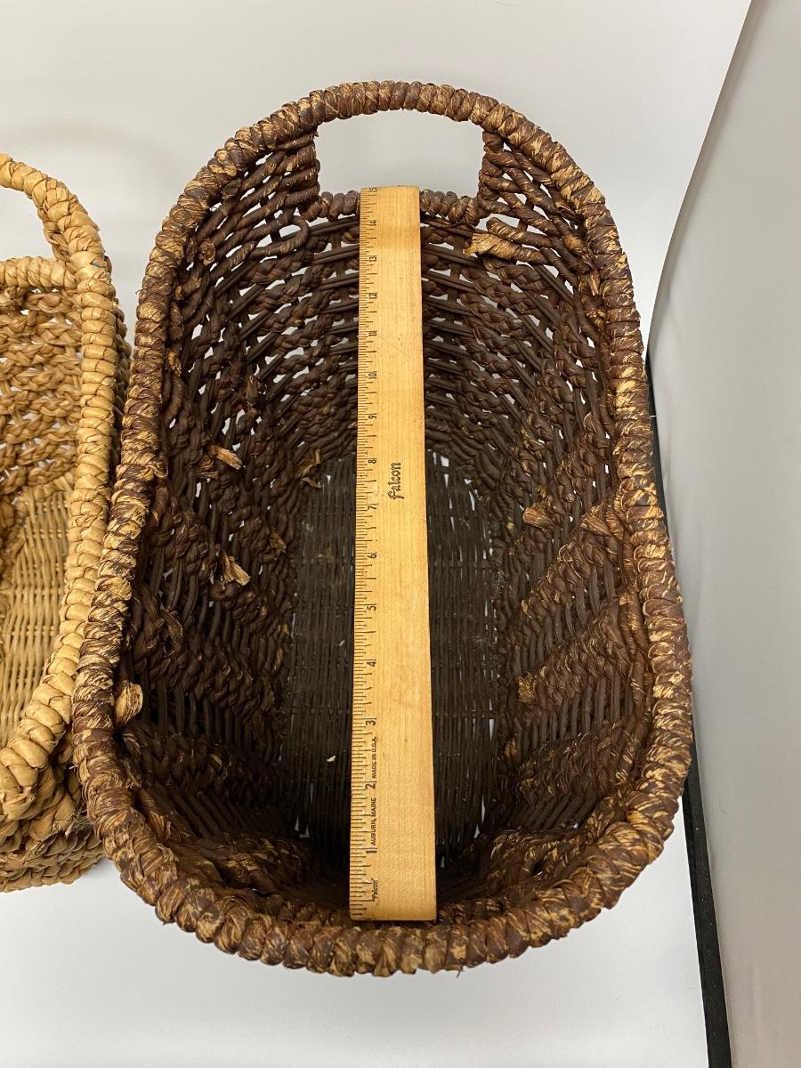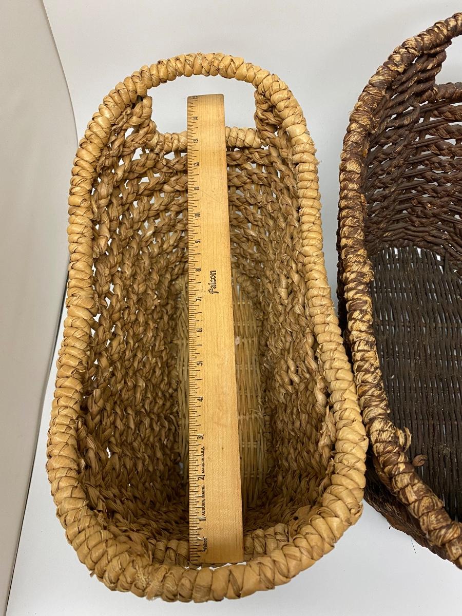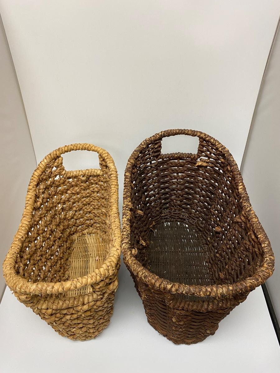 Pair of nice heavy duty woven baskets. Double handled, one light colored, one dark. Great for magazines & newspapers. Good condition. One is slightly smaller than the other. About 12" tall and 15" length.