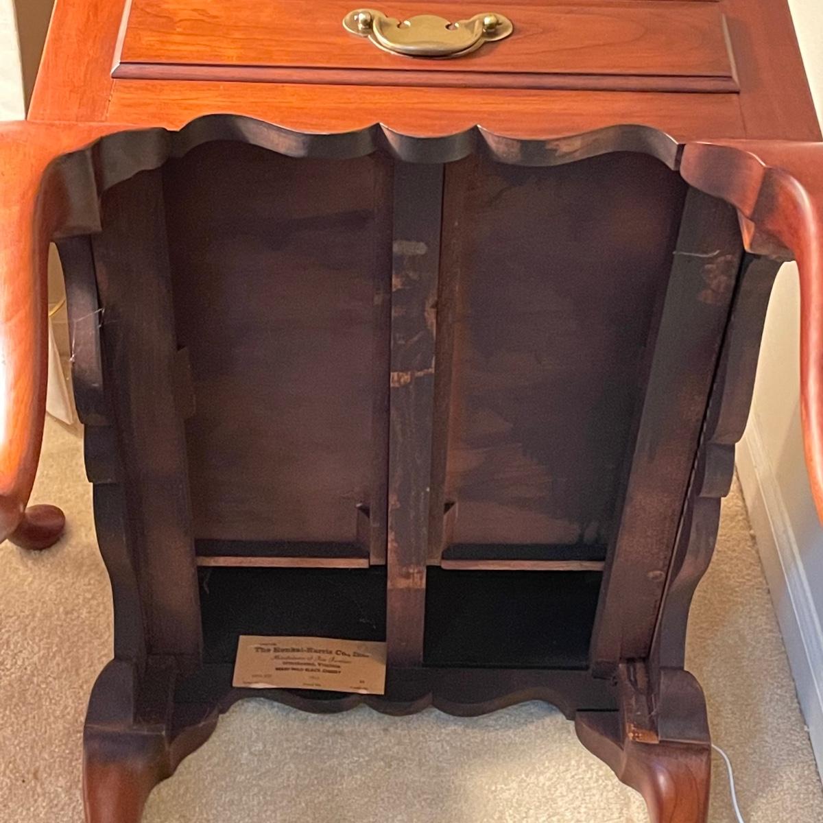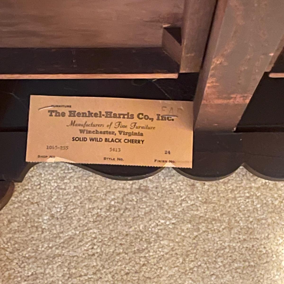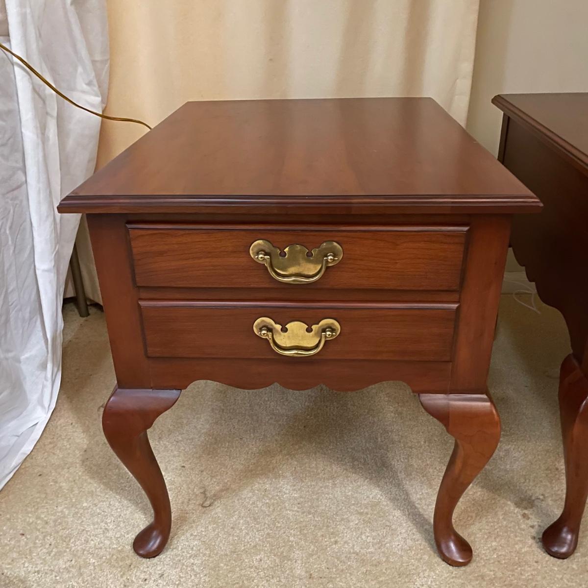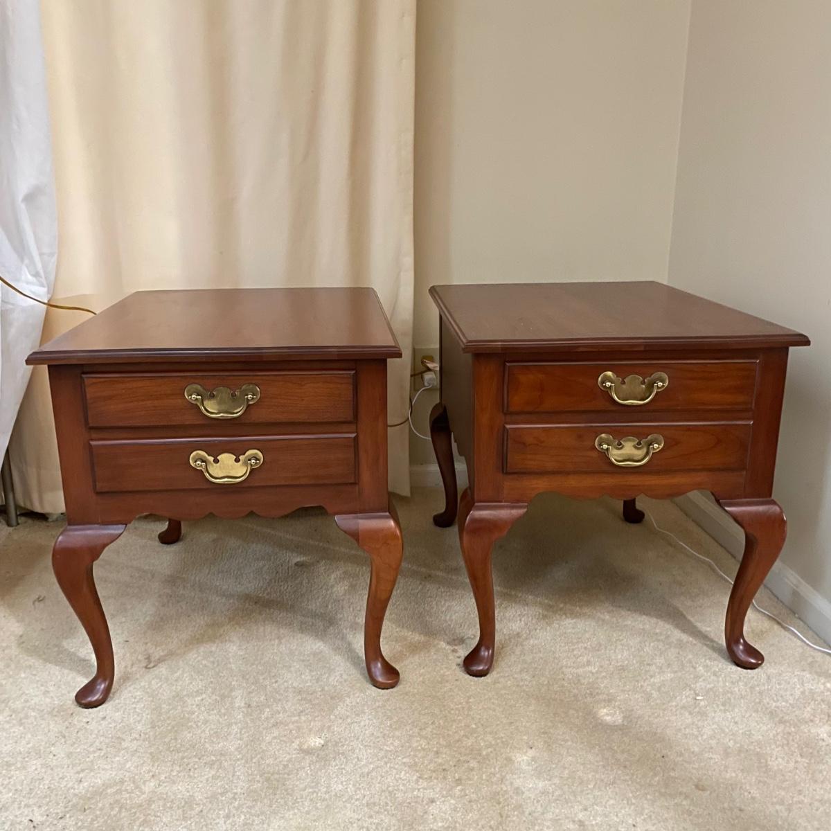 These well cared for Henkel-Harris end tables are solid wild black cherry wood and each have two dovetailed drawers with brass pulls. One table has some light top surface blemishes but otherwise they are in very good condition.