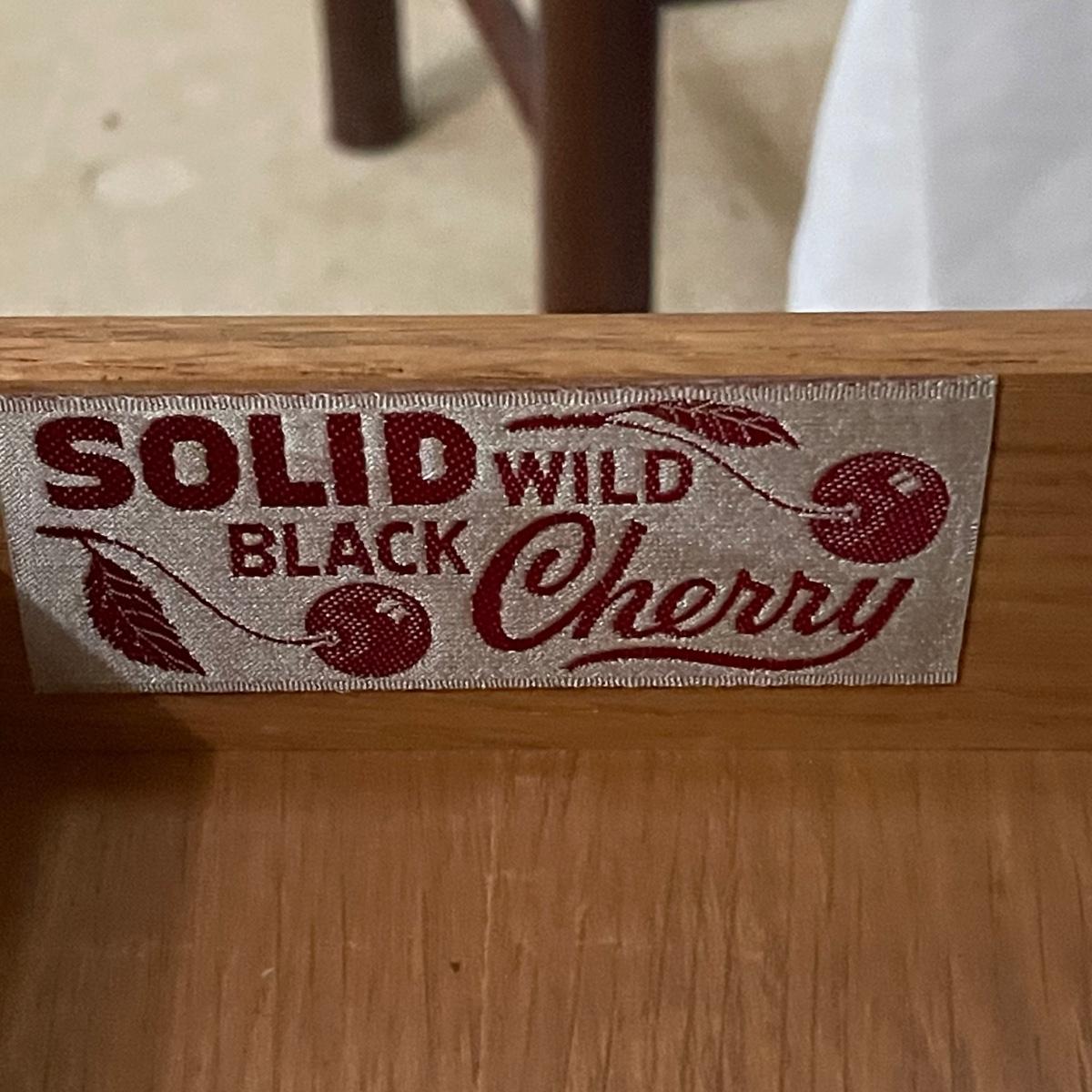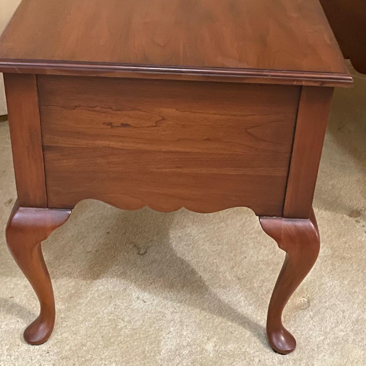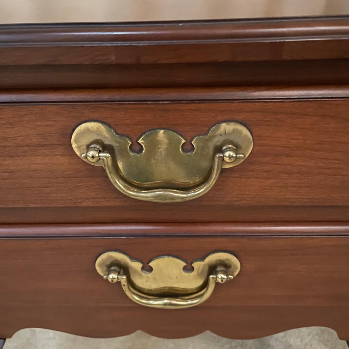 These well cared for Henkel-Harris end tables are solid wild black cherry wood and each have two dovetailed drawers with brass pulls. One table has some light top surface blemishes but otherwise they are in very good condition.
