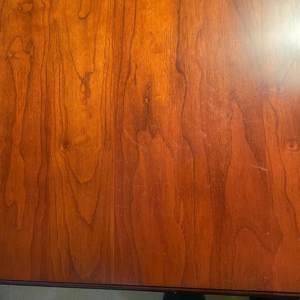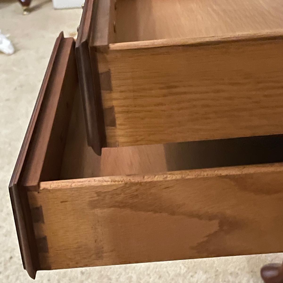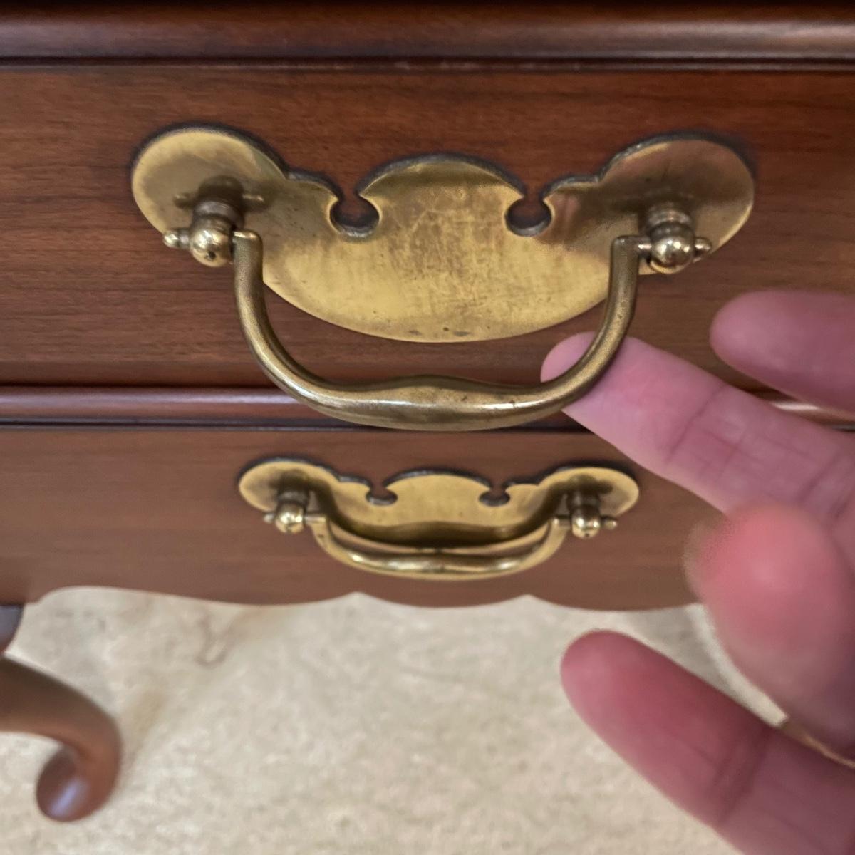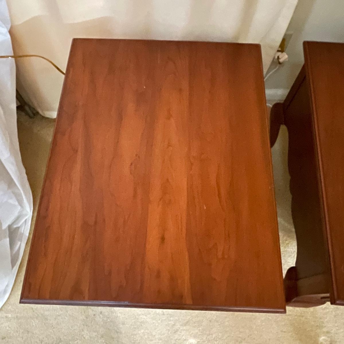 These well cared for Henkel-Harris end tables are solid wild black cherry wood and each have two dovetailed drawers with brass pulls. One table has some light top surface blemishes but otherwise they are in very good condition.