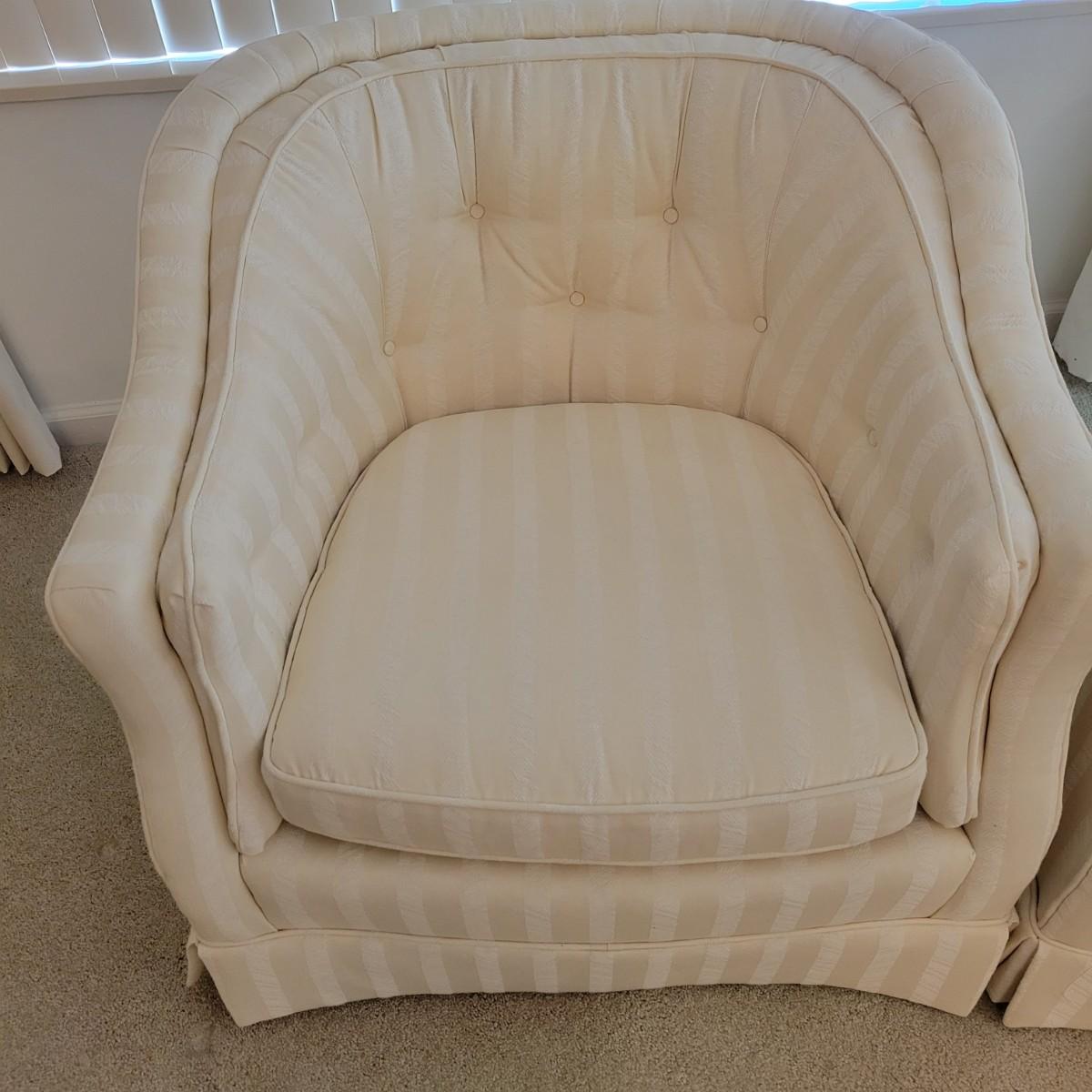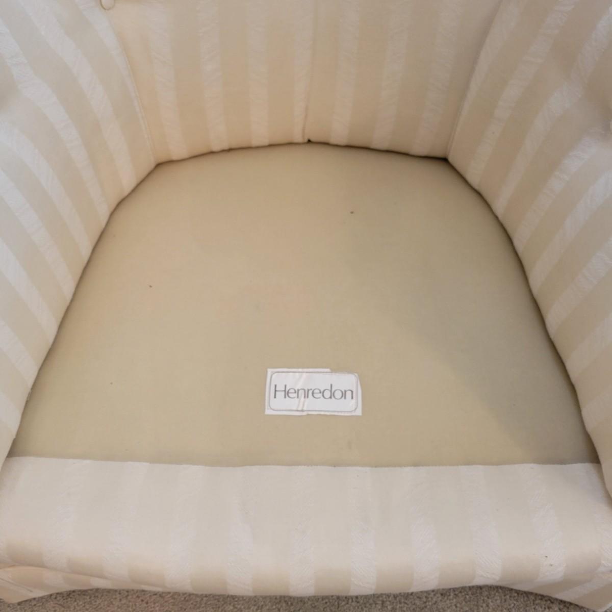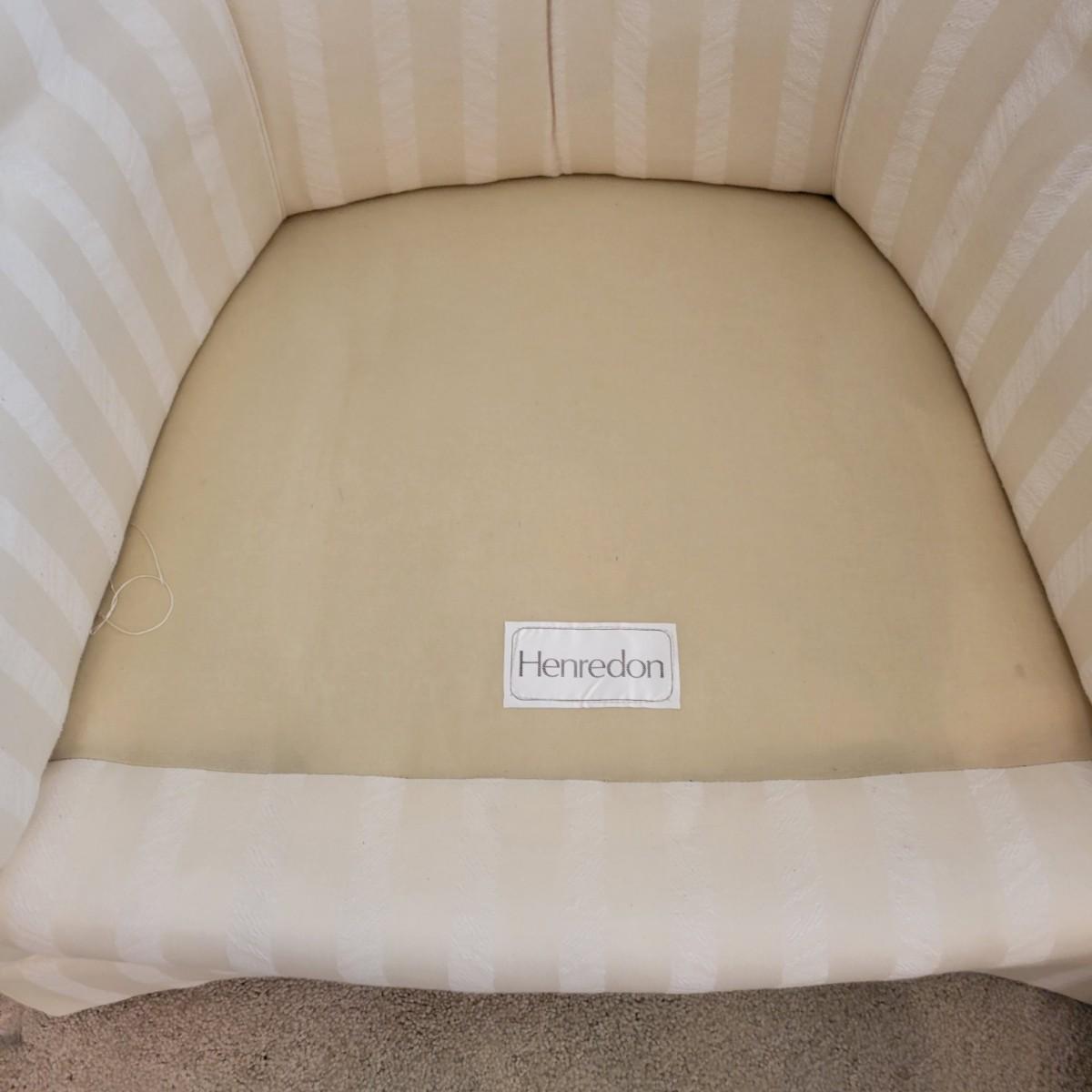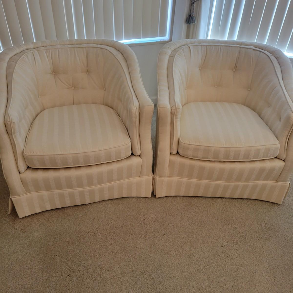 A pair of Henredon chairs with cream colored upholstery with white accents. There are some minor stains on one of the cushions. Chairs measure approximately 31" x 29" x 27.5"H with a seat height of 16". Local pickup only. Winning bidder must bring assistance to help move and load this item due to its weight and/or size.