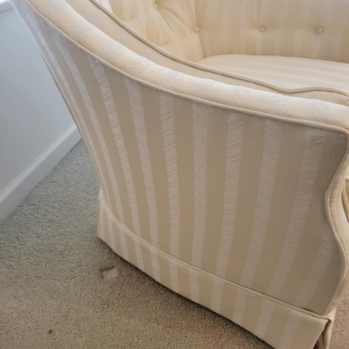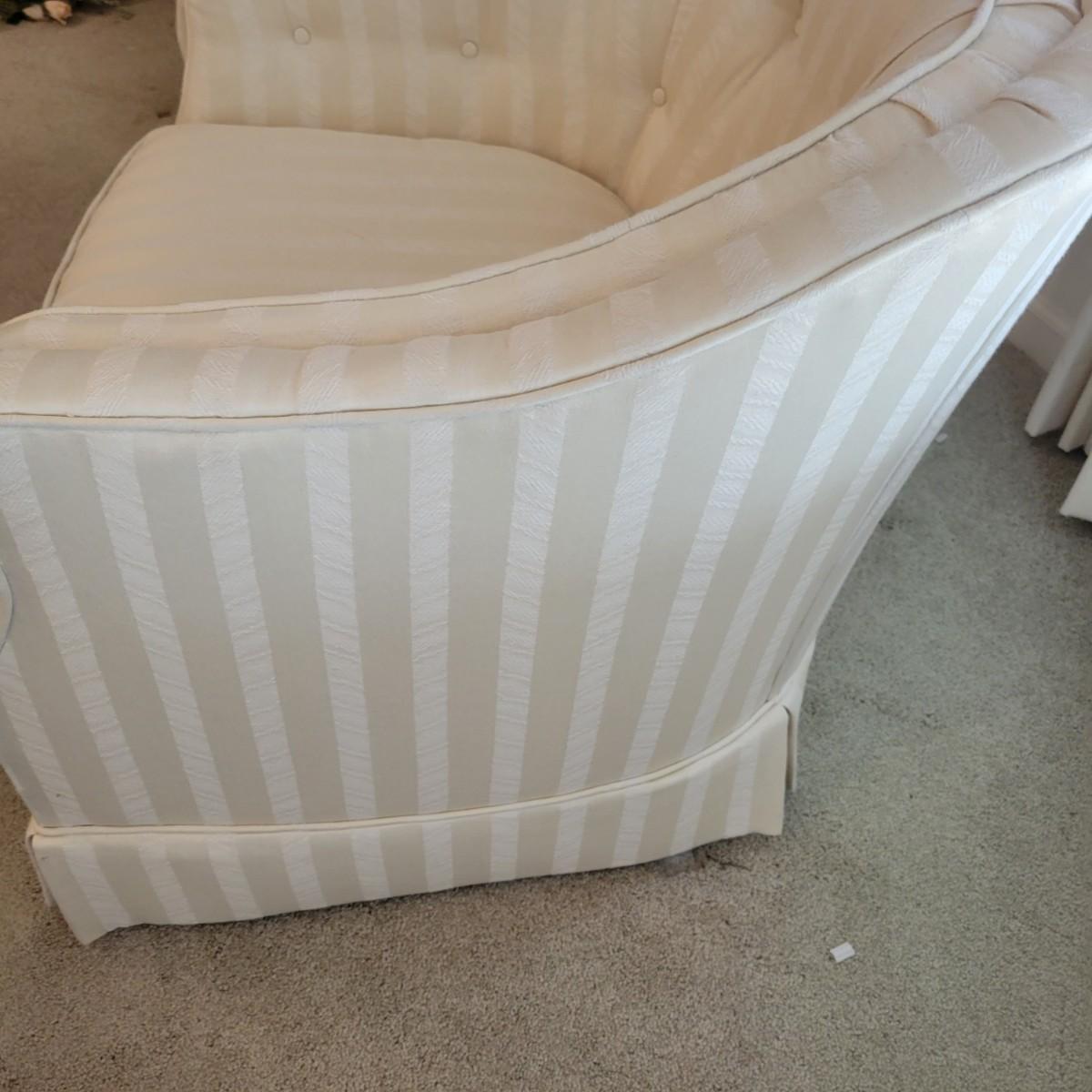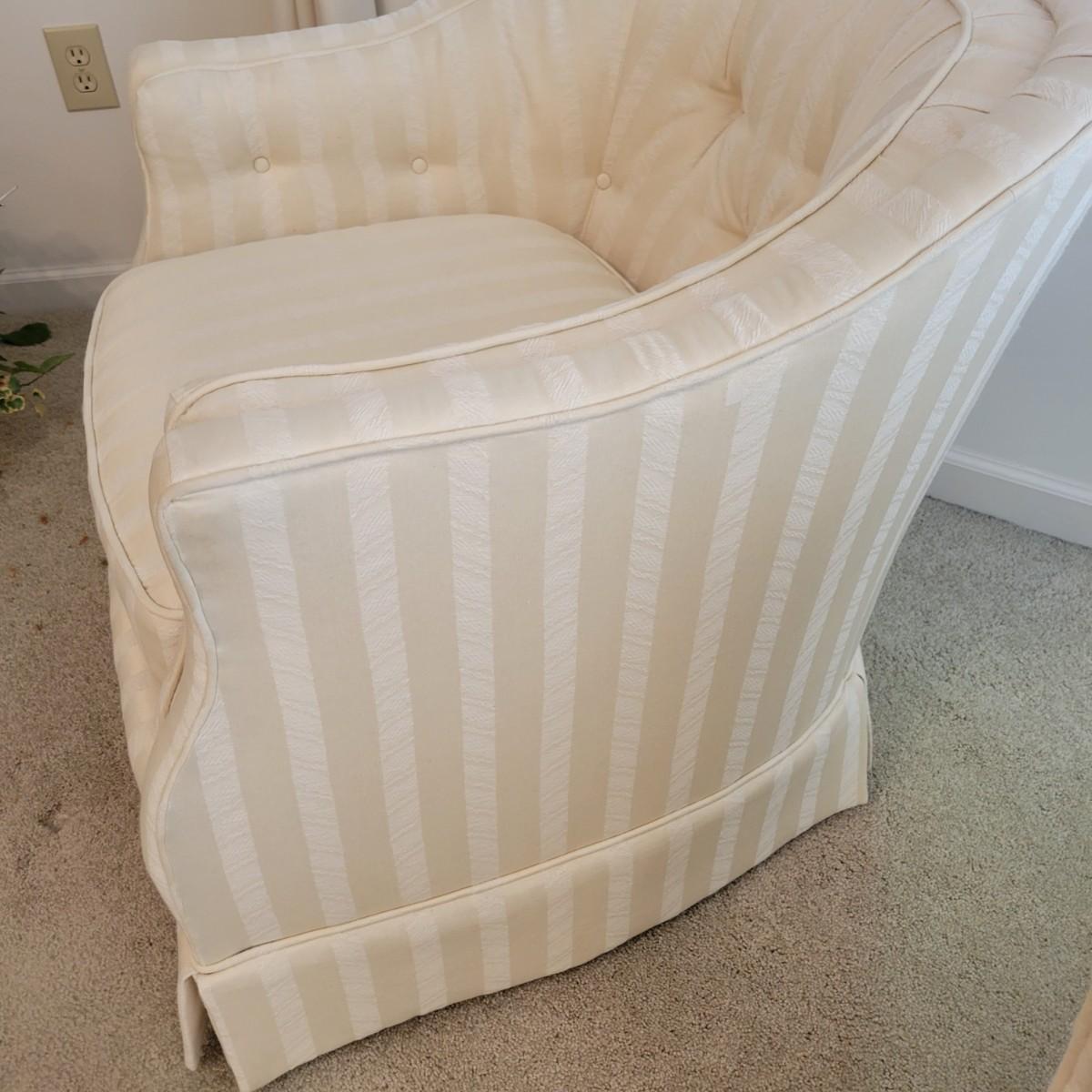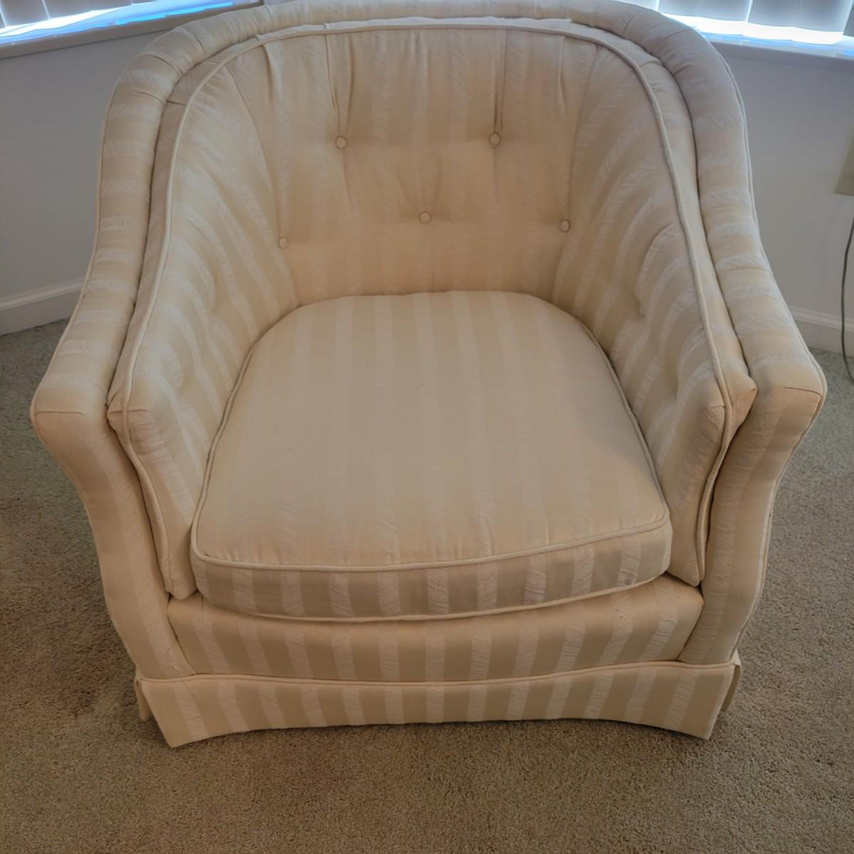 A pair of Henredon chairs with cream colored upholstery with white accents. There are some minor stains on one of the cushions. Chairs measure approximately 31" x 29" x 27.5"H with a seat height of 16". Local pickup only. Winning bidder must bring assistance to help move and load this item due to its weight and/or size.