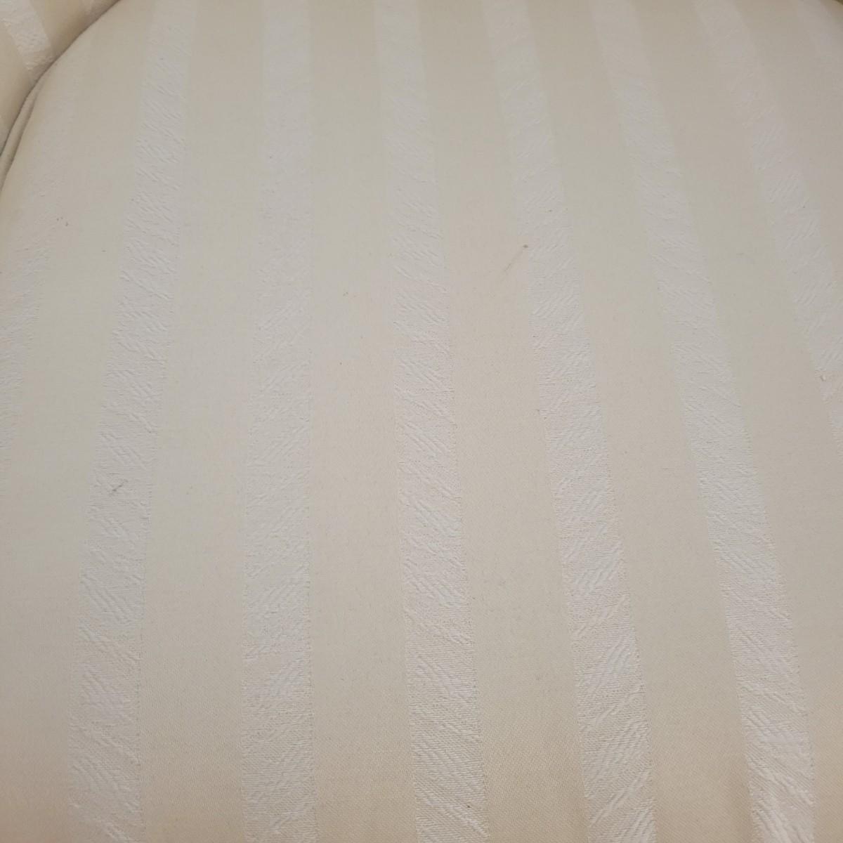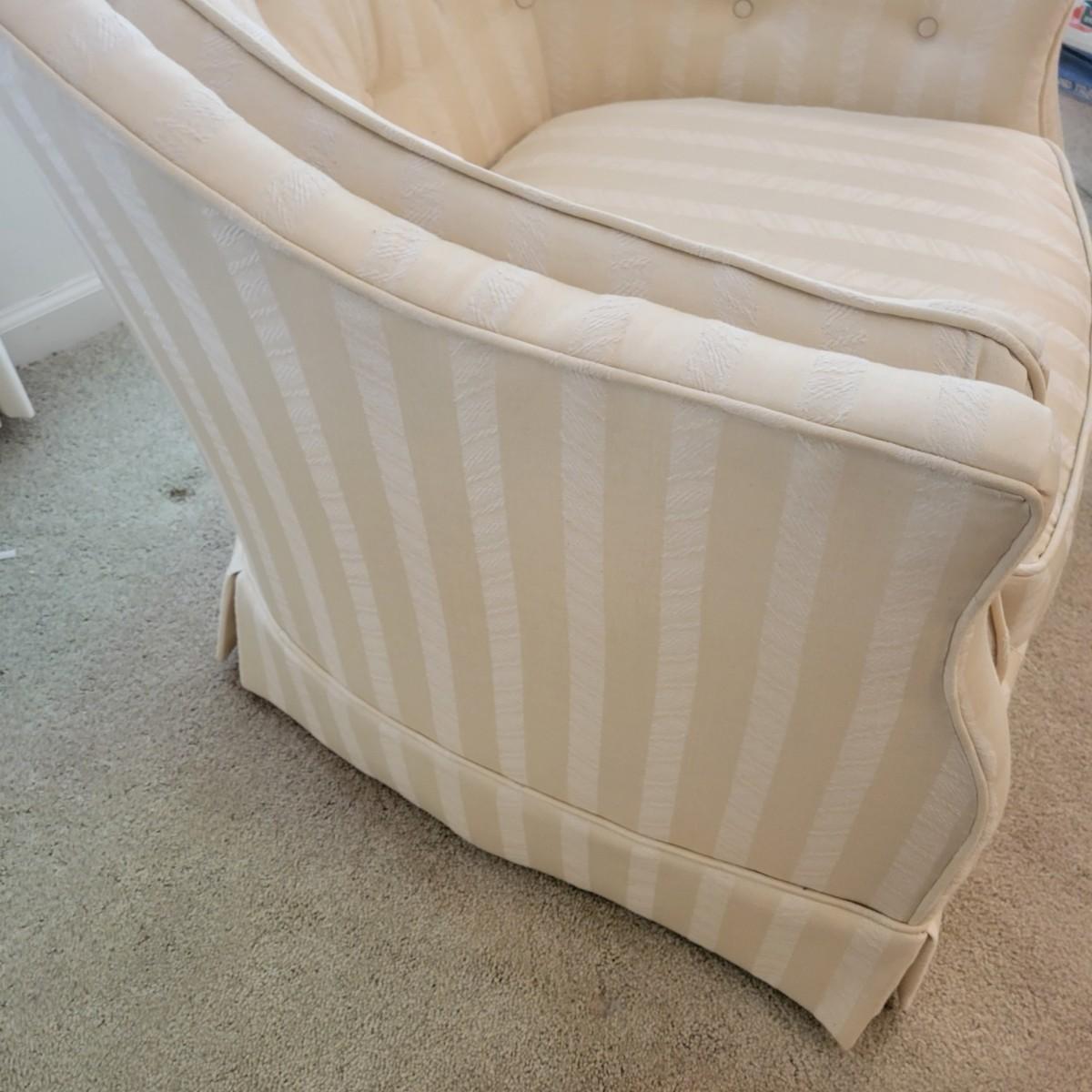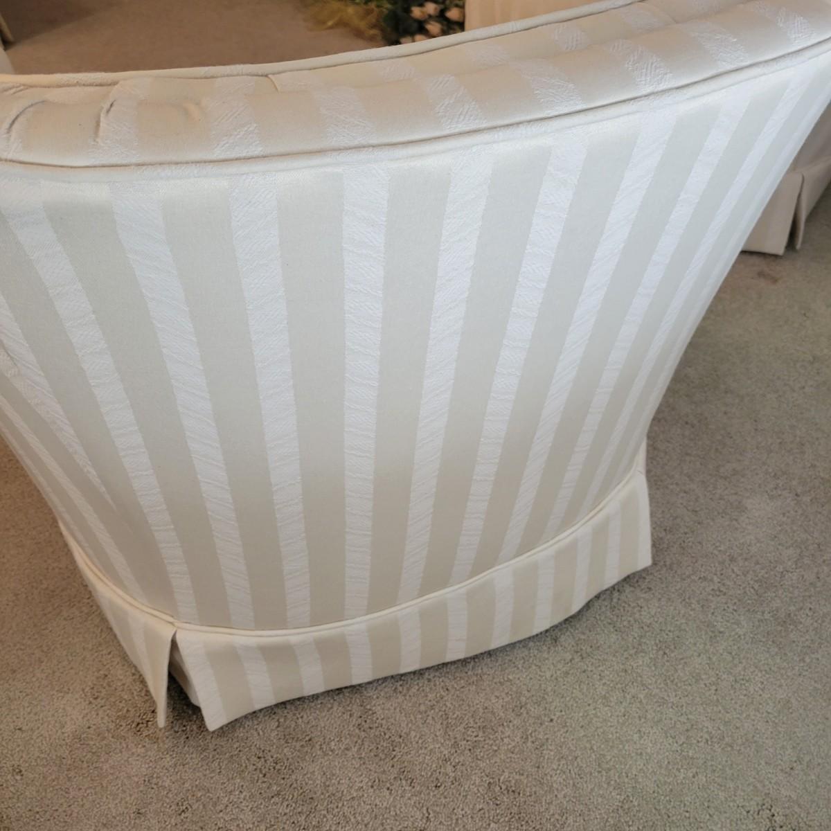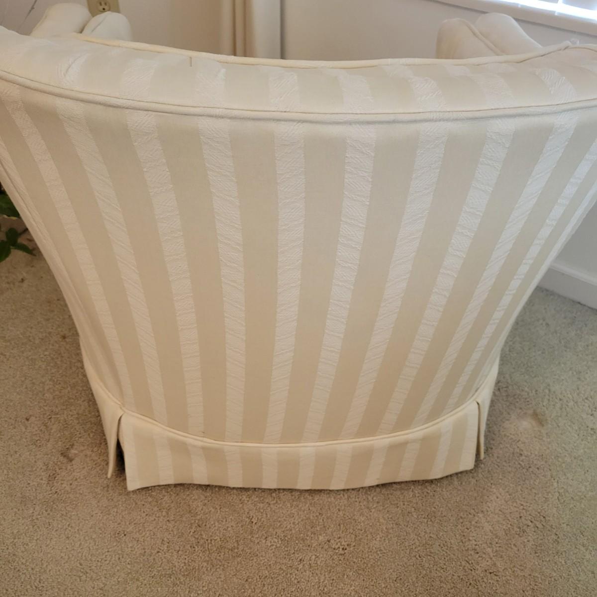 A pair of Henredon chairs with cream colored upholstery with white accents. There are some minor stains on one of the cushions. Chairs measure approximately 31" x 29" x 27.5"H with a seat height of 16". Local pickup only. Winning bidder must bring assistance to help move and load this item due to its weight and/or size.