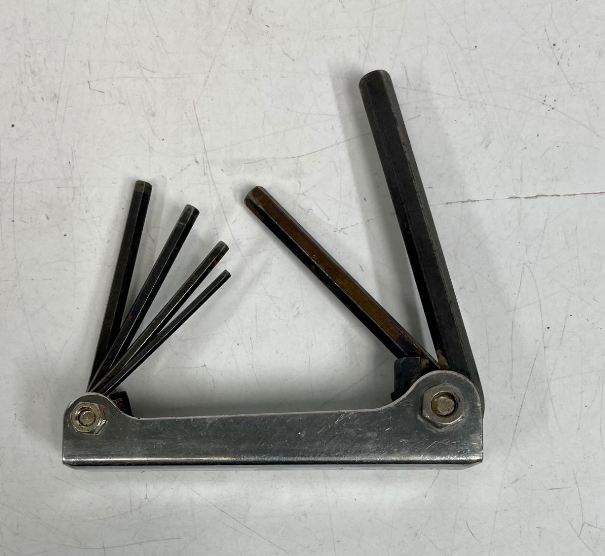 Metric set has 6 hex keys, the SAE set has 5 hex keys: metric sizes include 3mm, 4mm, 5mm, 6mm, 8mm and 10mm. SAE sizes include 3/16", 7/32", 1/4", 5/16", and 3/8". Both in very good used condition, no rust or damage/bending on any of the keys.