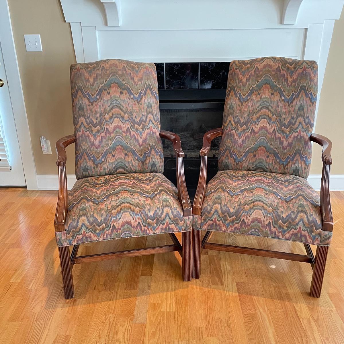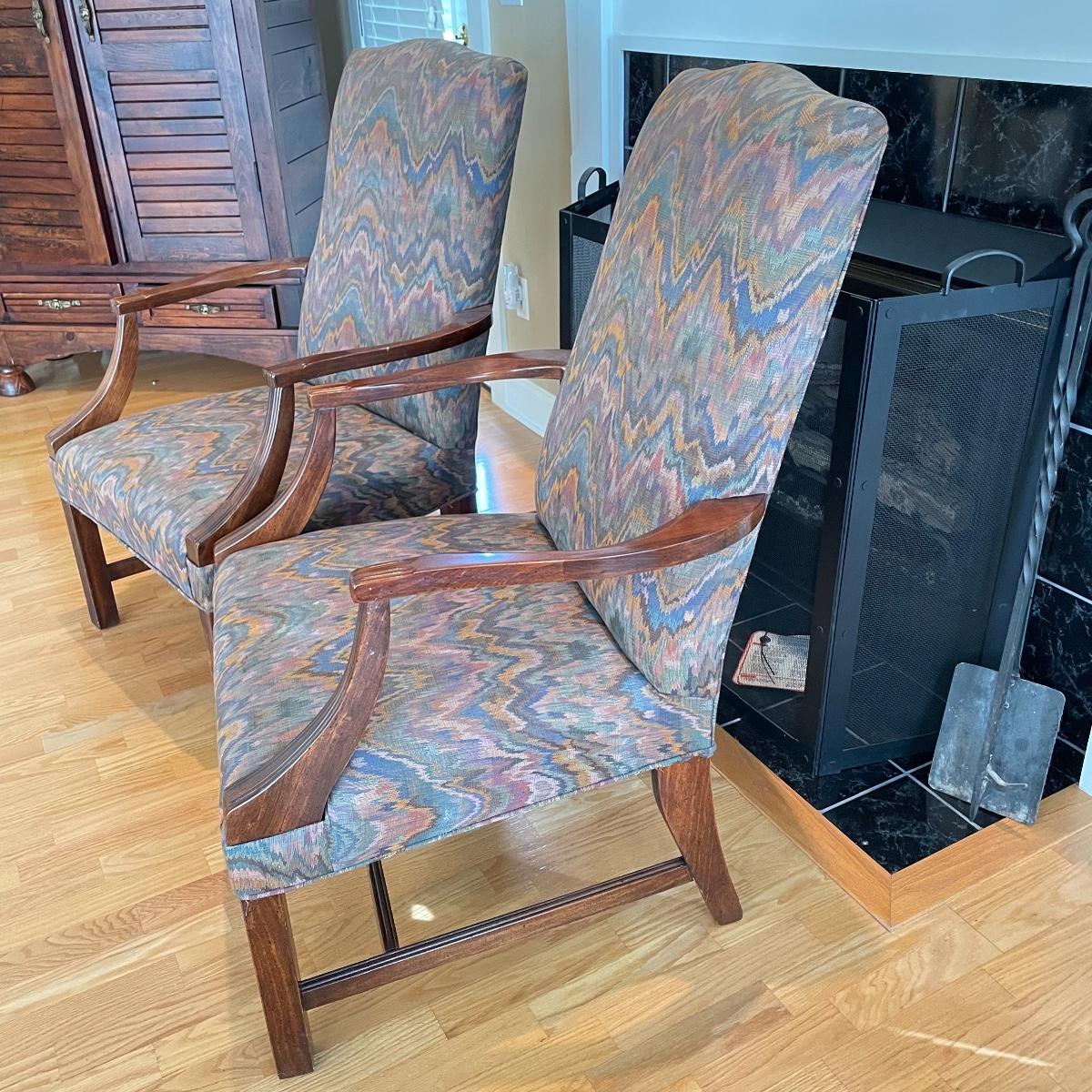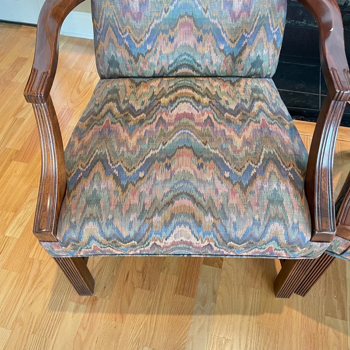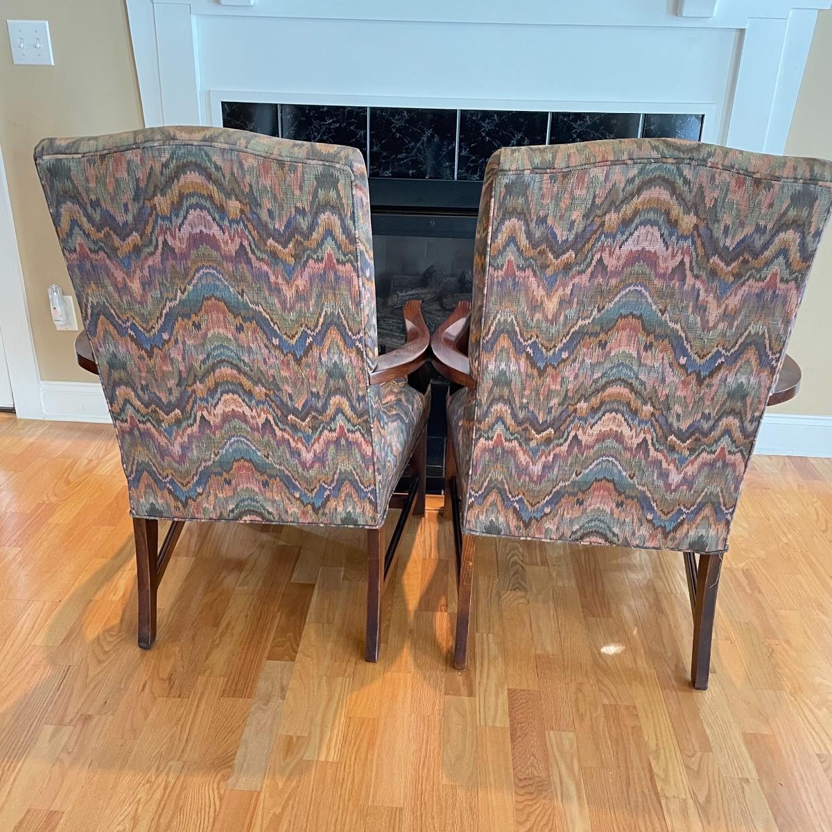 Two matching chairs upholstered on seat and high back. Wooden arms and legs are in very nice condition. Chairs measure each 25” x 28” x 42” with a seat height at 18”. Local pick up only.