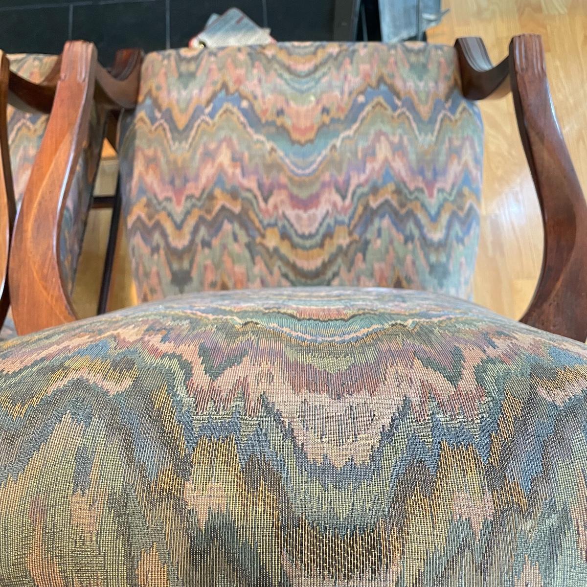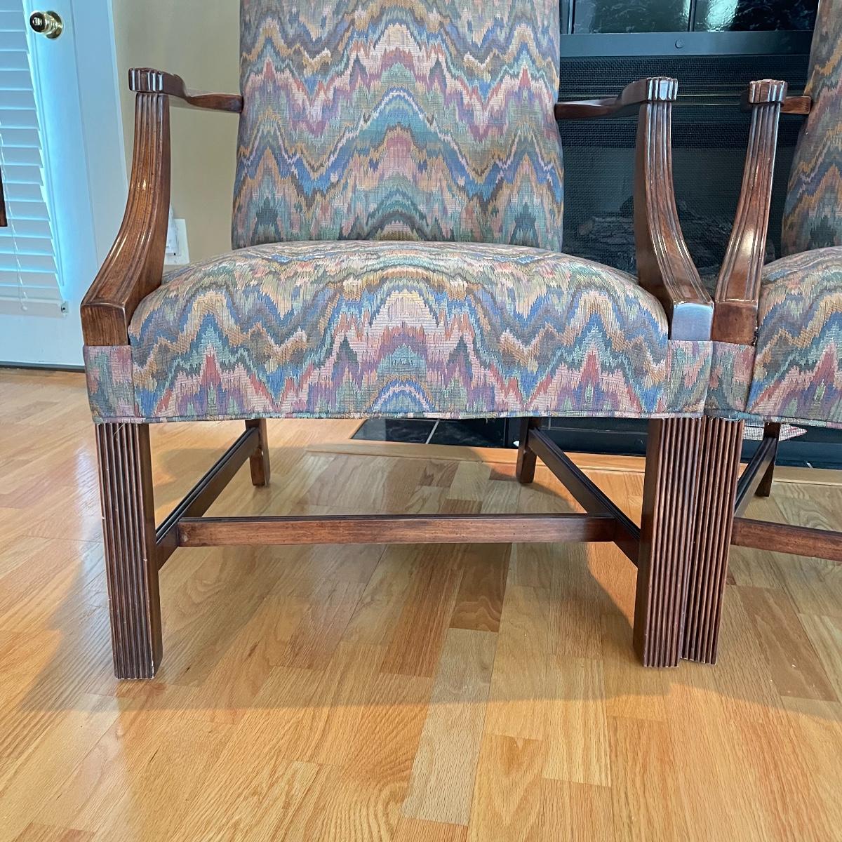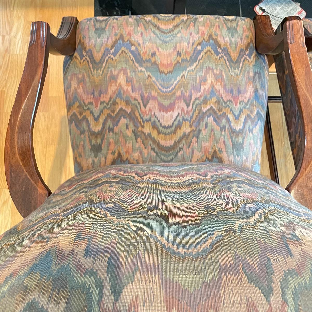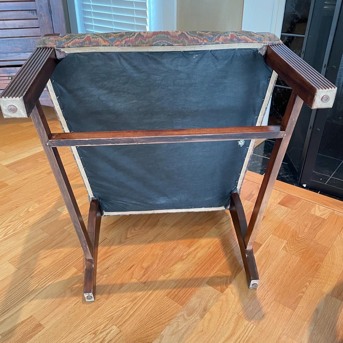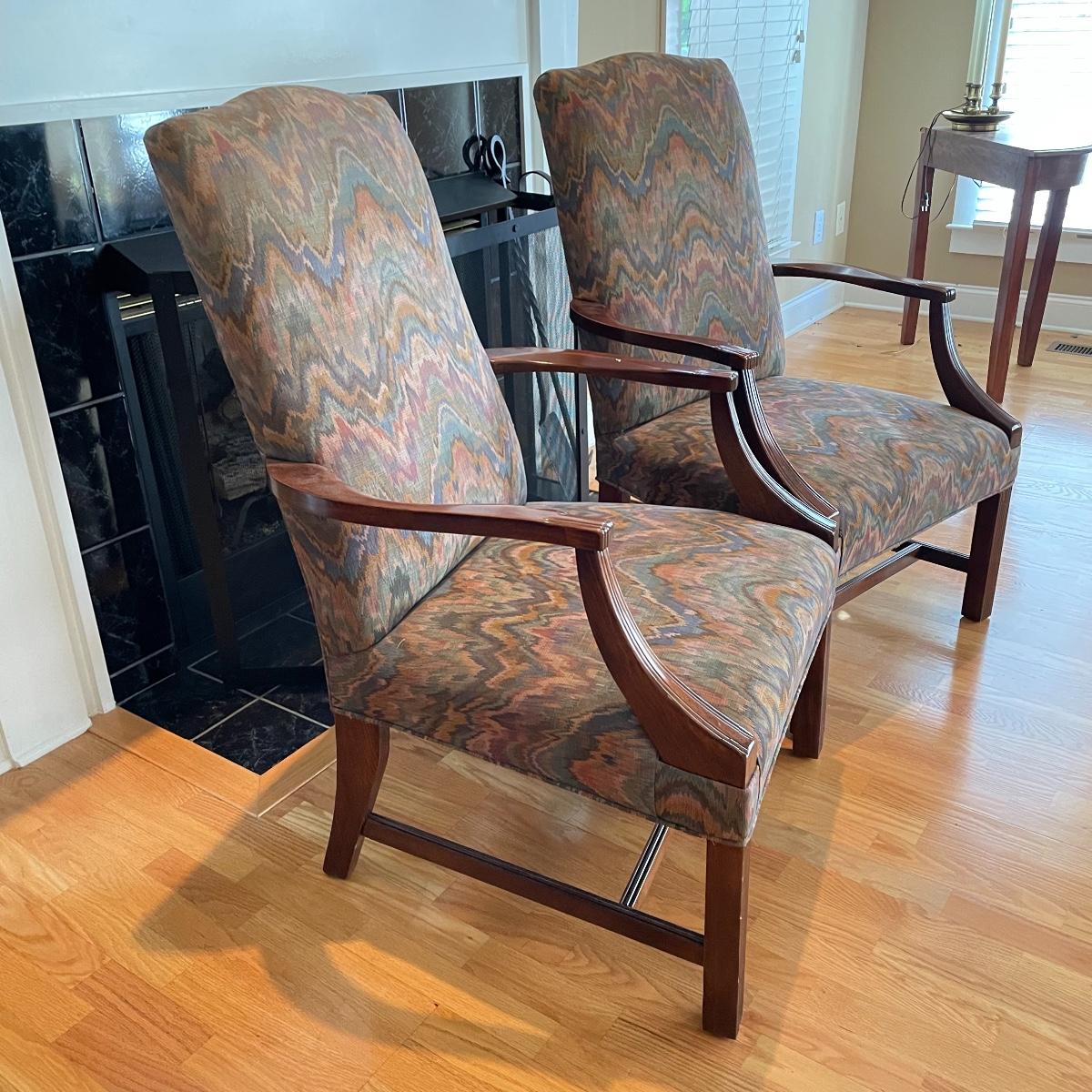 Two matching chairs upholstered on seat and high back. Wooden arms and legs are in very nice condition. Chairs measure each 25” x 28” x 42” with a seat height at 18”. Local pick up only.