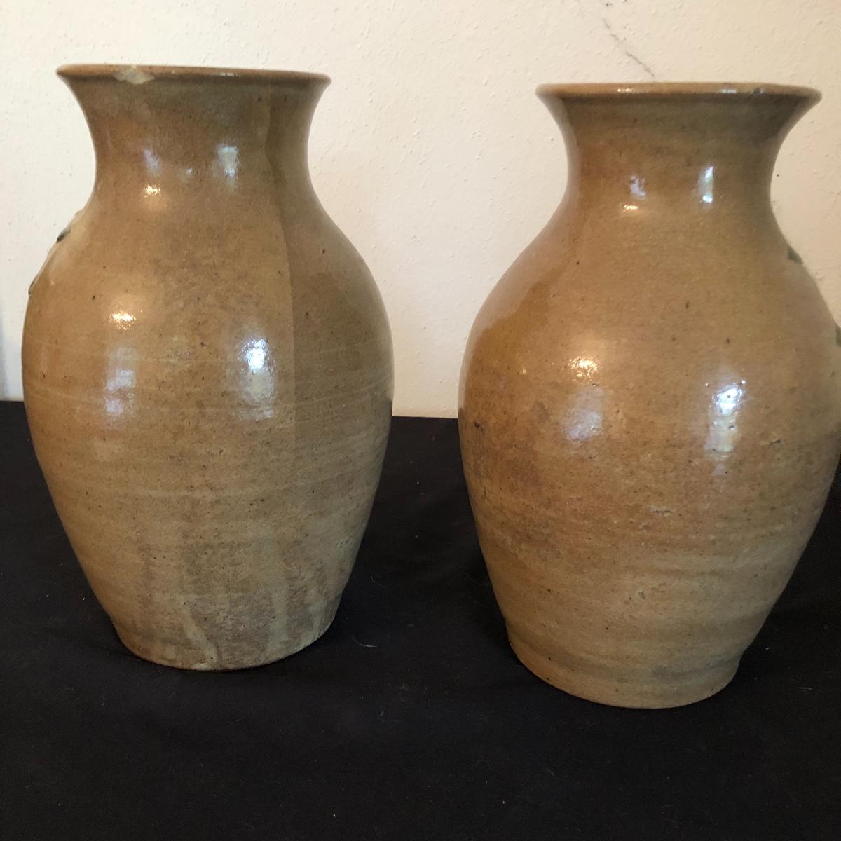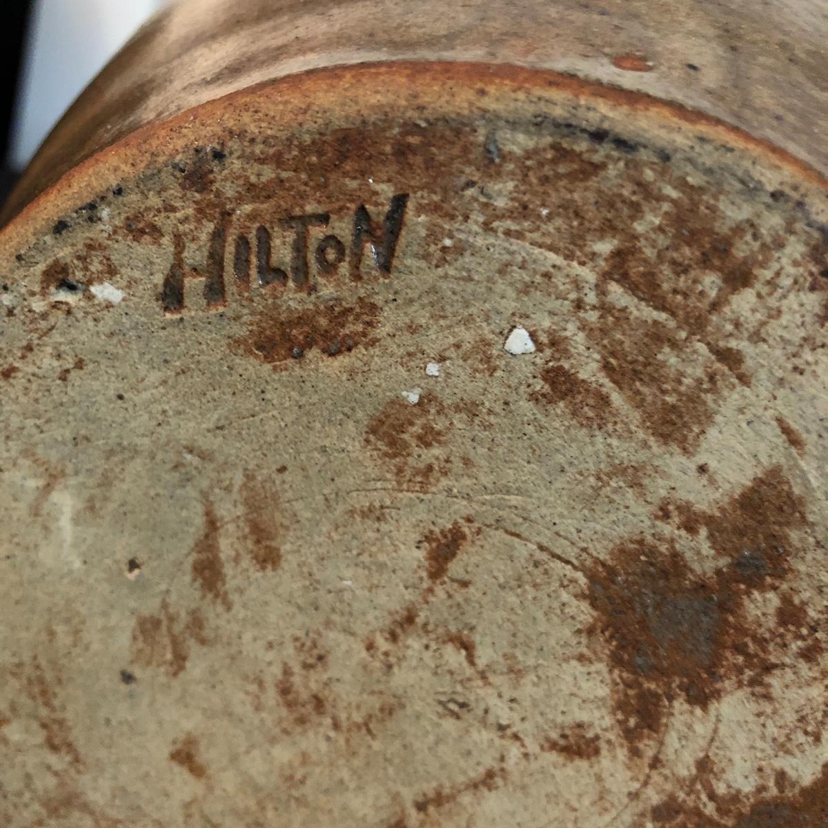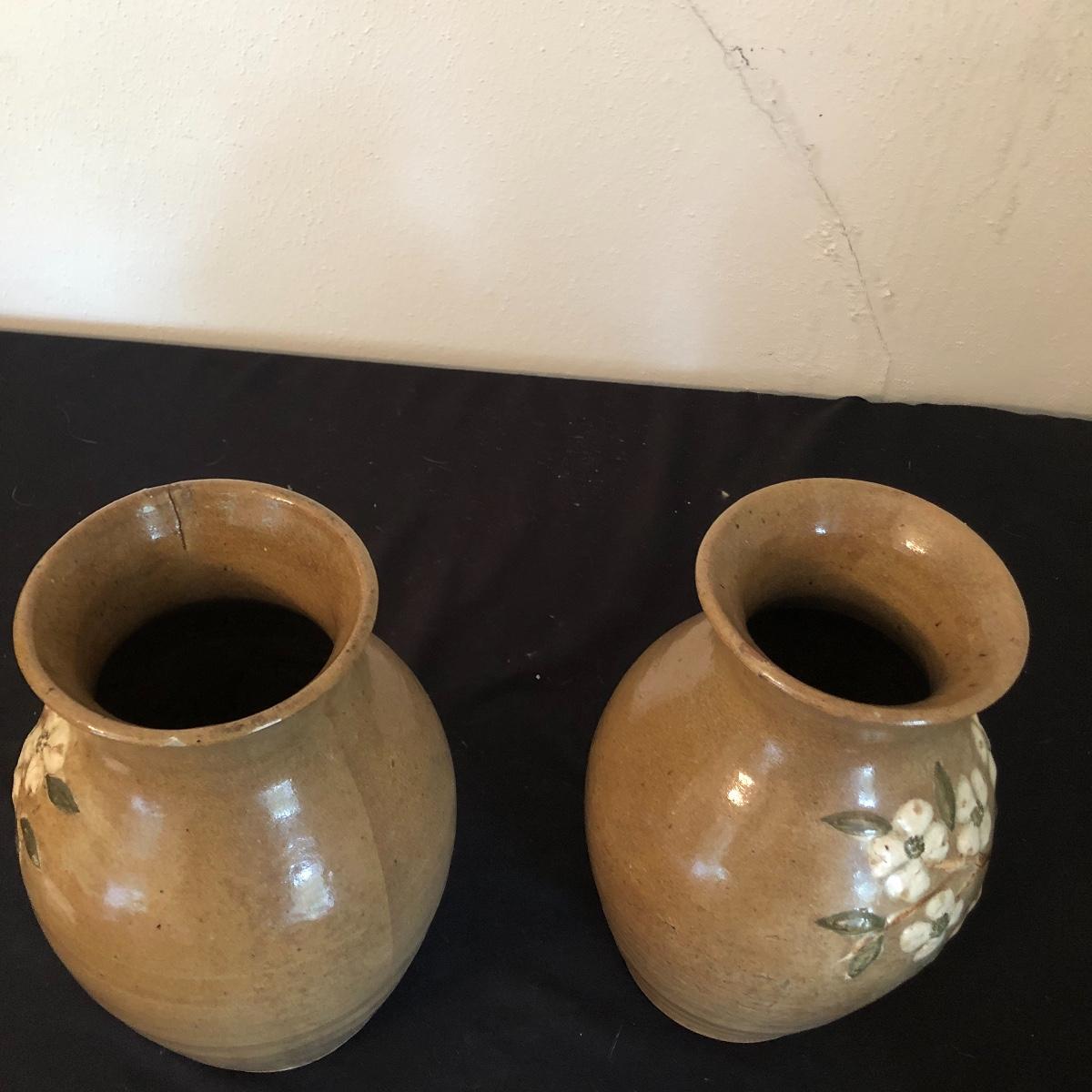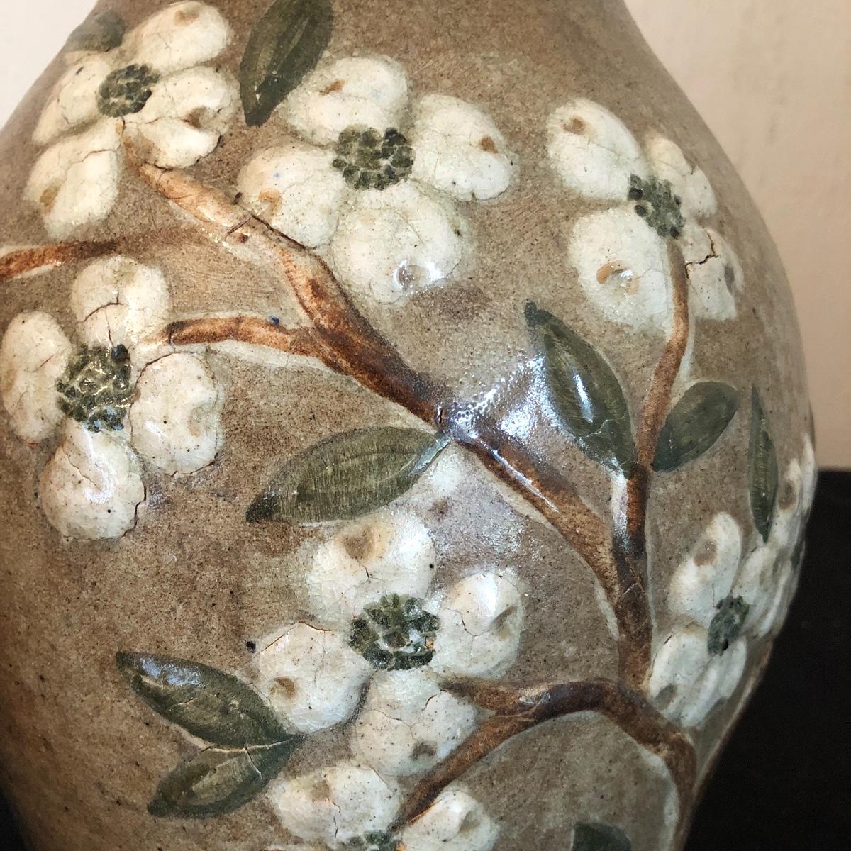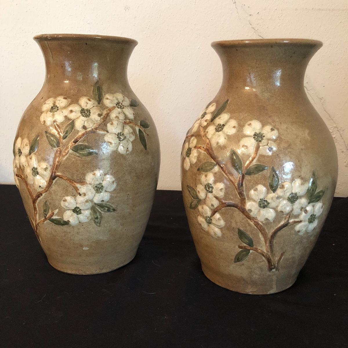 Renowned for their raised dogwood motif, this matching pair of vases are stamped Hilton. One has a hairline crack in the rim and a chip, the other has a tiny chip in it’s; both have hairline cracks in the petals that do appear to have happened during firing, see images. Note that only one bares the Hilton stamp.