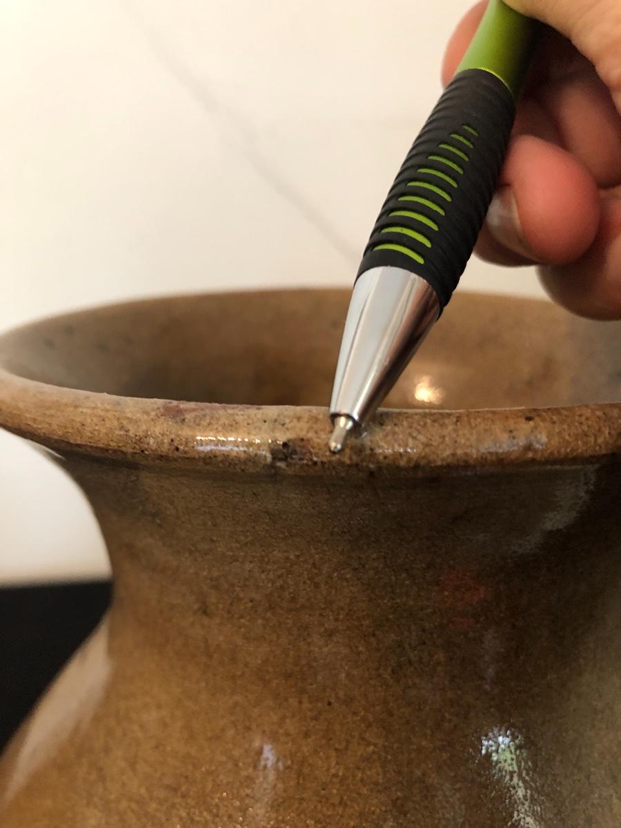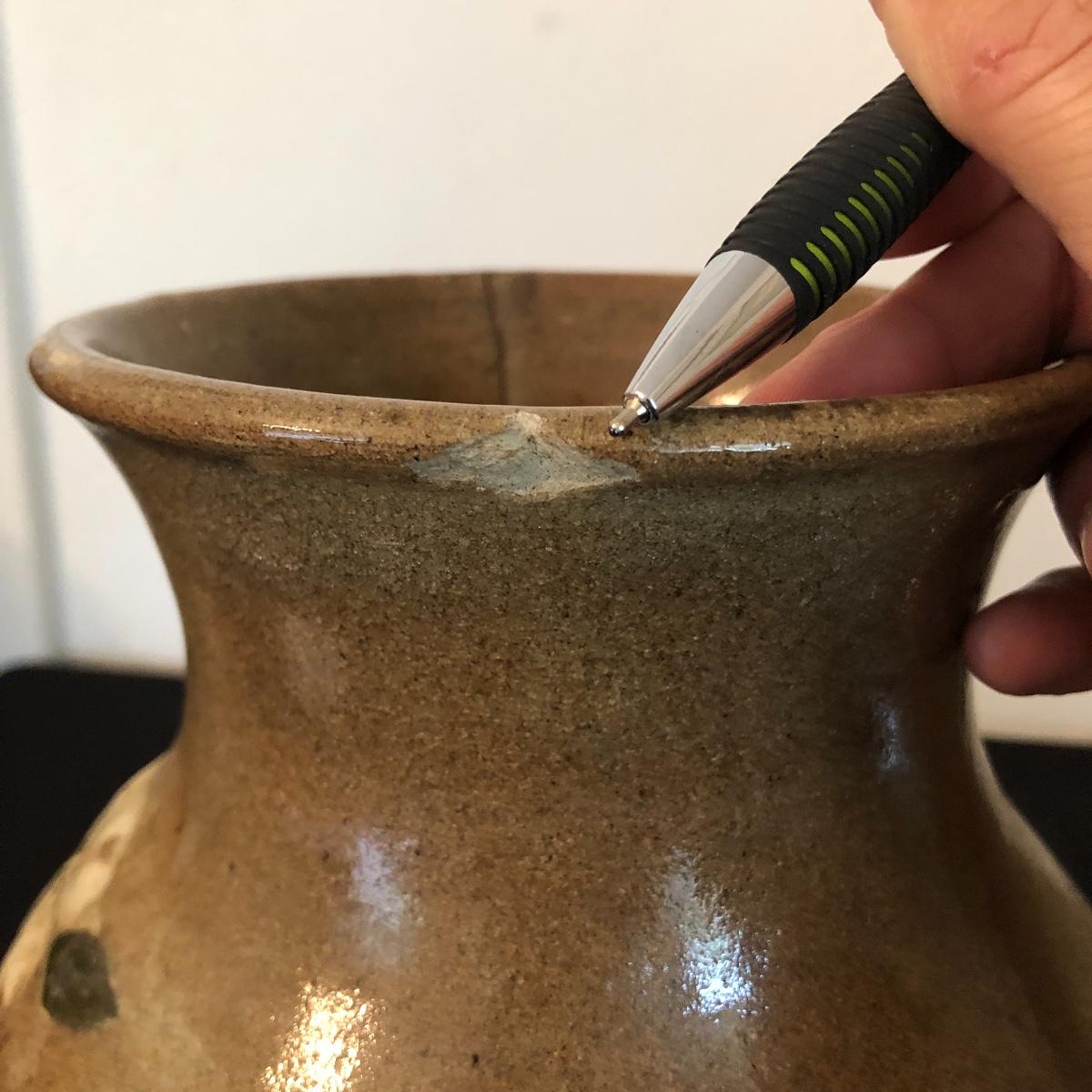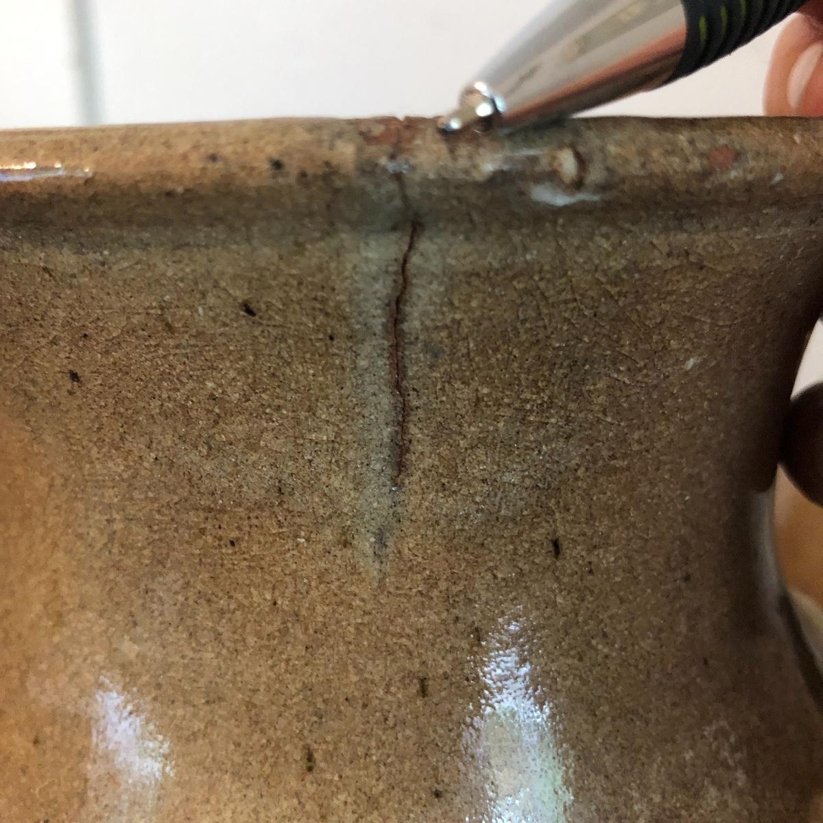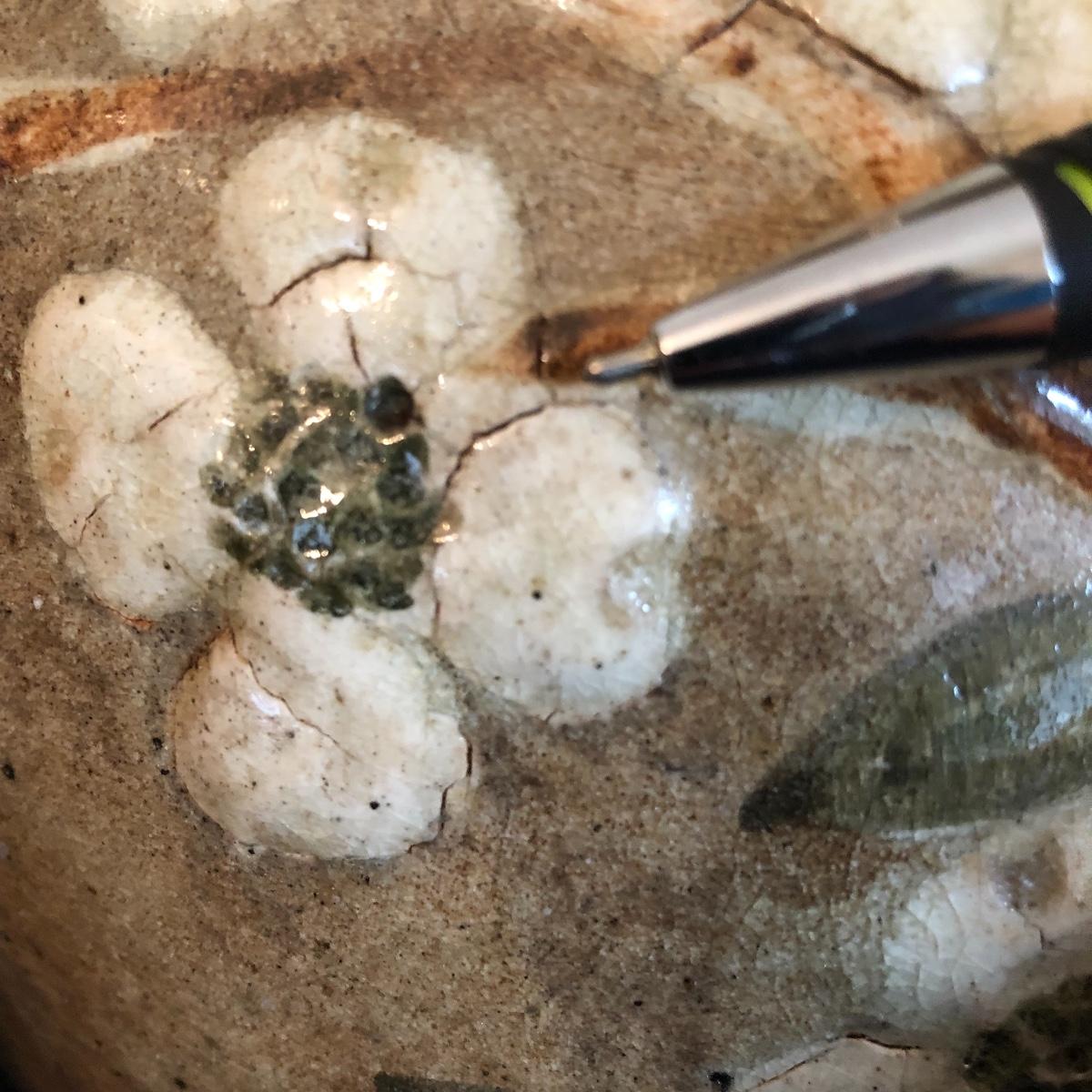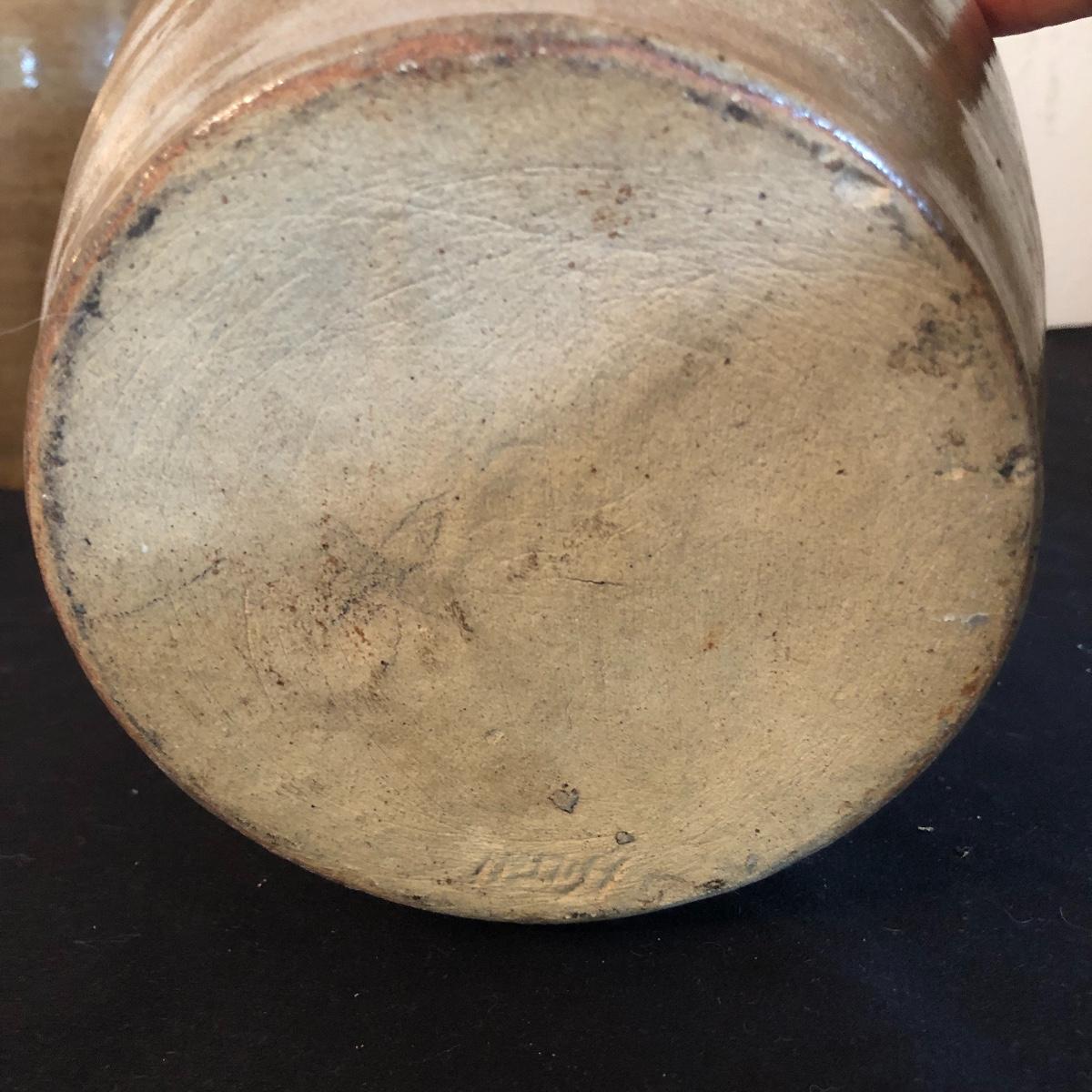 Renowned for their raised dogwood motif, this matching pair of vases are stamped Hilton. One has a hairline crack in the rim and a chip, the other has a tiny chip in it’s; both have hairline cracks in the petals that do appear to have happened during firing, see images. Note that only one bares the Hilton stamp.