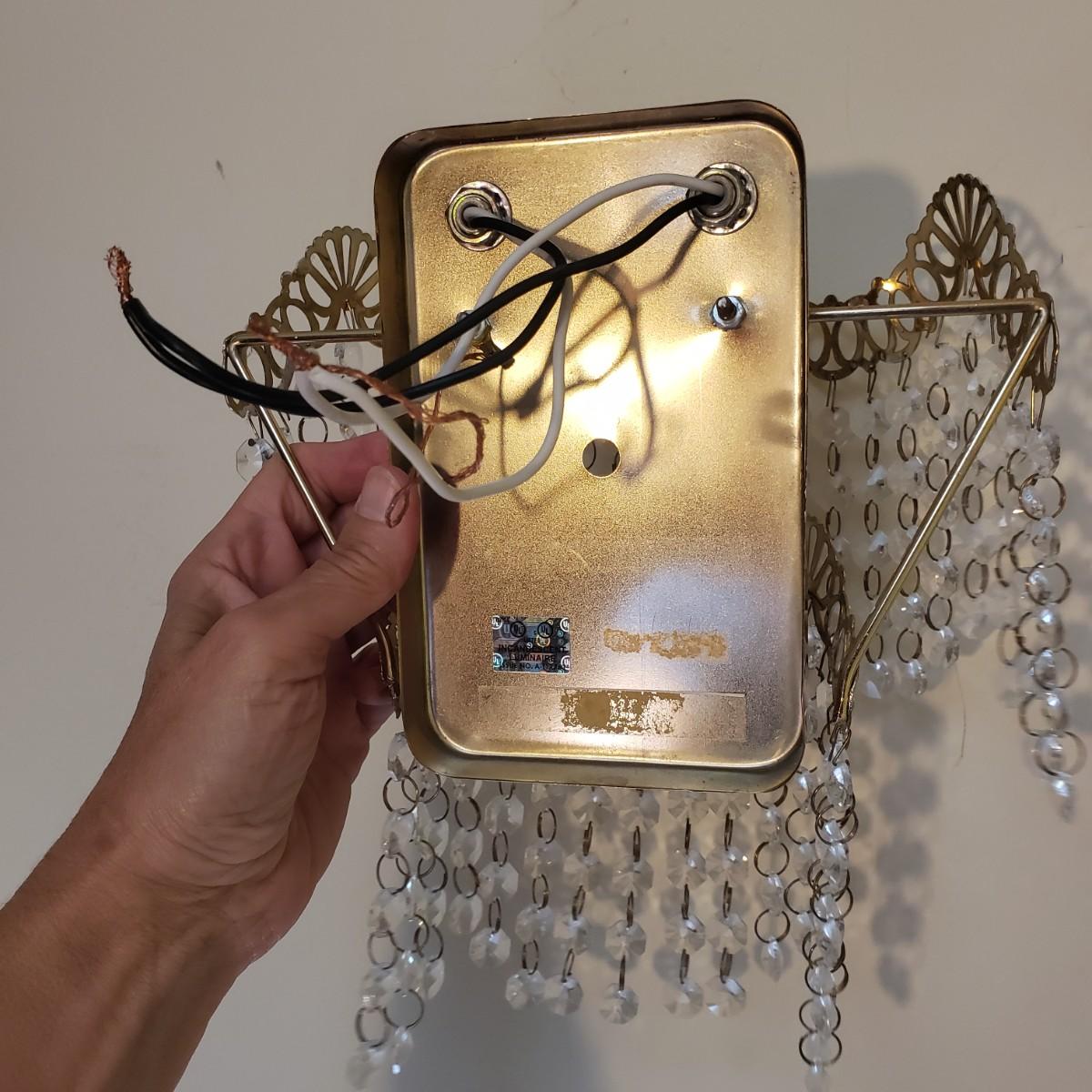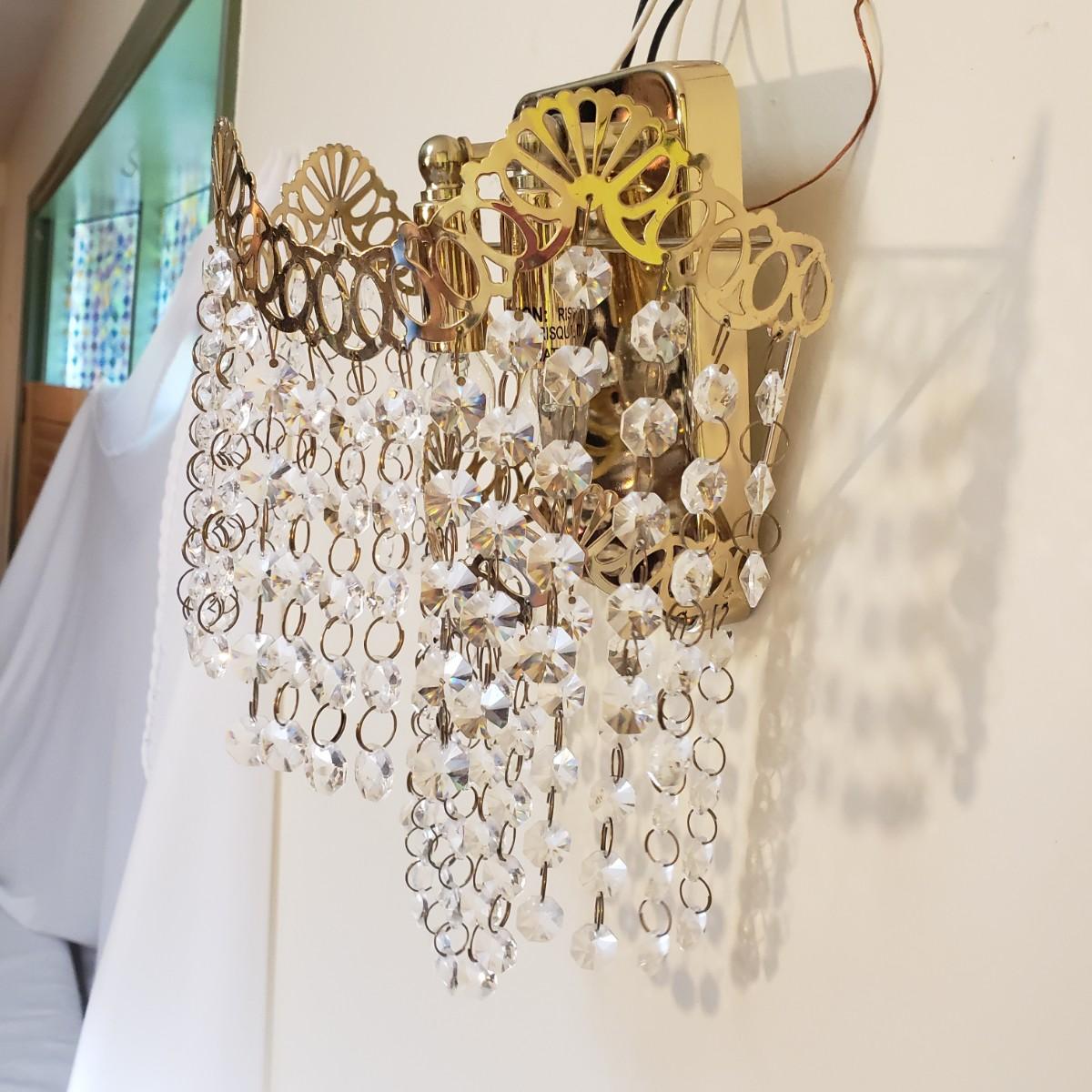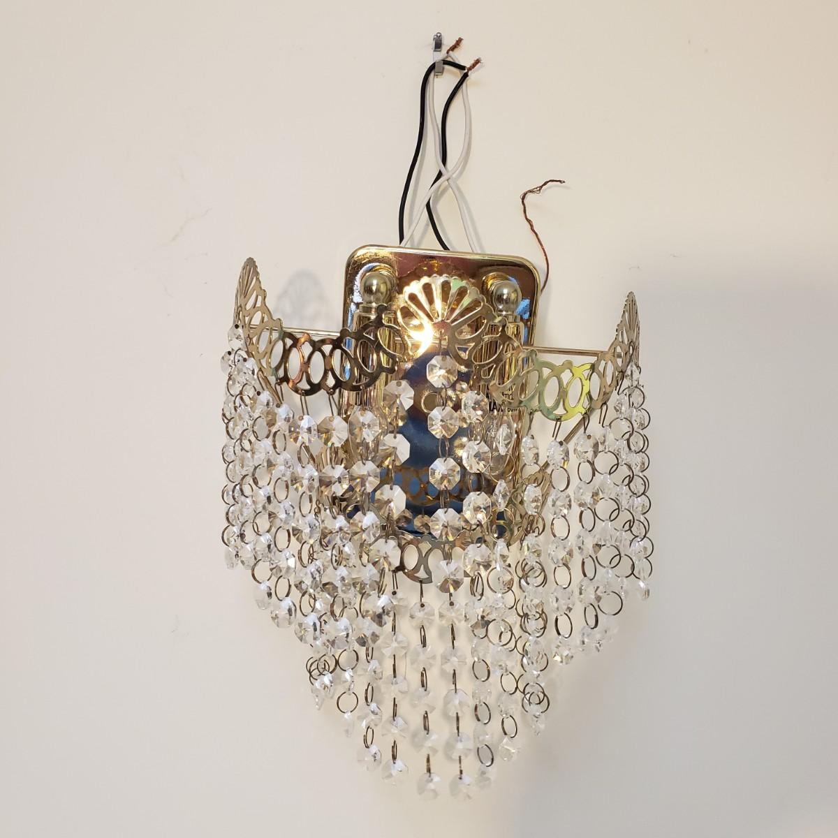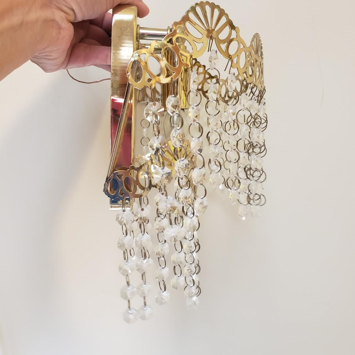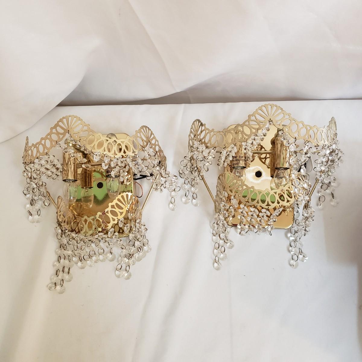 This lot is a pair of Hollywood Regency style brass and cut glass wall sconces. The pair comes with all the hardware needed to mount them on the wall. Each fixture has two small bulbs. Sconces were not tested.