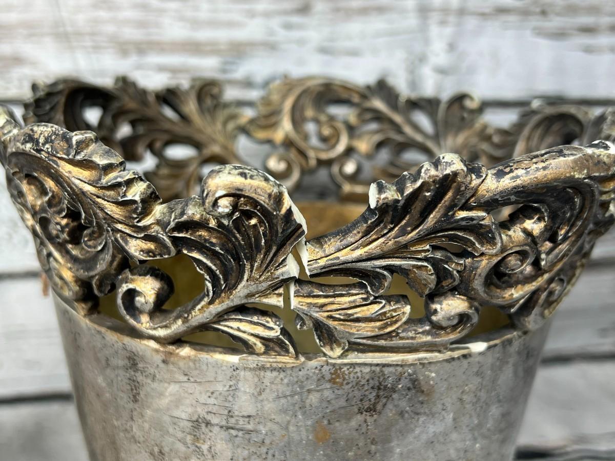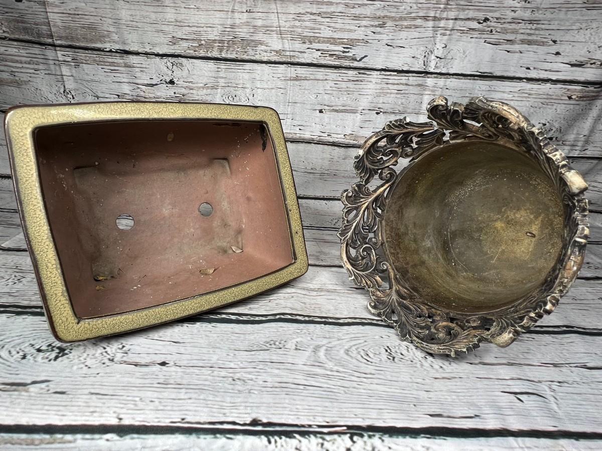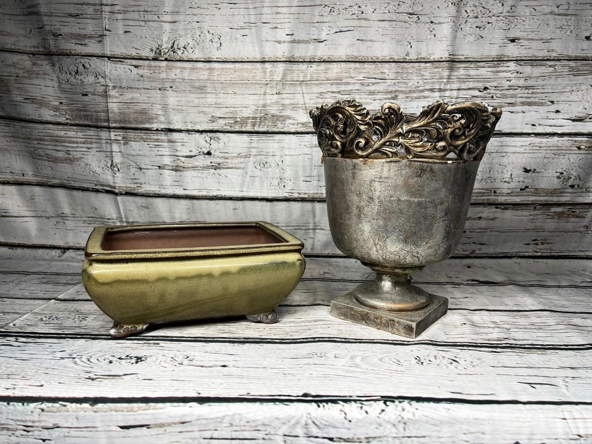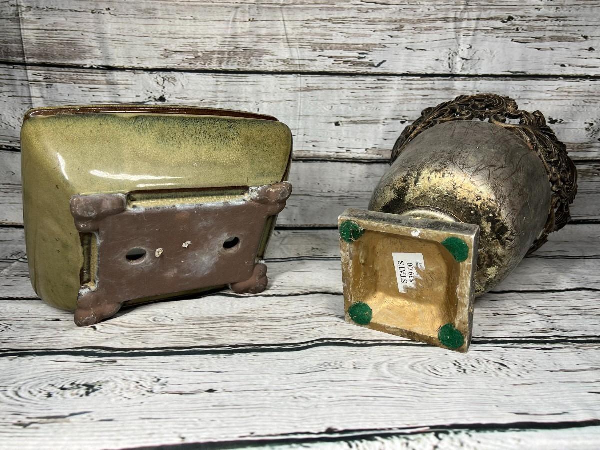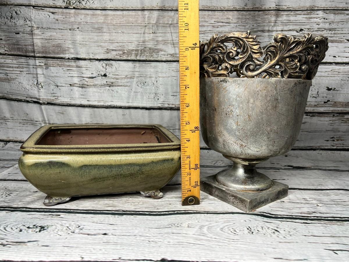 Pair of Home Decor Garden Ceramic Plastic Planter Pots, there is a chip to one of the planters, but there is no other significant damage and is in good useable condition. Check pictures for more details and for sizing.